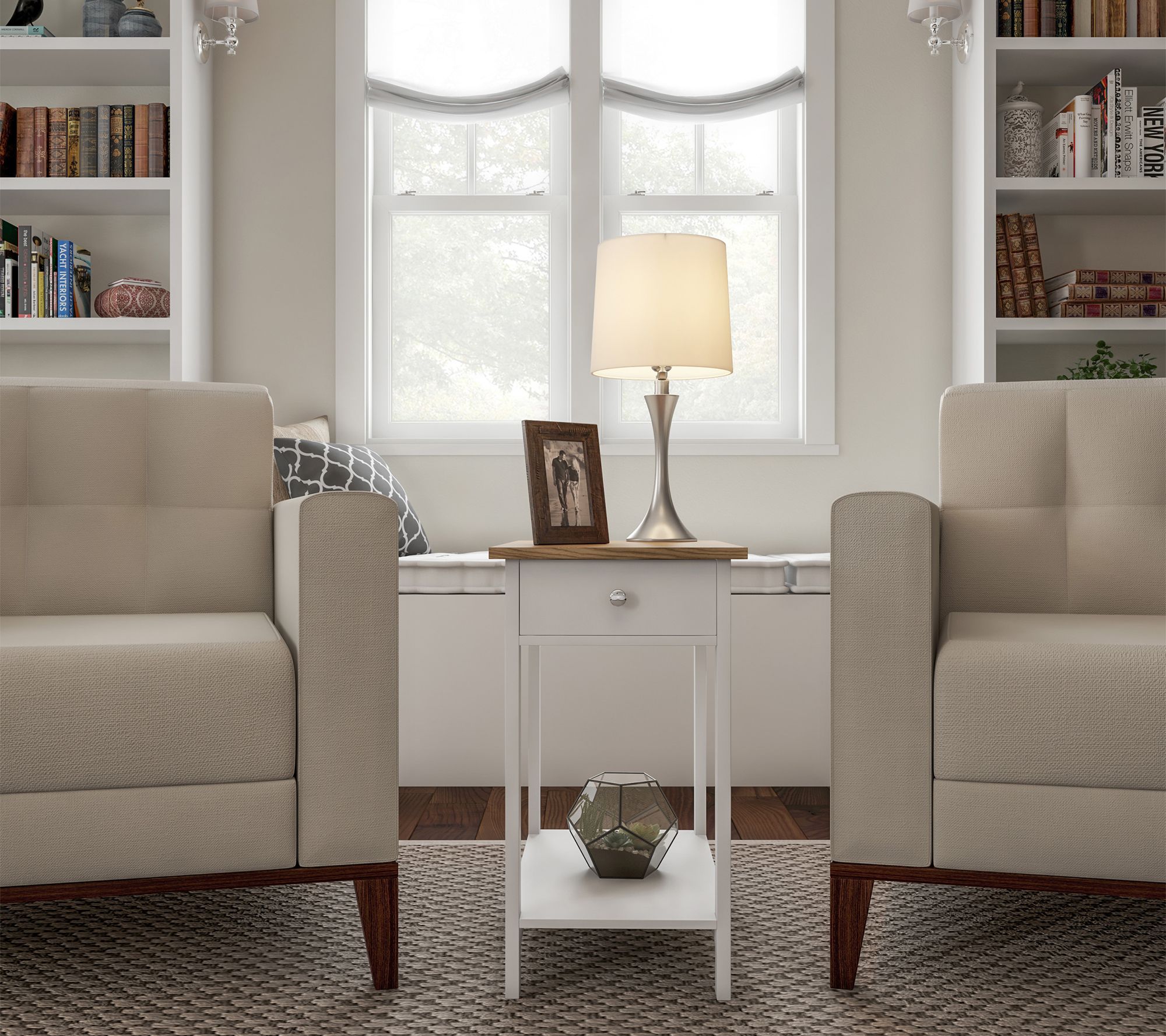 Designed especially for tight spaces, this narrow side table is a beautiful accent for your sofa or bed. It features a smooth top surface along with a sliding drawer and lower shelf for storage. From Lavish Home.