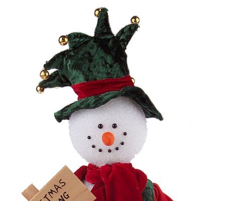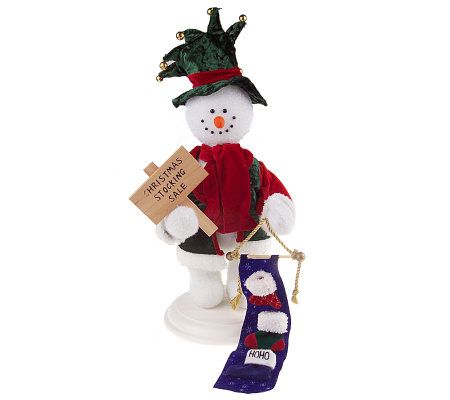 This ambitious snowman's head and arms move as he peddles his wares--three tiny Christmas stockings displayed on a fabric banner. In his other hand he holds a sign advertising his "Christmas Stocking Sale." Clad in a green and red plush fabric hat, red-sleeved green jacket, and red scarf, he's ready to delight one.