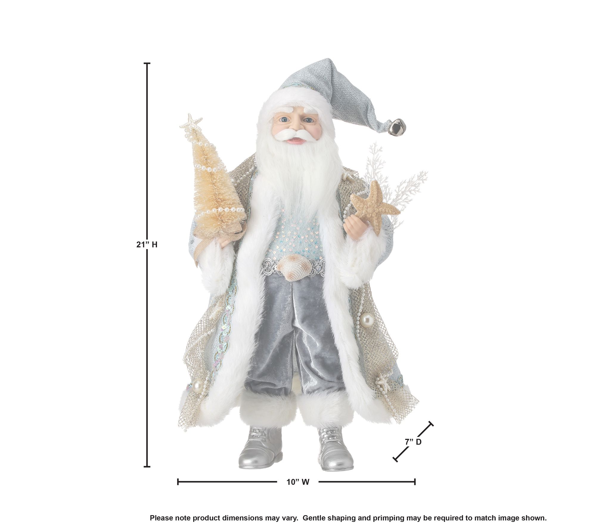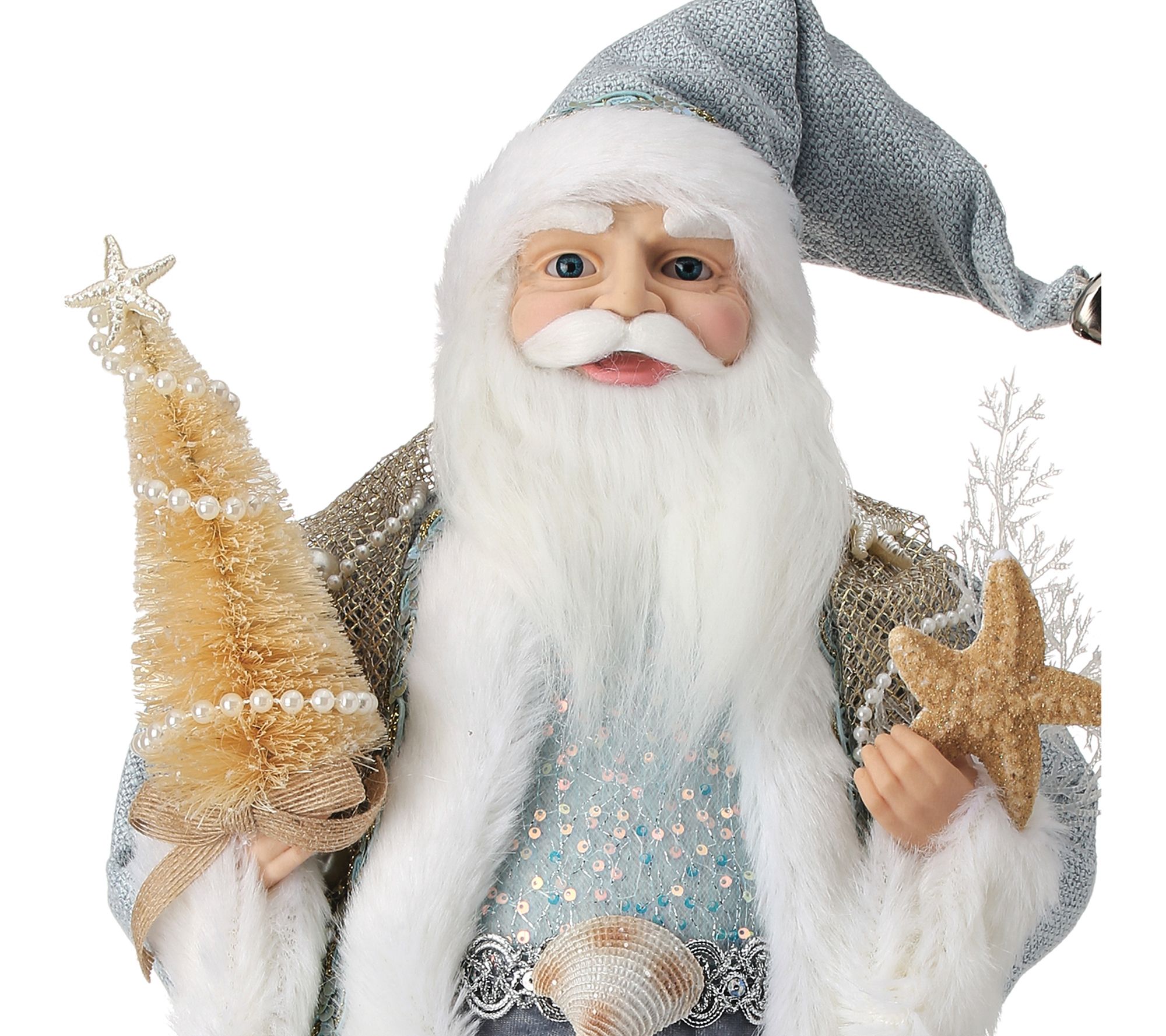 Bring coastal charm to your holiday decor with the 20" Fabric Ocean Santa with Shells by Valerie. This unique Santa figurine holds a bottle brush tree adorned with a simulated pearl garland in one hand and a coral spray with sea star in the other. Dressed in coastal hues with intricate fabric detailing and genuine shells, this Santa embodies the spirit of the ocean. From the Valerie Parr Hill Collection.