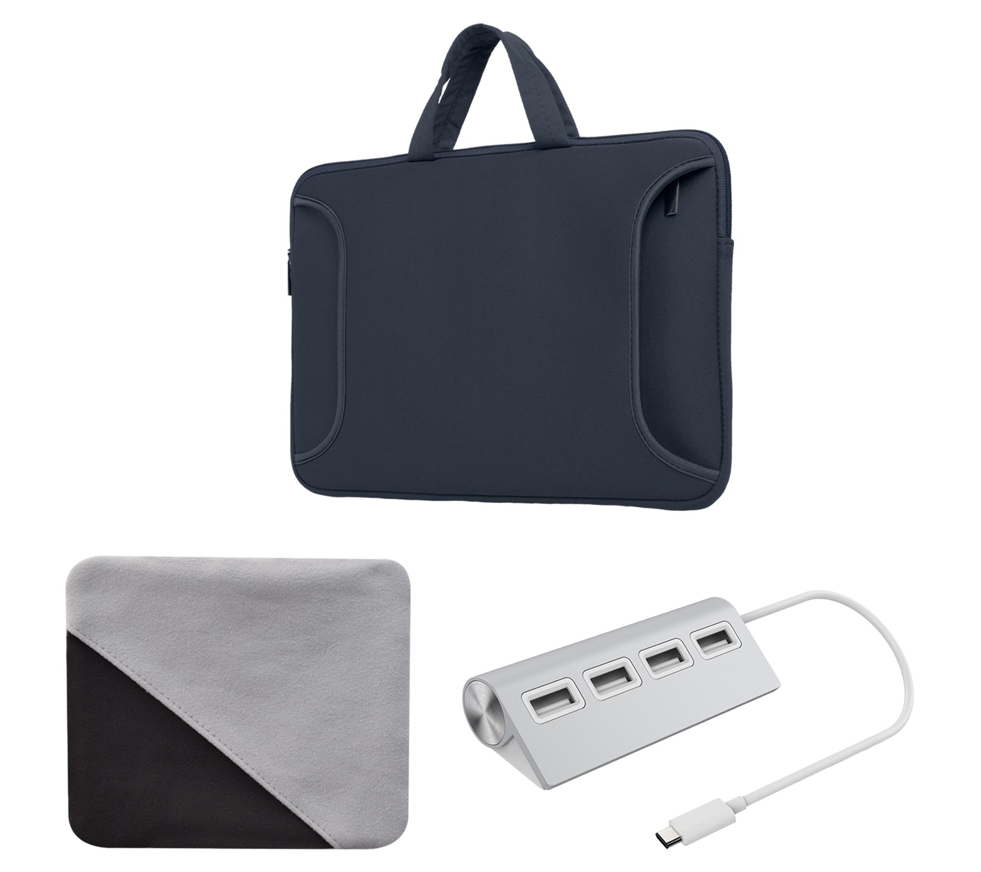 Includes MacBook Air with USB-C power adapter and charging cable, carry case, cleaning cloth, and four-port USB-C hub