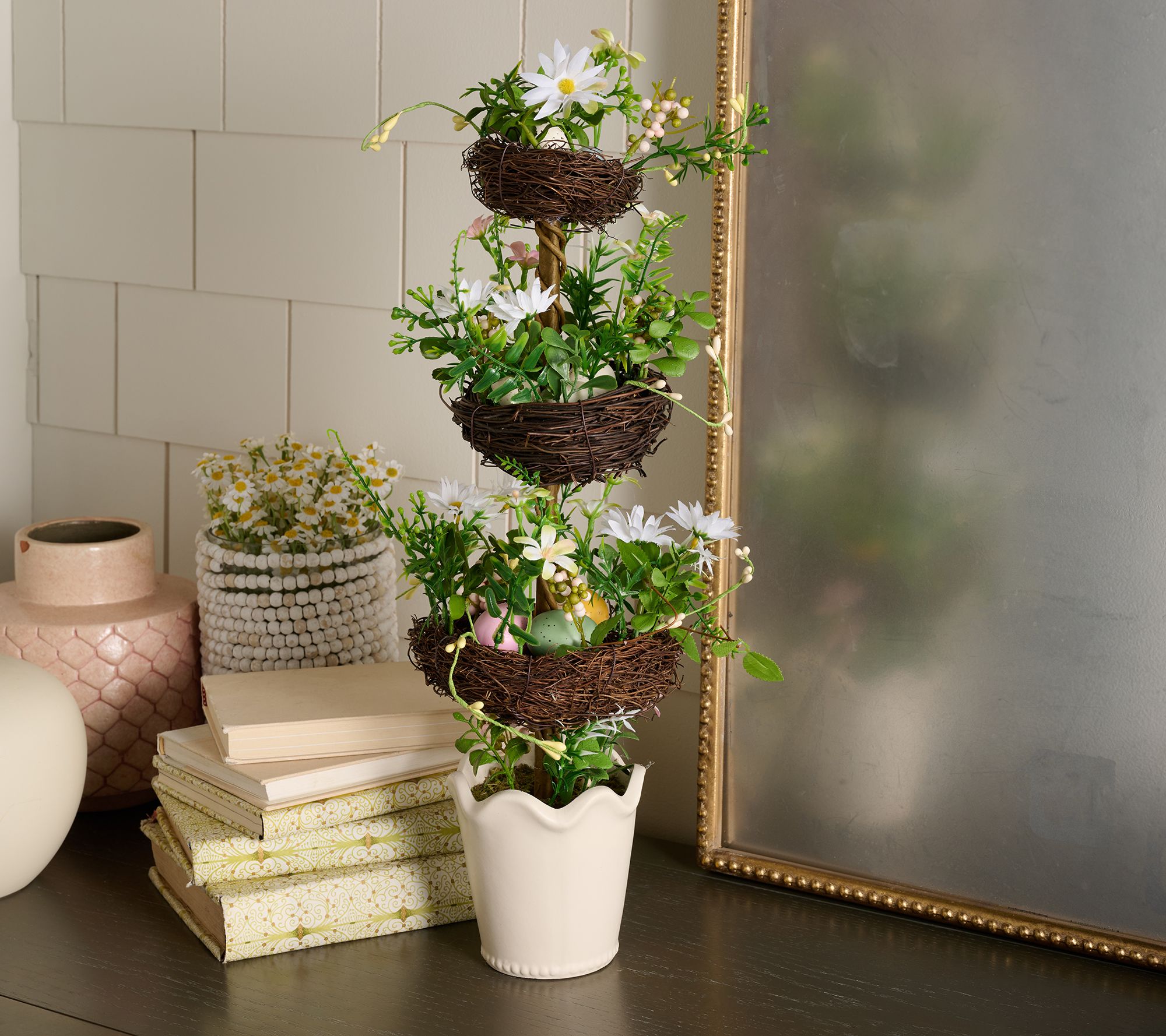Welcome spring into your home with this egg and nest topiary, artfully arranged with three grapevine nests brimming with faux eggs, berries, and greenery. Its cheerful daisy details and white ceramic pot offer a fresh pop of seasonal color -- just right for brightening up a side table or entryway display. From the Valerie Parr Hill Collection.
