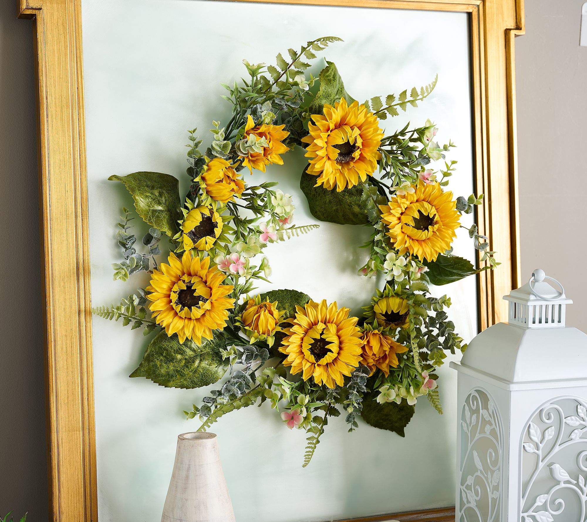 Give your home a mood makeover with the addition of this warm and welcoming sunflower wreath. The bright yellow color and sun-like appearance of these faux flowers create a cheerful ambience that family and friends are sure to notice. From the Valerie Parr Hill Collection.