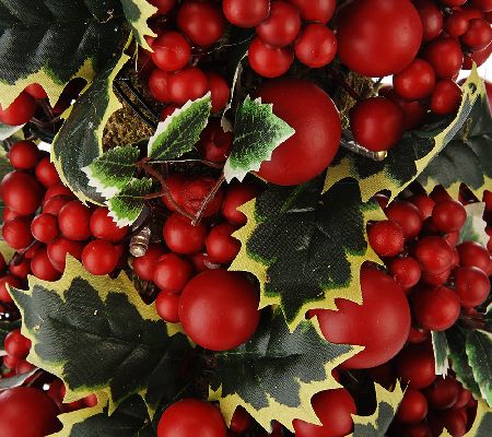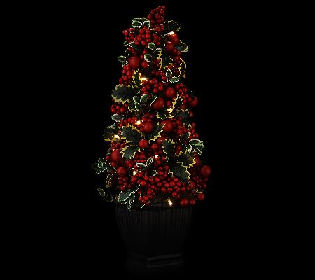 The holly and the ivy. Lifelike red berries of various sizes burst forth among the variegated ivy leaves of this gorgeous potted tree. Battery-operated, it glows with warm white lights for even more festive impact. From the Valerie Parr Hill Collection.