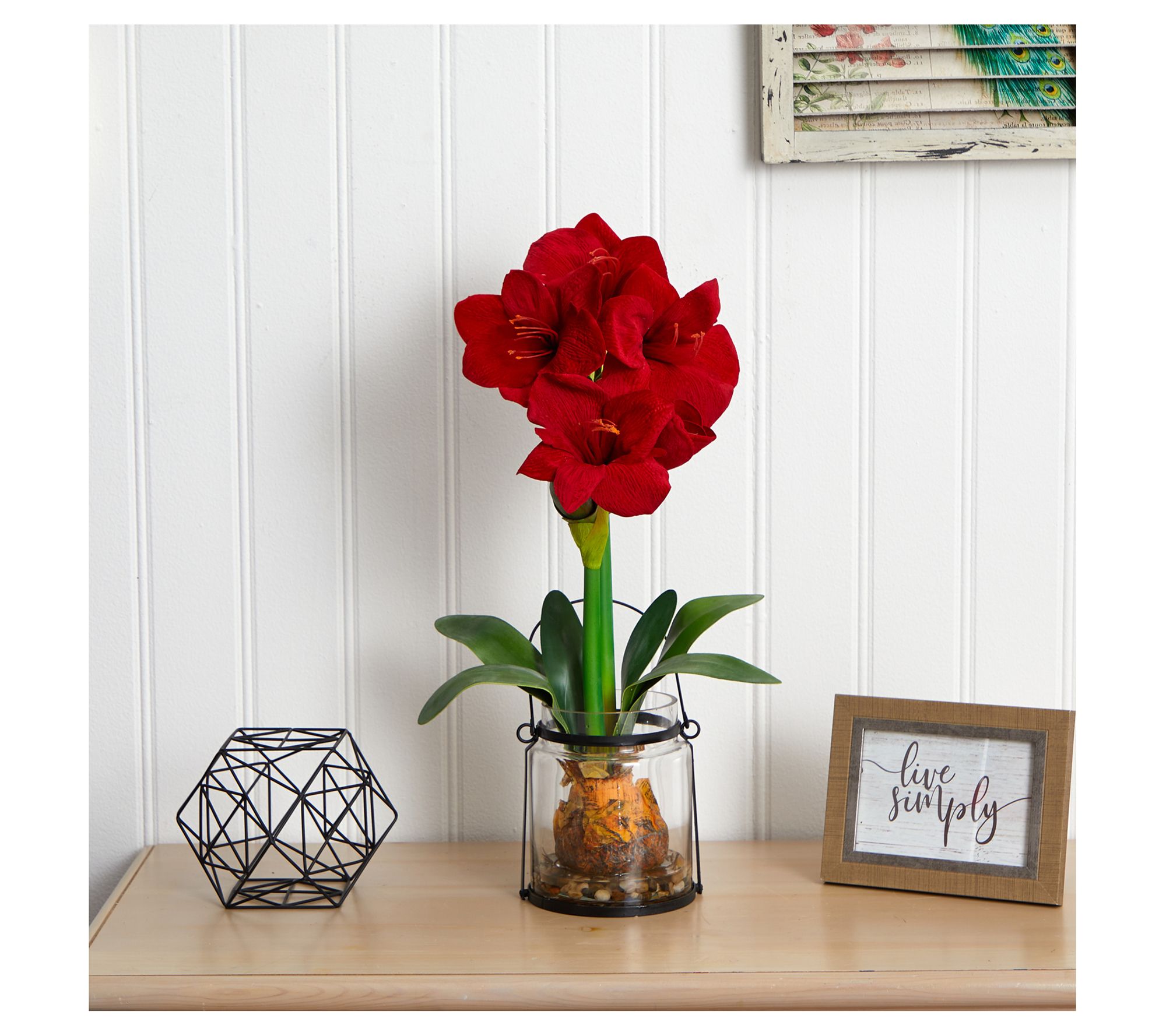 Bursting with several lush blooms, this lifelike amaryllis--complete with cascading leaves--is situated in a lovely, glass vase, making it a pretty addition to your decor. From Nearly Natural.