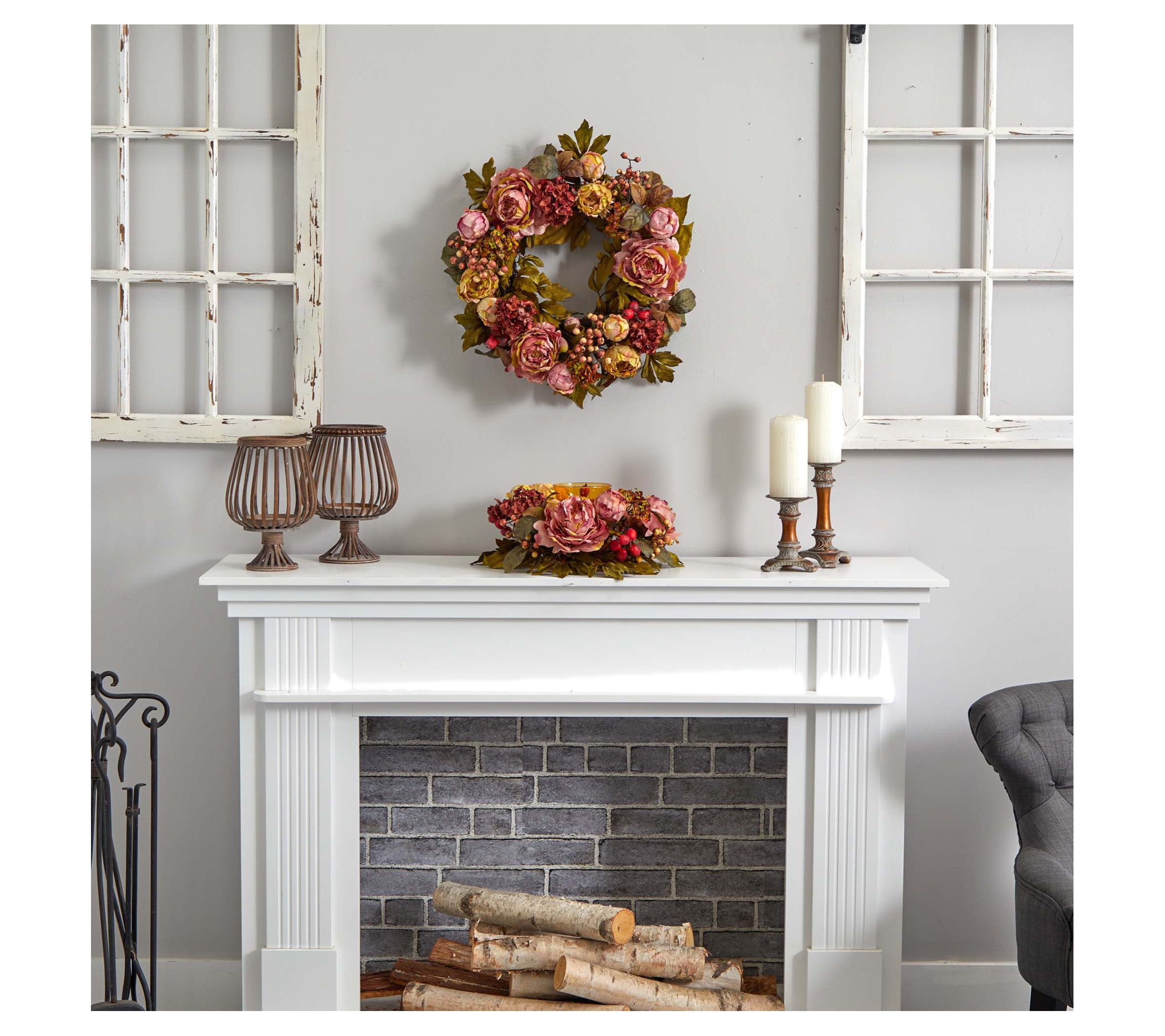 An earthy assortment of peonies and hydrangeas intertwined with berries and green foliage give this lifelike wreath a stately style. From Nearly Natural.