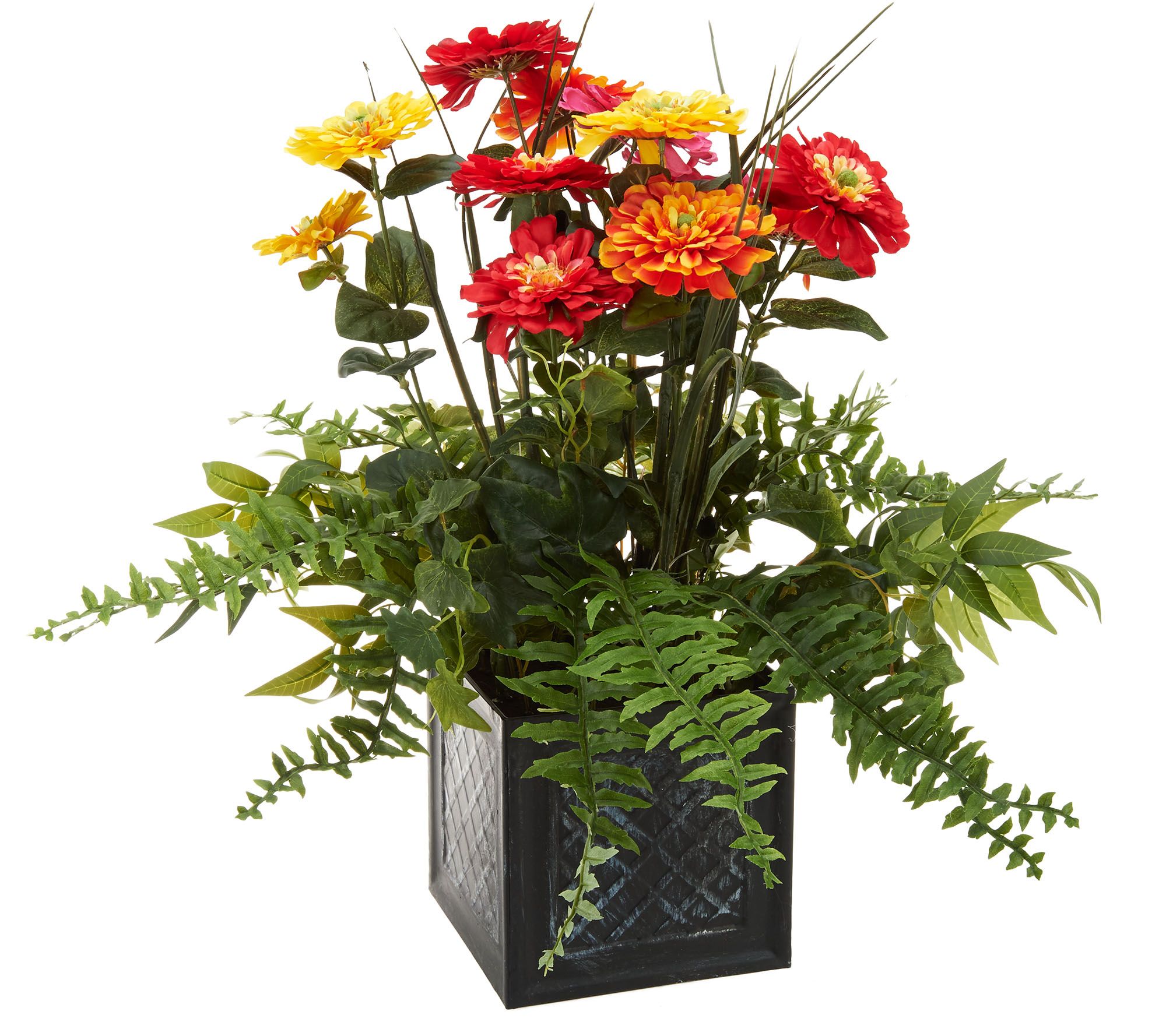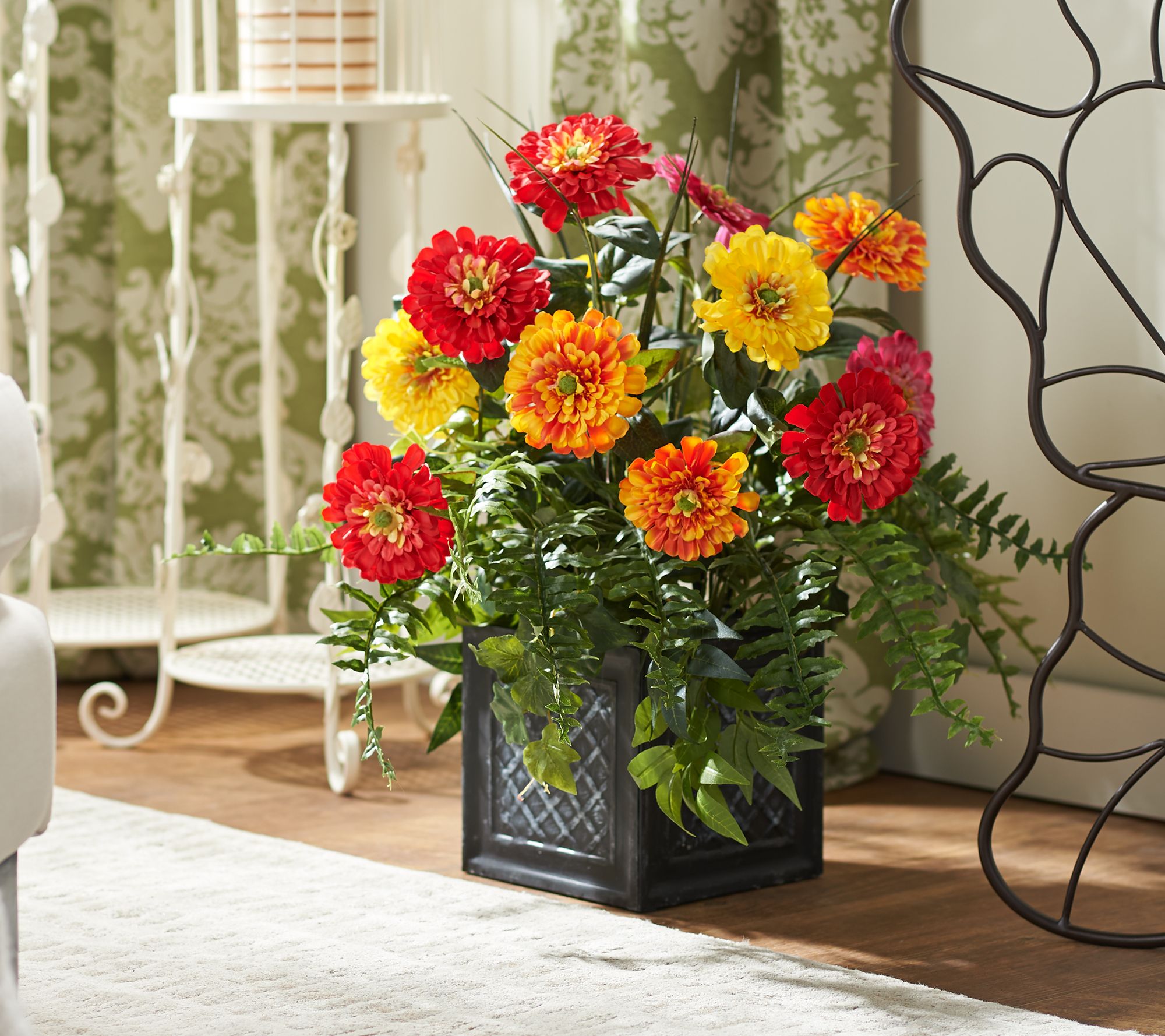 • Includes black metal planter with lifelike zinnia blossoms in pink, yellow, coral and burgundy