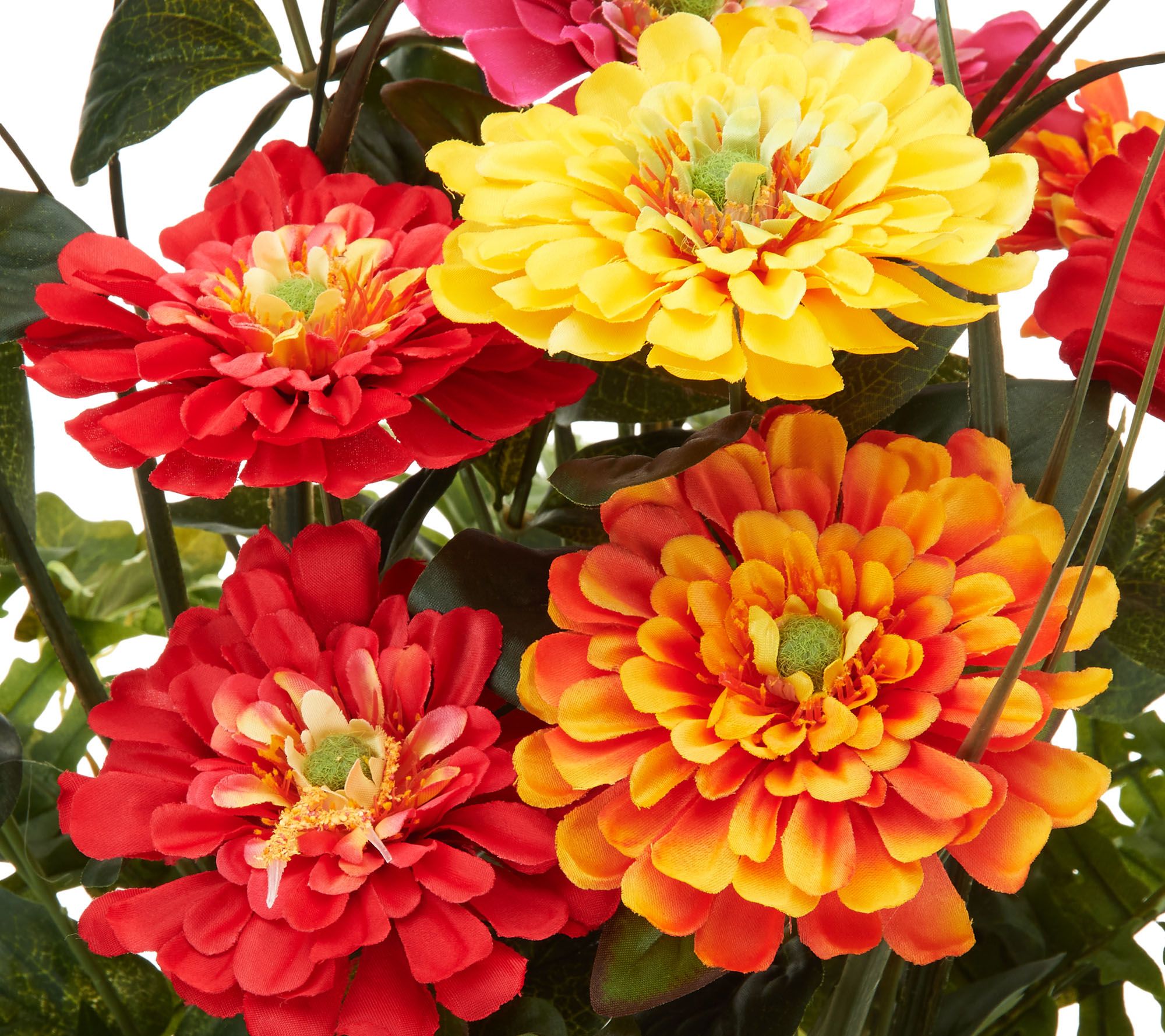 Bring a touch of the outdoors into your home with this lovely planter featuring colorful and vibrant lifelike zinnia blossoms, ferns, and green leaves. From The Valerie Parr Hill Collection.