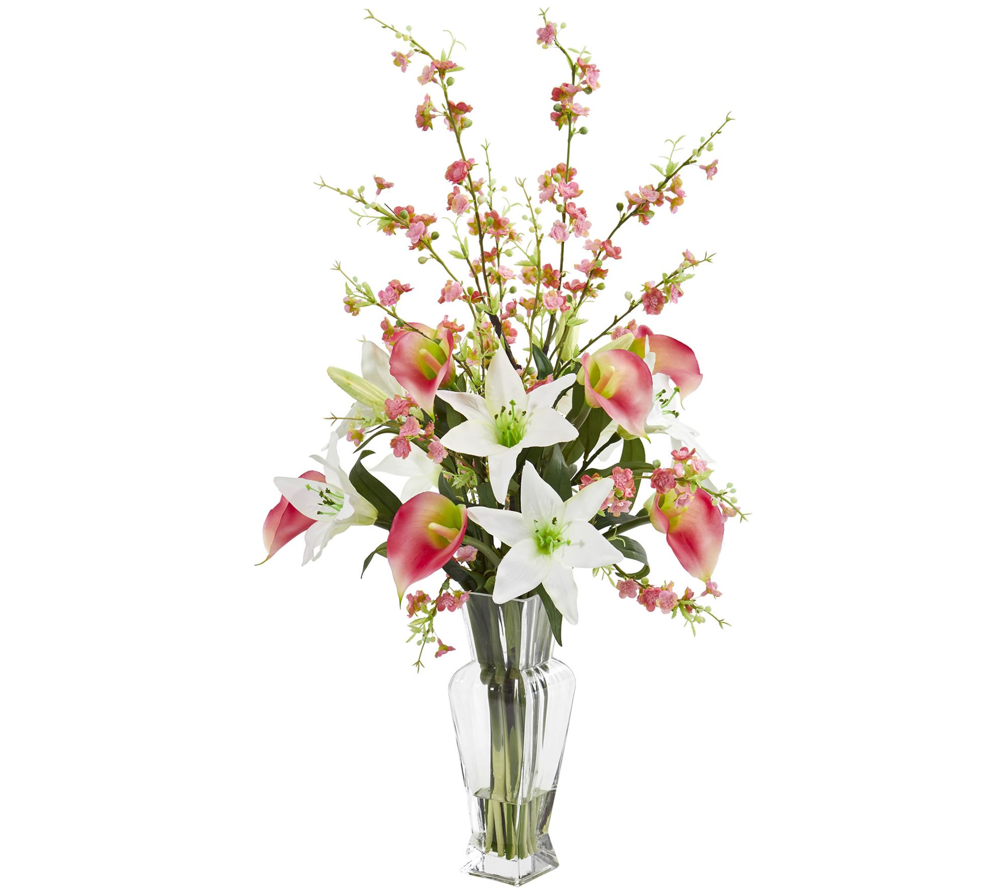 • Lifelike cala lily and cherry blossom arrangement in clear glass vase