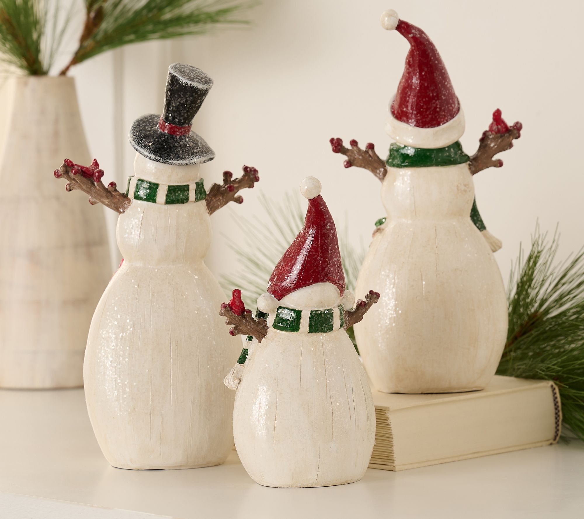 Family rooms and mantels come alive with charm when this trio of cheerful snowmen gathers together, each decked out in cozy hats and scarves and proudly cradling a bright red cardinal. Soft shimmer from delicate glitter catches the light, while embossed cardinal branches bring the magic of wintertime indoors. Display all three for a heartwarming scene that welcomes the holidays home. From the Valerie Parr Hill Collection.