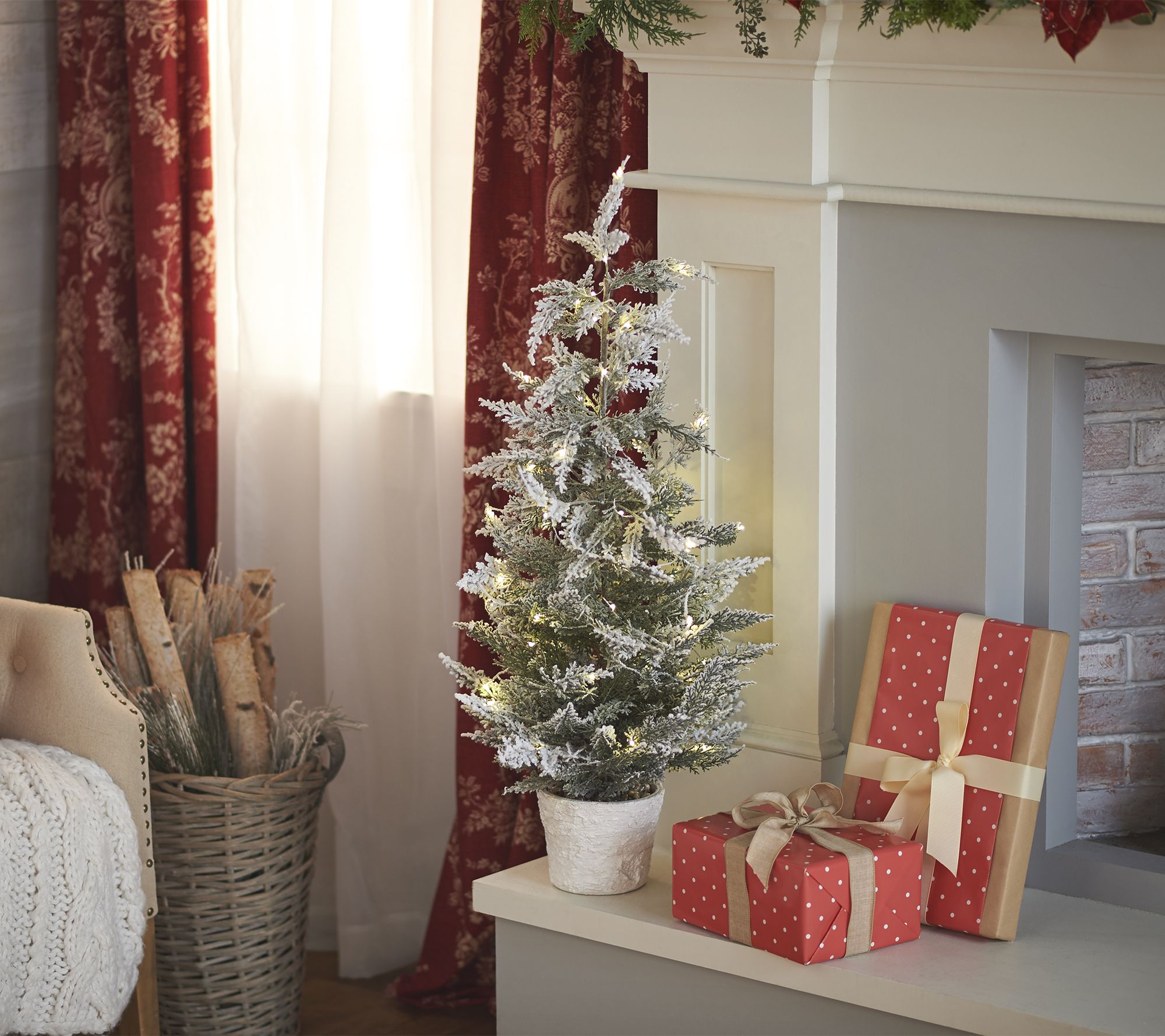 • Includes lifelike flocked pine tree in round, white pot with river rock
