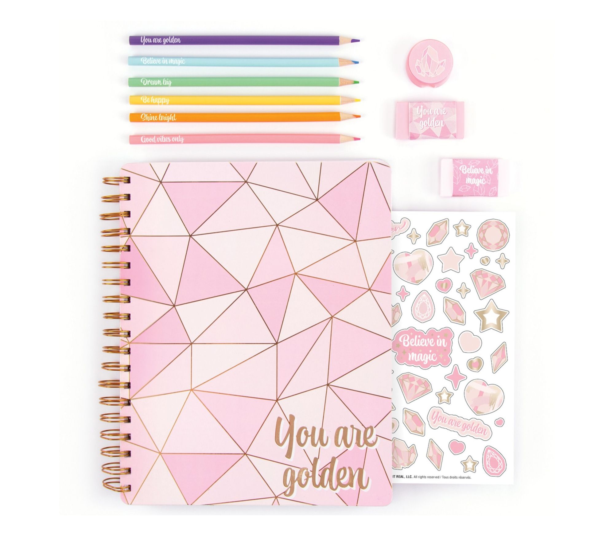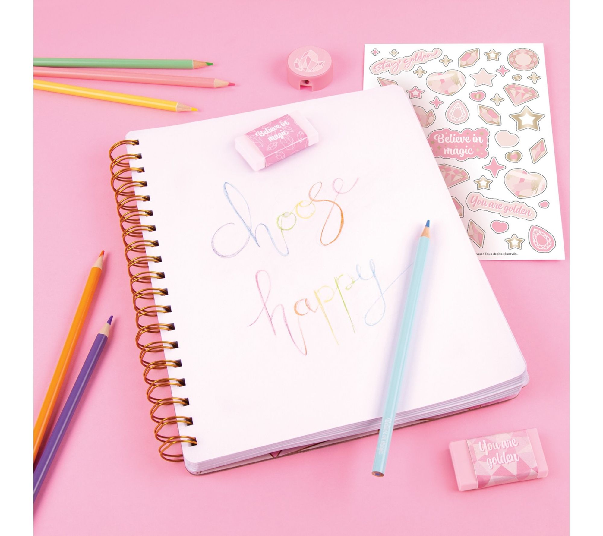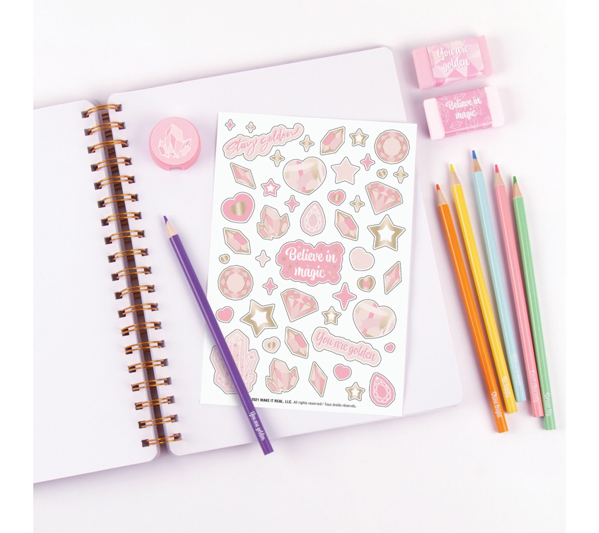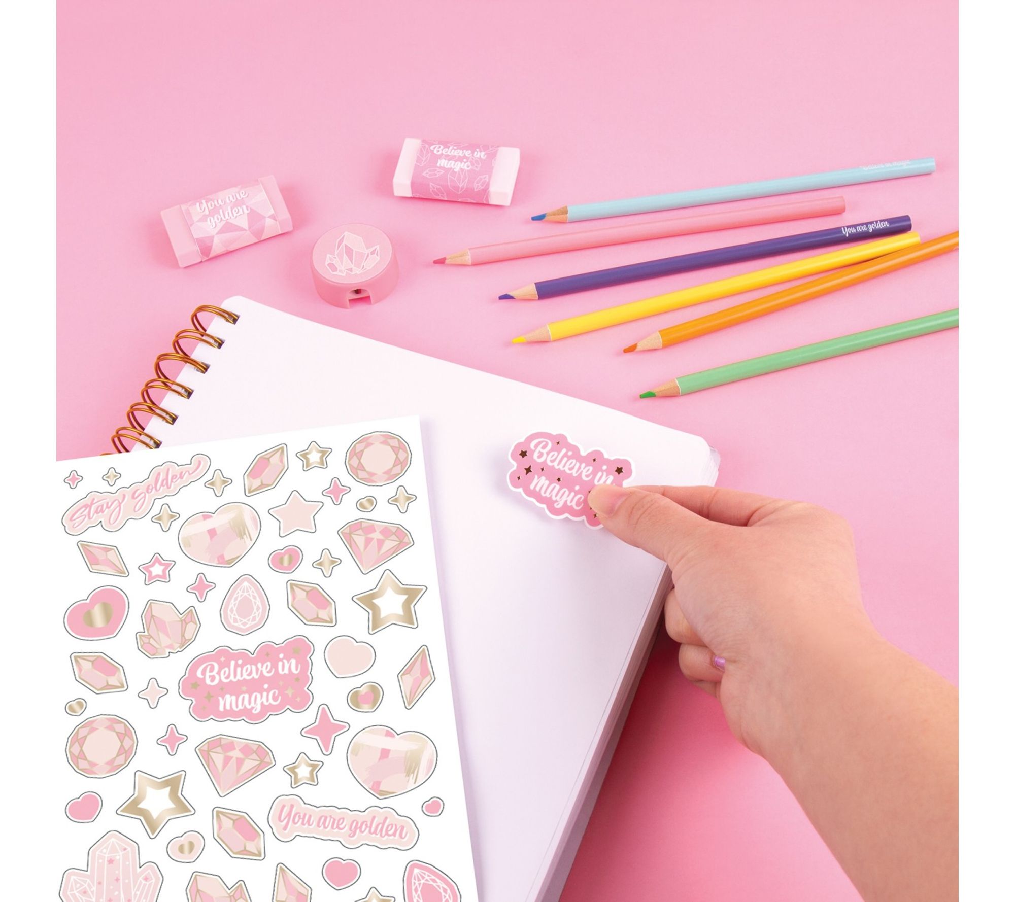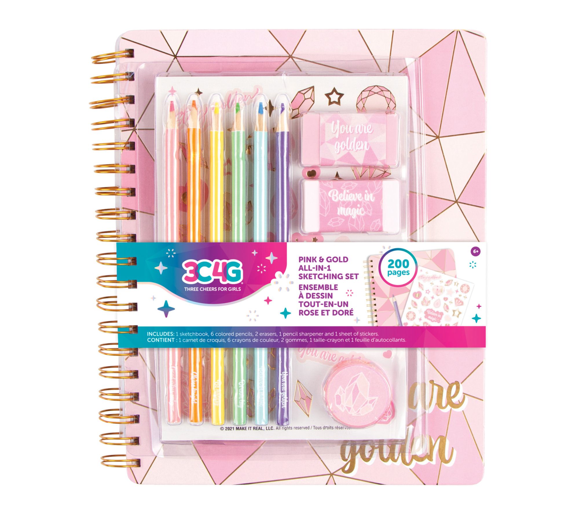Unleash a world of imaginative possibilities with this arts and crafts sketching set, featuring highly pigmented colored pencils, a full-sized sketchbook, and foiled stickers in stylish pink and gold hues. Ideal for school, creative play, or travel, it inspires self-expression and adds a touch of sparkle to drawings and everyday items alike. From 3C4G.