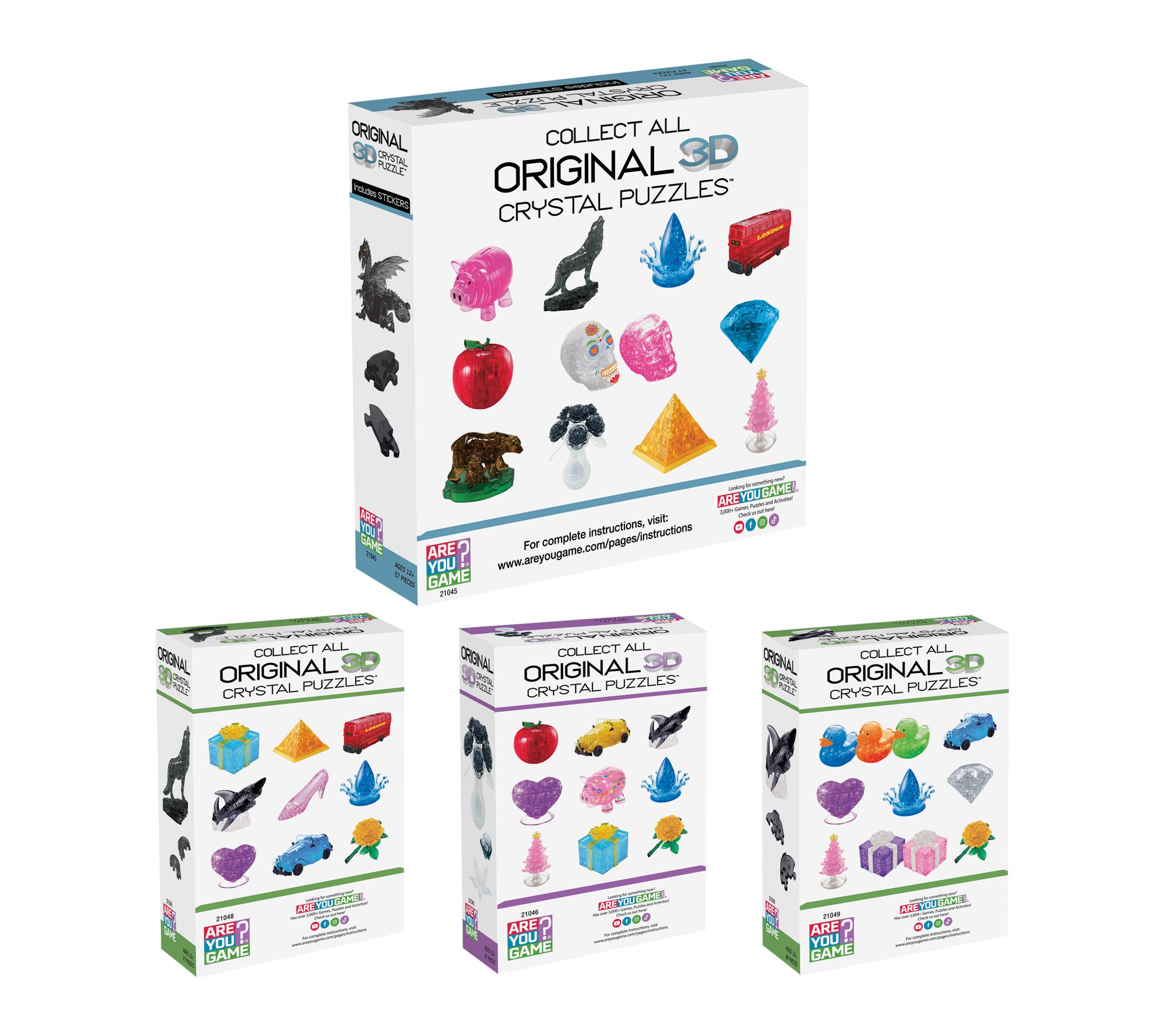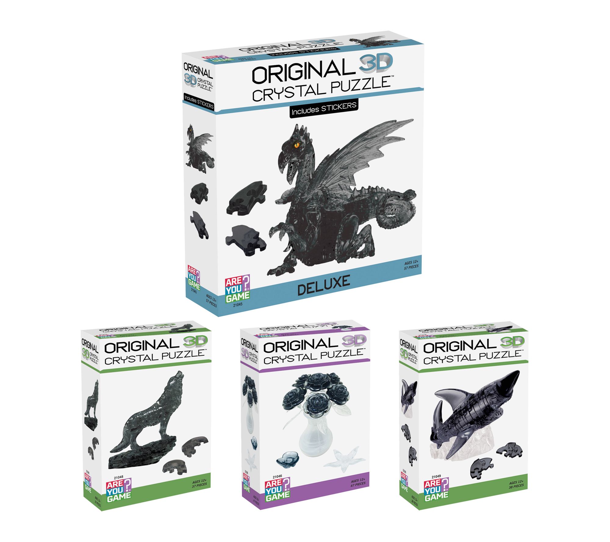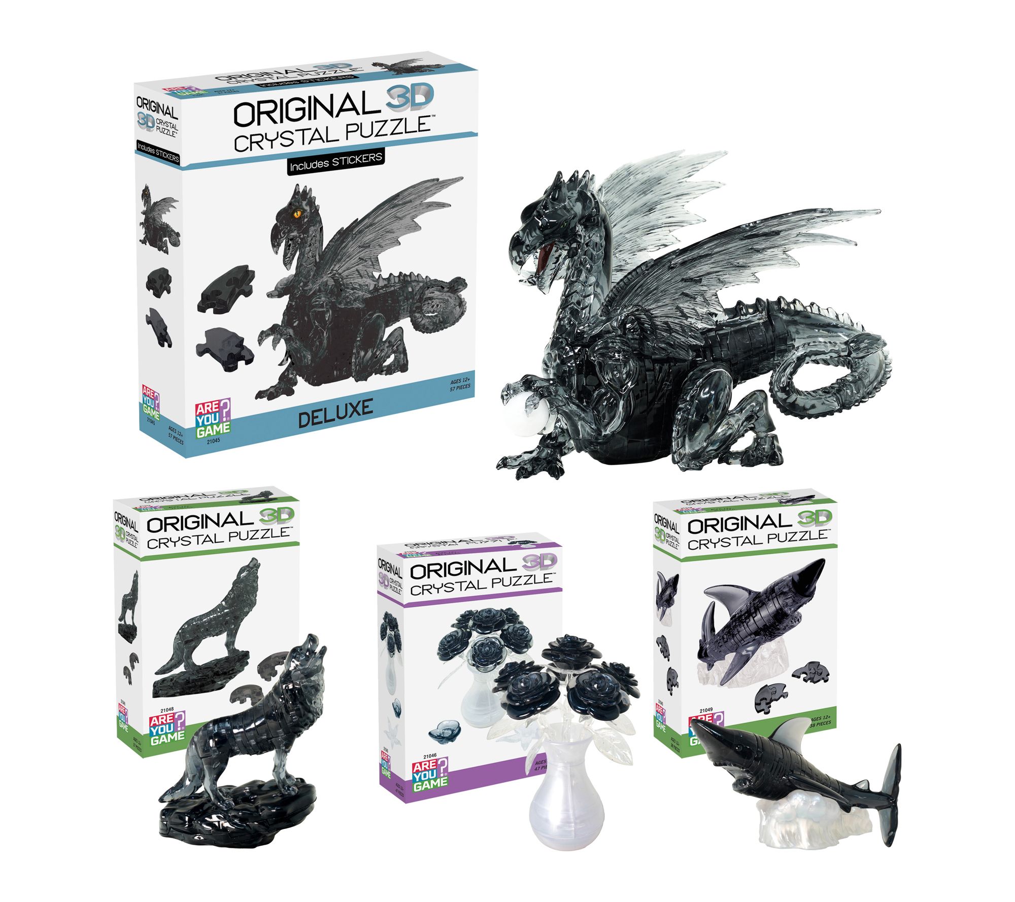 Includes Black Roses in a Vase 47 crystal puzzle pieces and instructions, Black Wolf 37 crystal puzzle pieces and instructions, Black Dragon 57 crystal puzzle pieces, 1 sticker sheet and instructions, Black Shark 38 crystal puzzle pieces and instructions