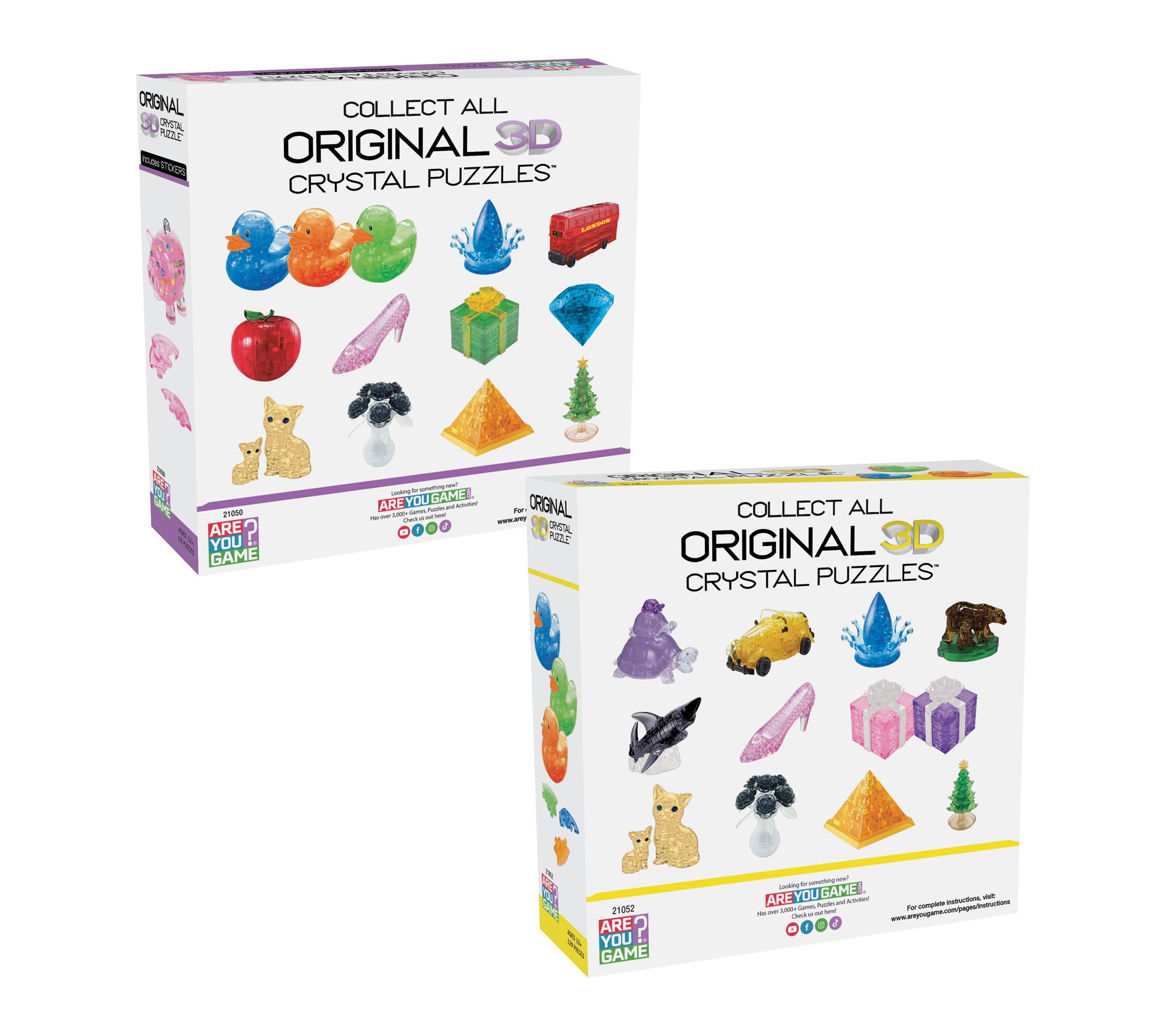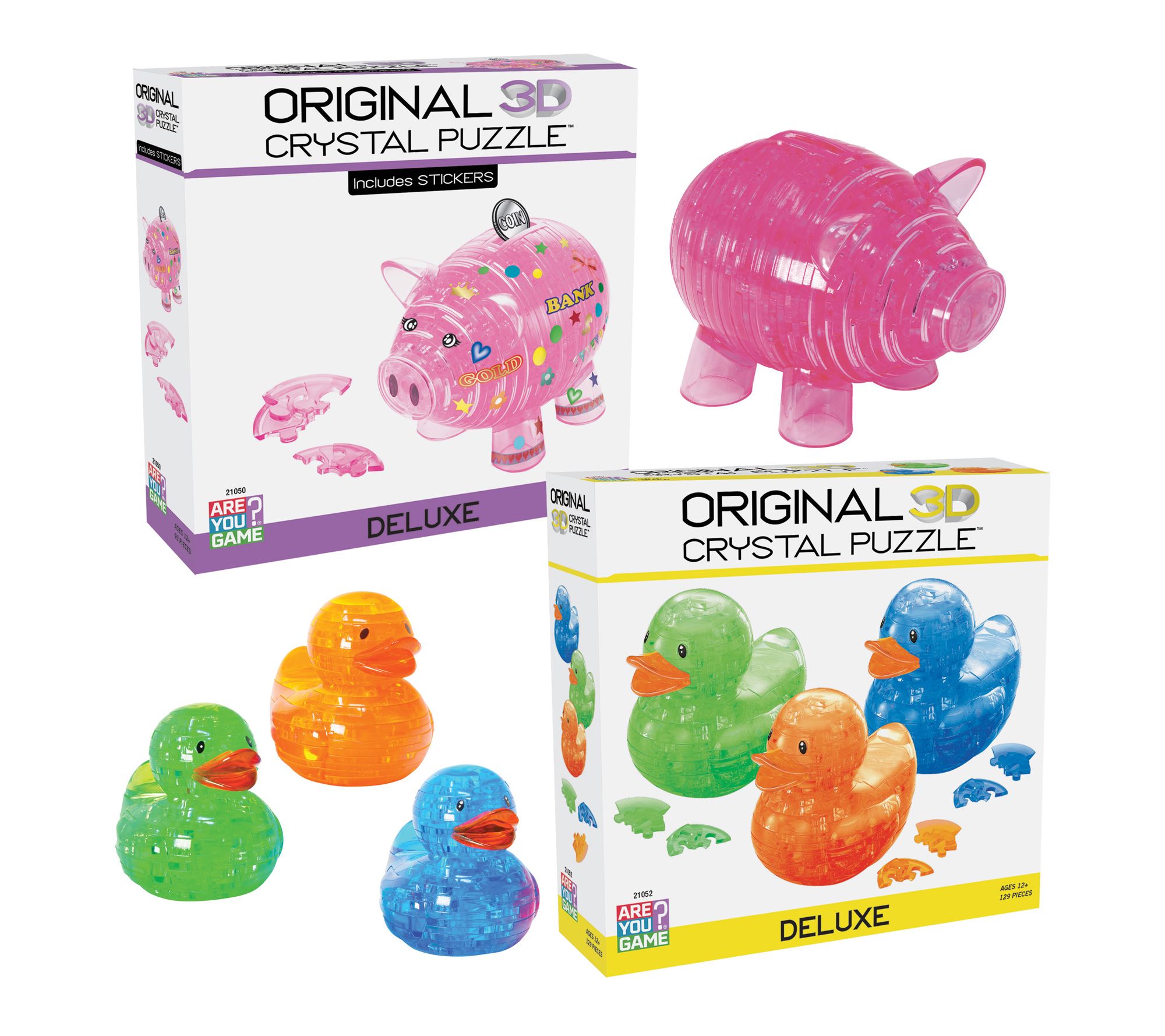 • Includes 93 crystal puzzle pieces, sticker sheet, and instructions for piggy bank; 129 crystal puzzle pieces, sticker sheet, and instructions for three rubber ducks