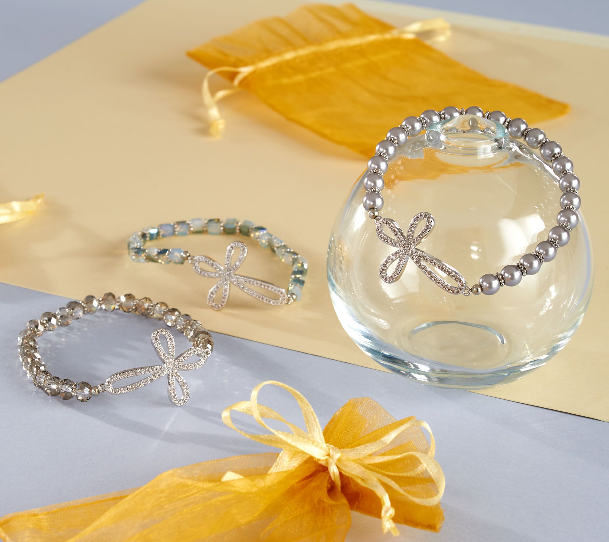 One bracelet of simulated pearls, one with faceted round beads, and one with faceted square beads; silvertone cross with ribbon design and glass crystals on each one
