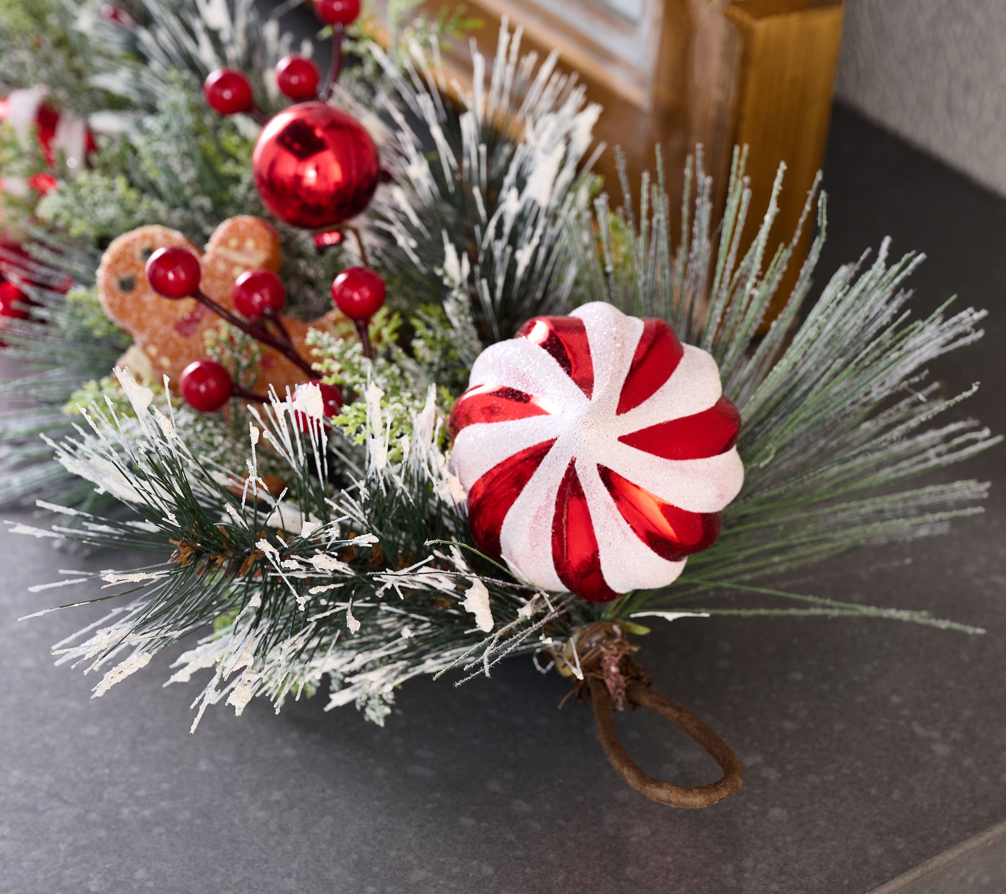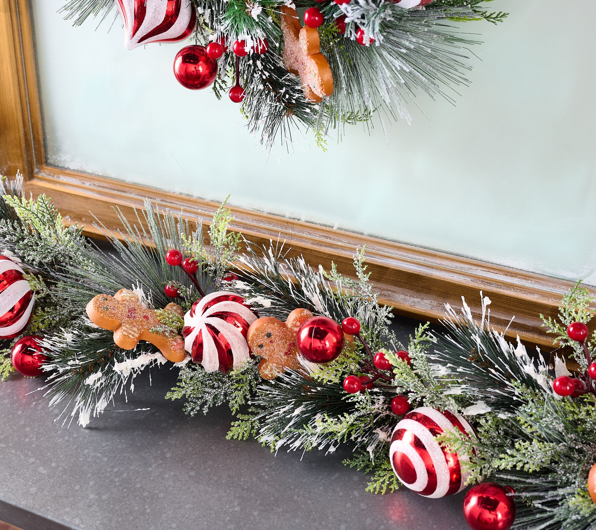 Add a touch of whimsy to your holiday decor with the 4' gingerbread & peppermint ornament garland by Valerie. Featuring a delightful mix of faux pine branches, red and white striped ornaments, gingerbread cookies, and red berries, this garland brings festive cheer to any space. Perfect for indoor decorative use, it comes with a loop for easy hanging.