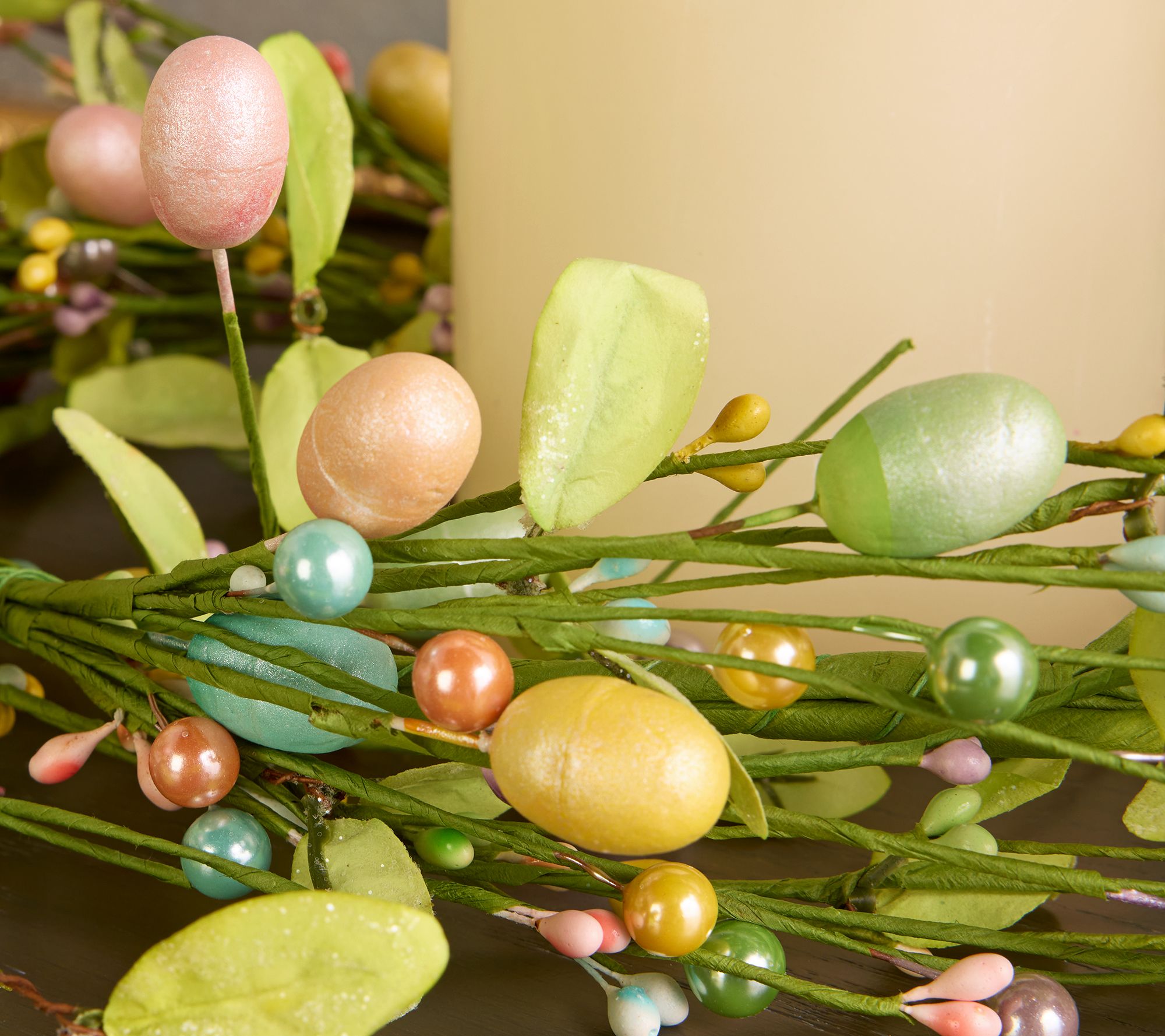 Bring a touch of springtime cheer to your home with this delightful egg and leaf garland. Overflowing with pastel eggs and lush green leaves, it adds a charming, whimsical vibe to your dining table or mantel. From the Valerie Parr Hill Collection.