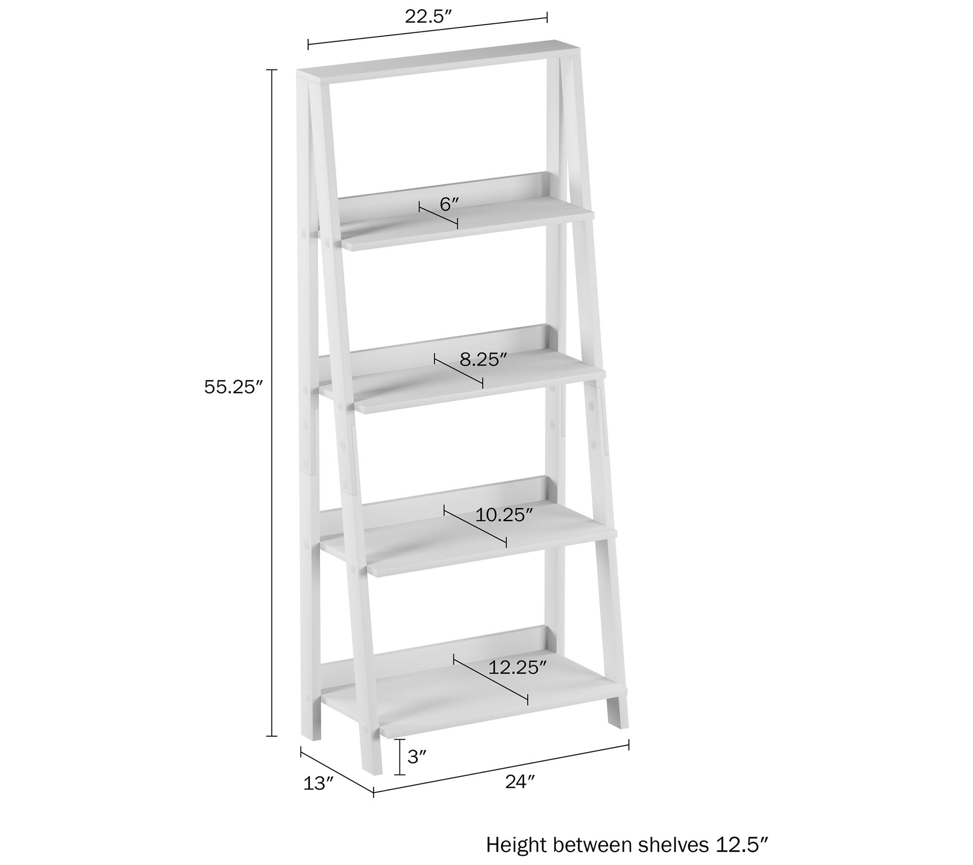 • Approximate measurements: Bookshelf 55.25"H x 24"L x 13"W; Shelves 22.5"L; Distance between shelves 12.5"