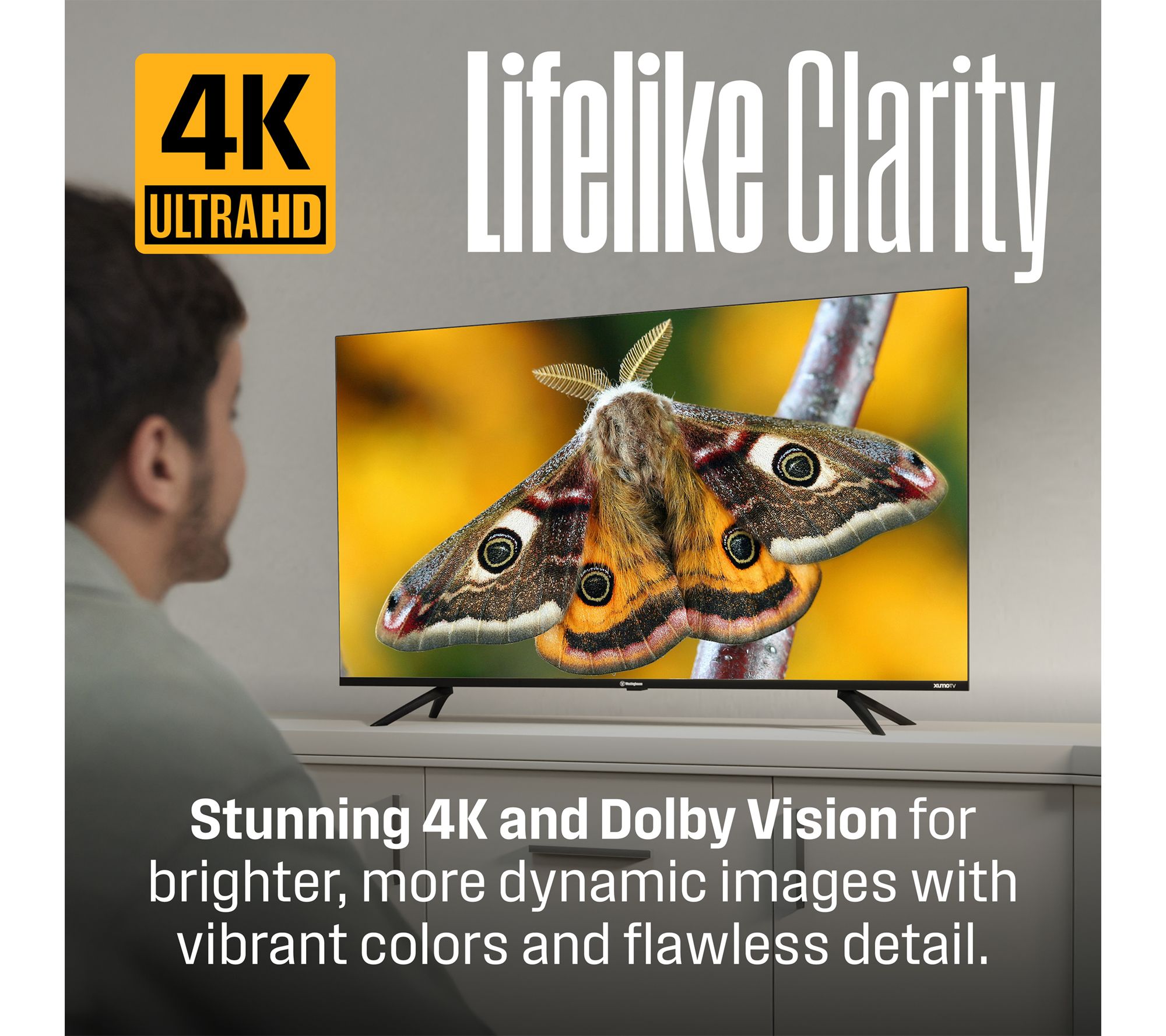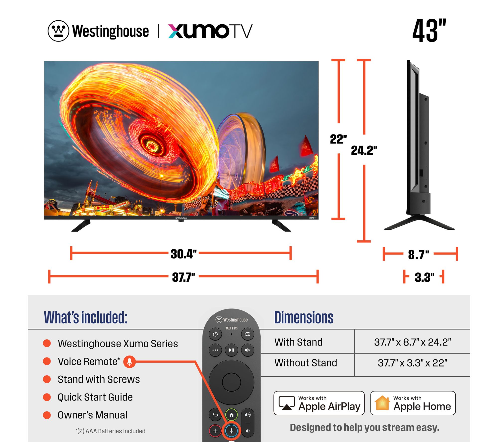 Transform movie nights and game days with the 43" Smart 4K UHD LED TV, where vivid picture quality and immersive sound bring your favorite entertainment to life. Catch every detail in action scenes and sports, stream the latest shows, or mirror your content with ease thanks to built-in Apple AirPlay and versatile connectivity. Seamless voice search and integrated streaming apps make finding your next binge-watch effortless. From XUMO.