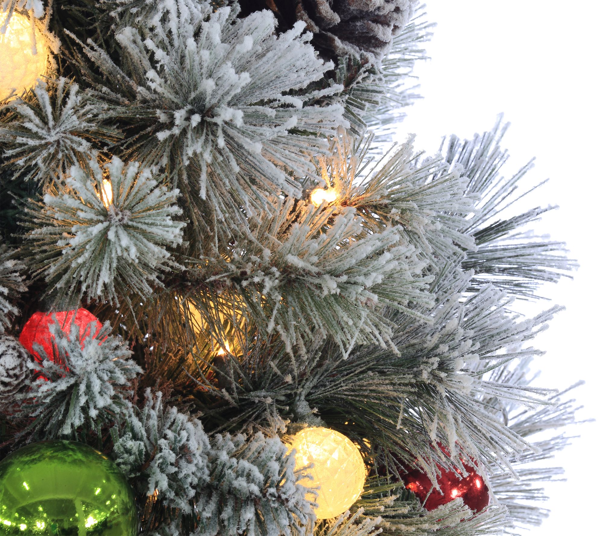 Are you ready for Santa? You will be with this pre-decorated Christmas tree. This authentic looking pine is lightly flocked, giving the appearance of freshly fallen snow in your home. It features 100 clear incandescent lights intermingled with red and white colored glass bulbs. The finishing touch is the shatterproof ornaments. Now, all you need is a visit from the big man! From Gerson.