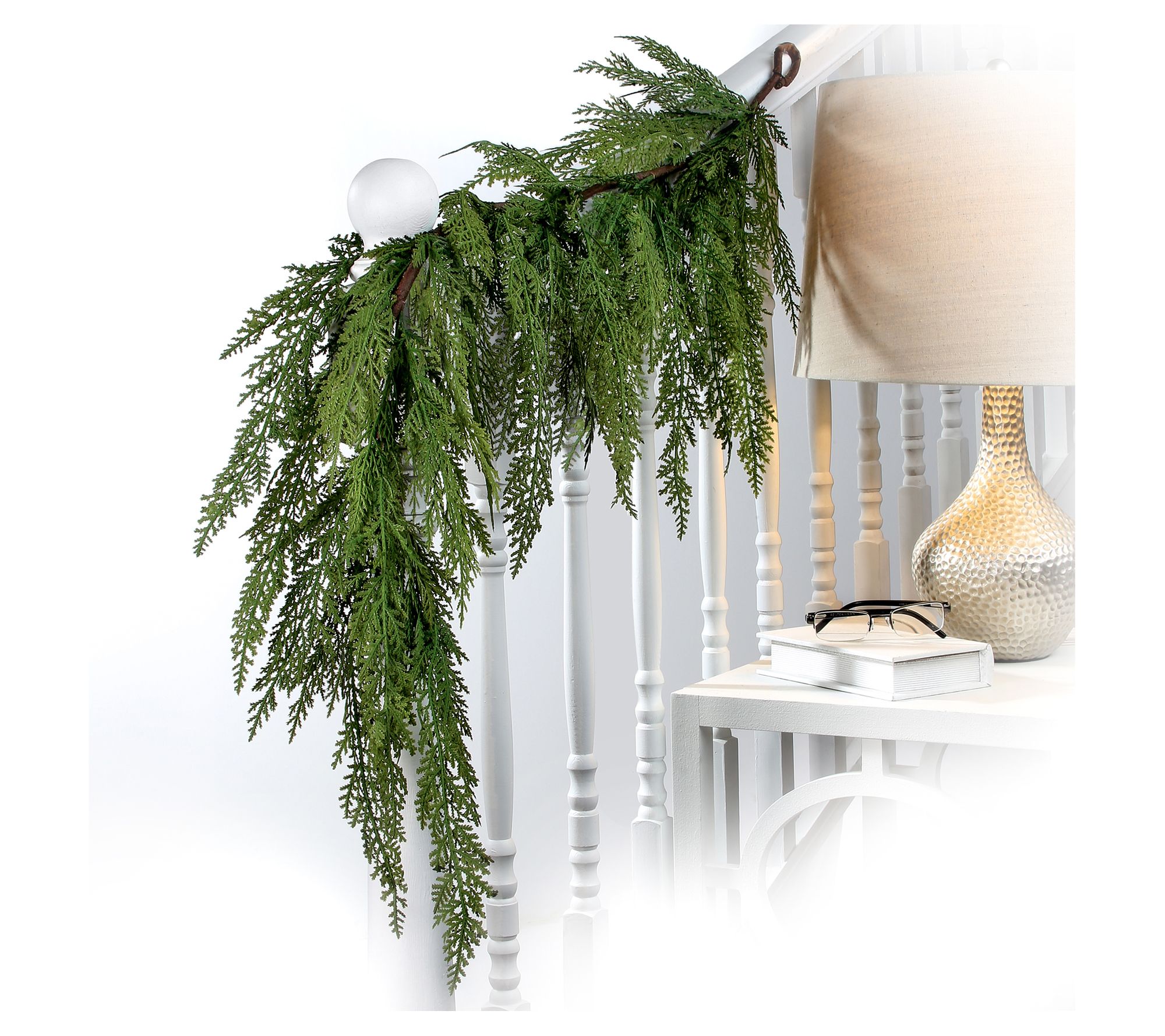 Bring the spirit of the holidays into your home with this faux Lebanon cedar garland. This lifelike piece, crafted from real-touch plastic in natural green hues, is perfect for adding a festive touch to a stairway, banister, or mantel. With a handy hanging loop, setting up your holiday display has never been easier or more beautiful. From the Valerie Parr Hill Collection.
