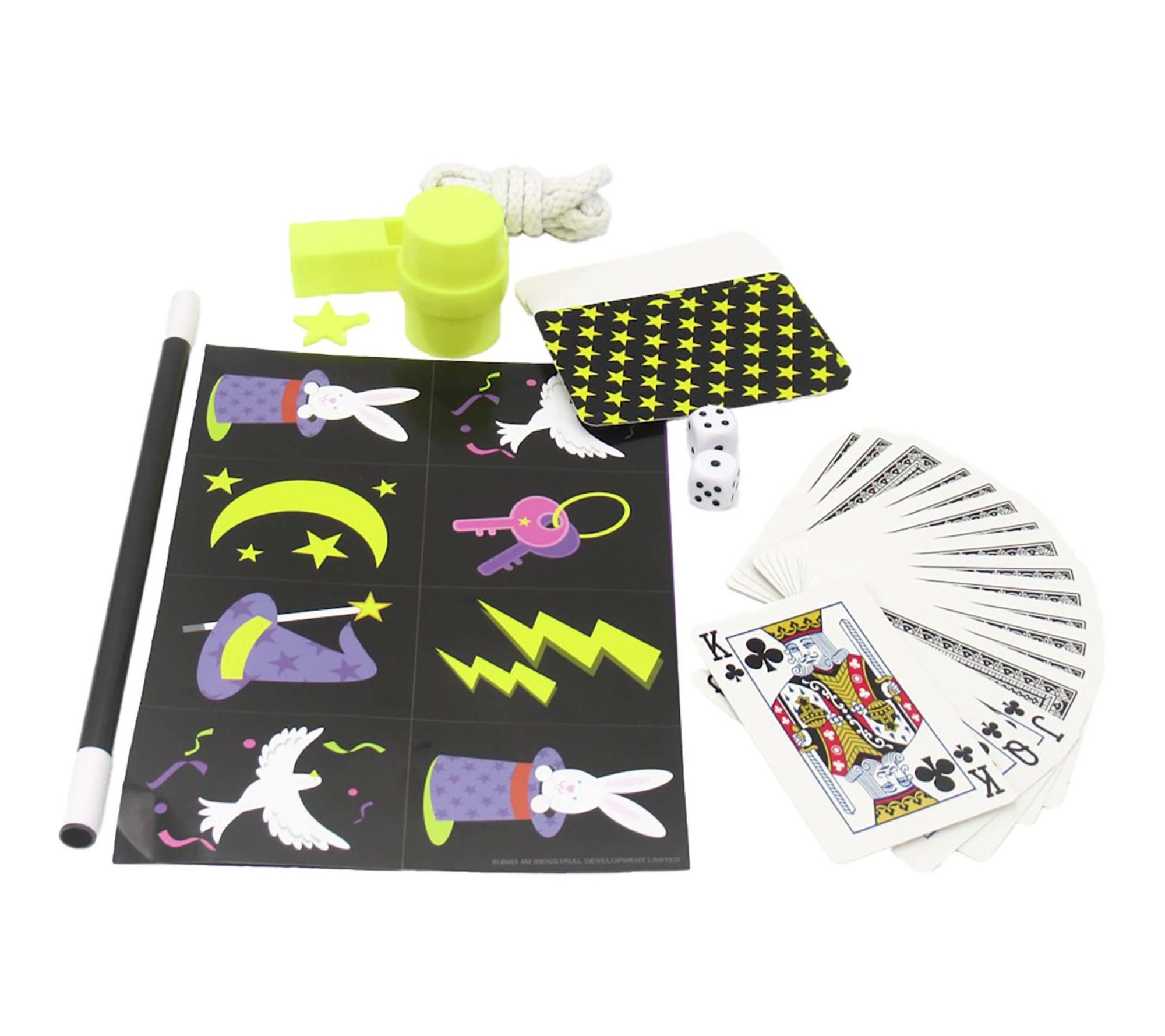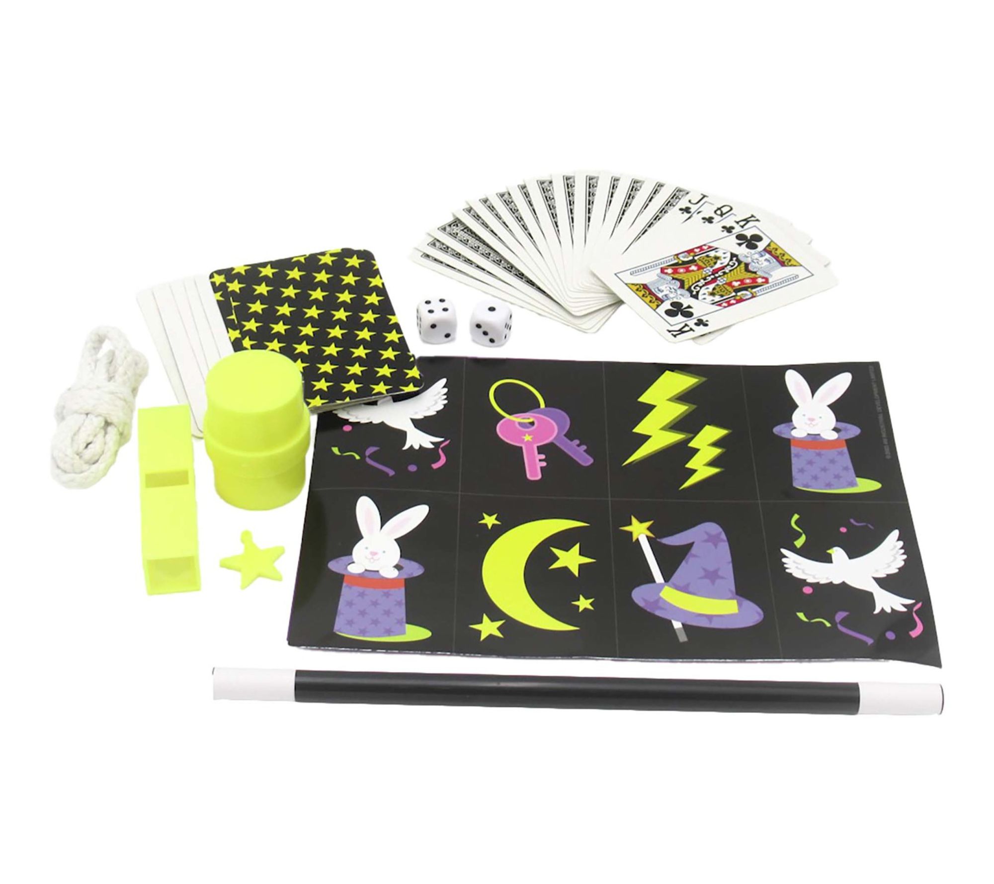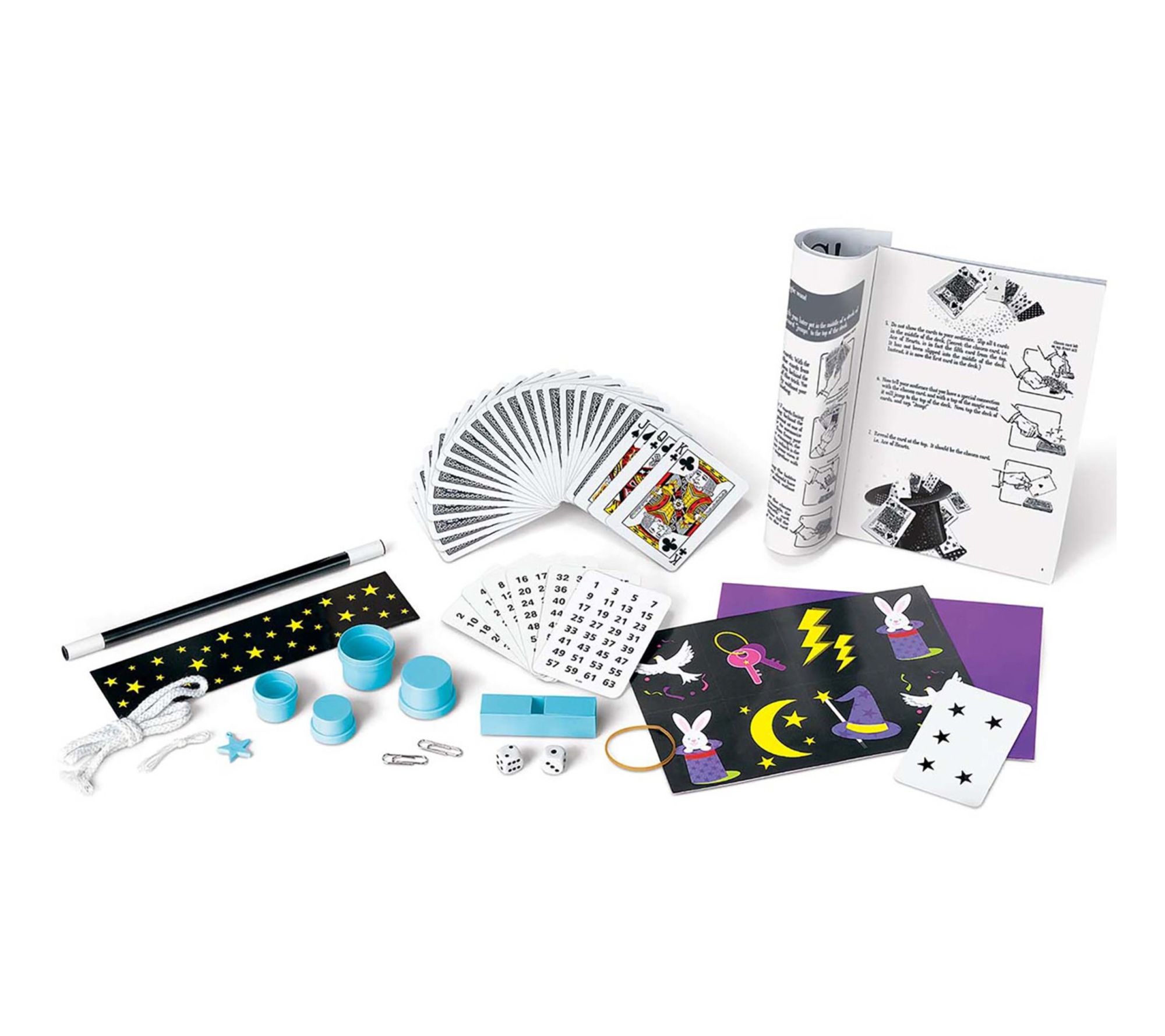 • Includes one magic wand, one deck of playing cards, one magic playing card, one large rope, one small rope, six mystic number cards, two dice, two paper clips, one rubber band, one purple paper, one star sheet, one bunny sheet, six magic accessories, and one instruction booklet