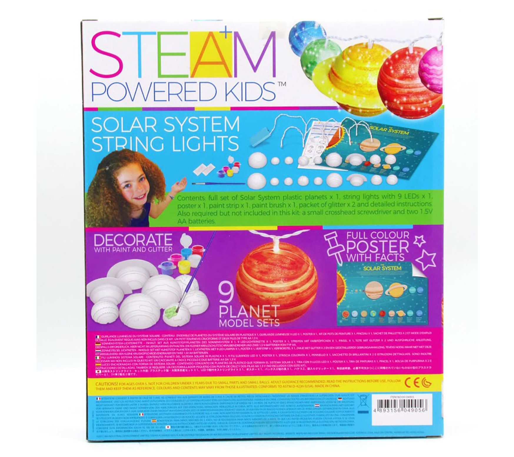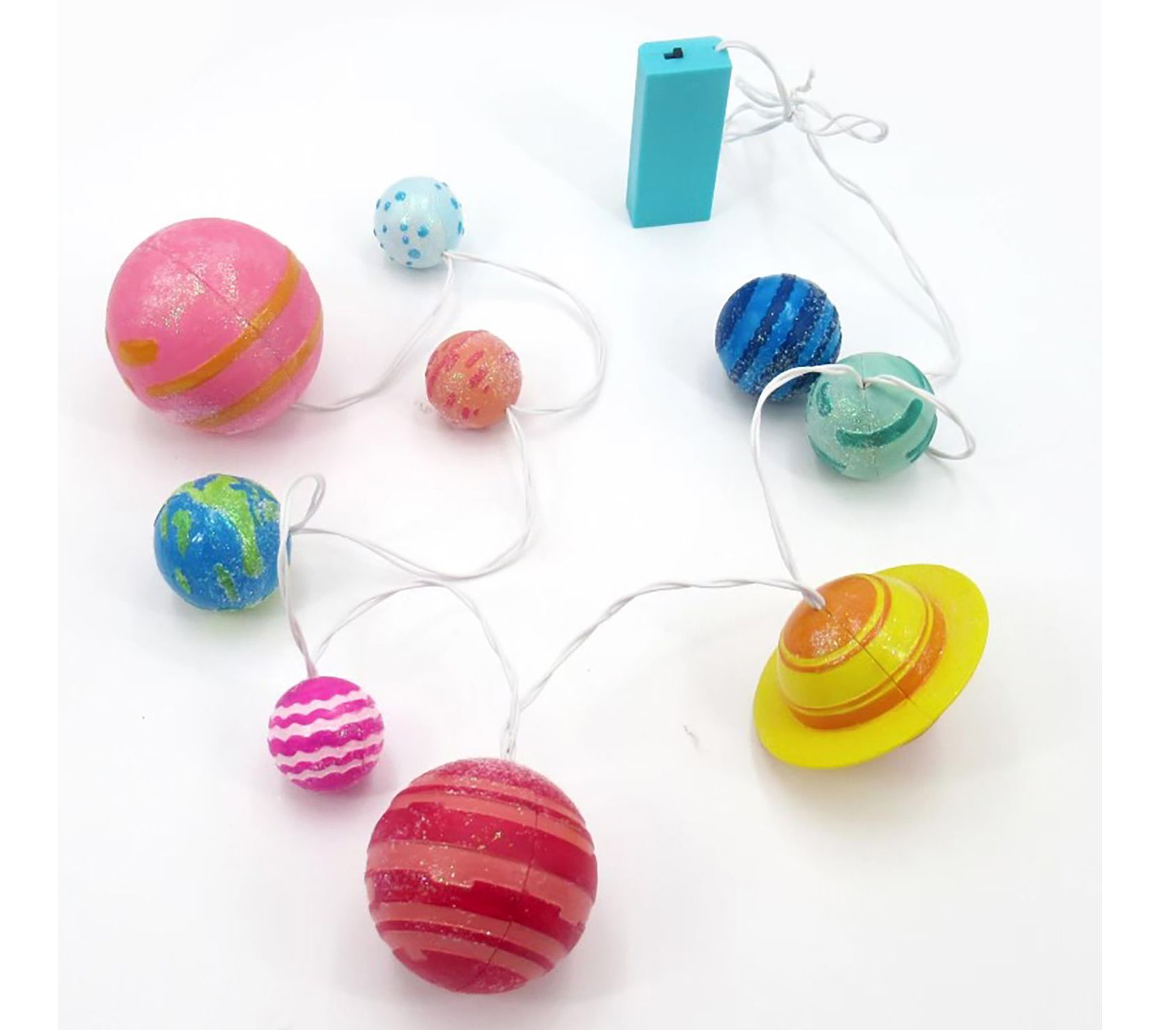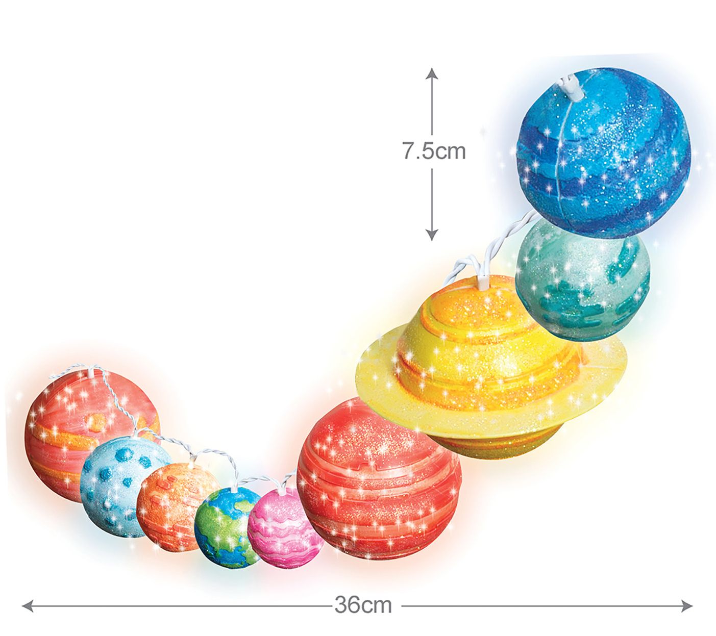 • Includes full set of Solar System plastic planets, string lights with nine LEDs, poster, paint strip, paint brush, two packets of glitter, and detailed instructions