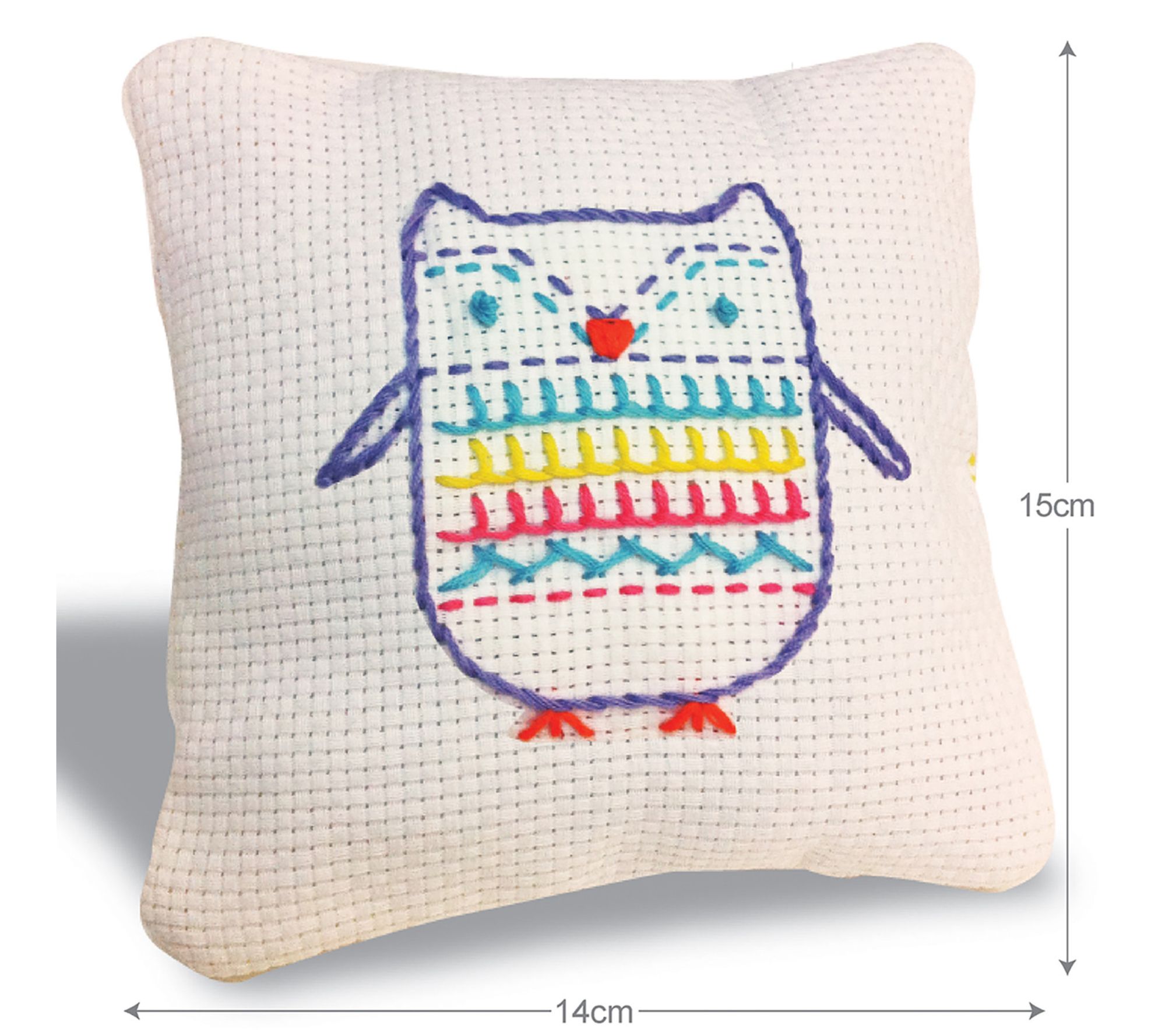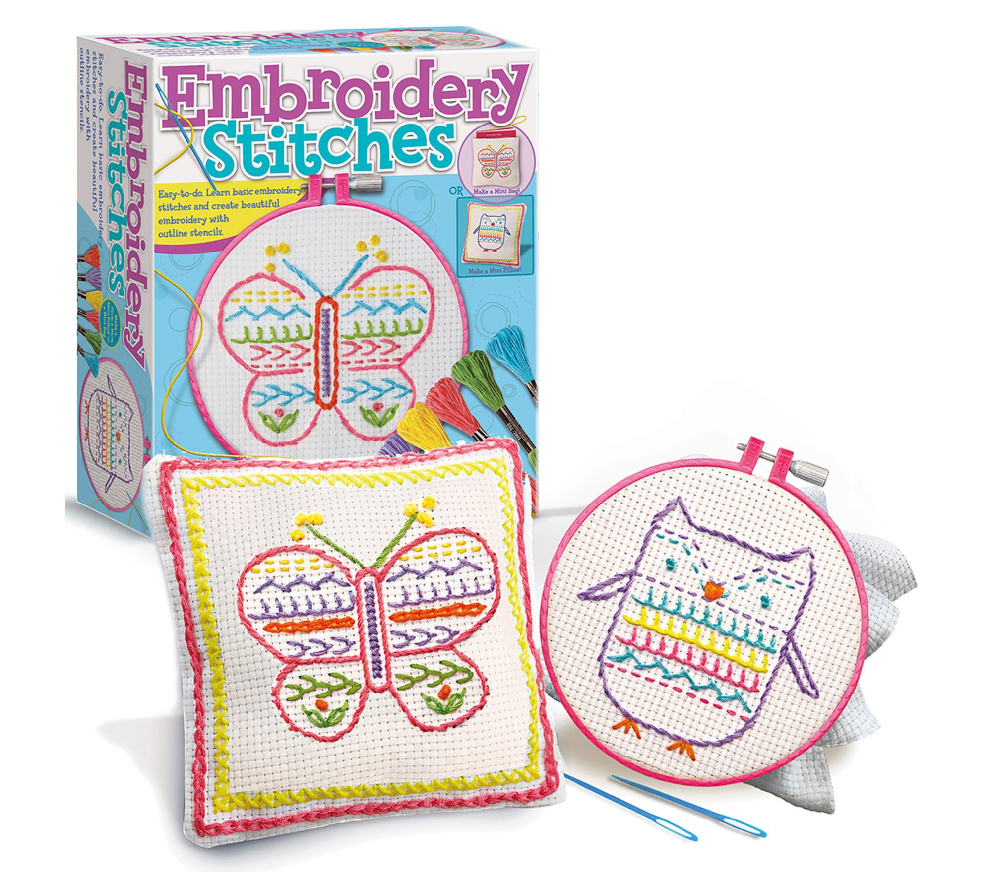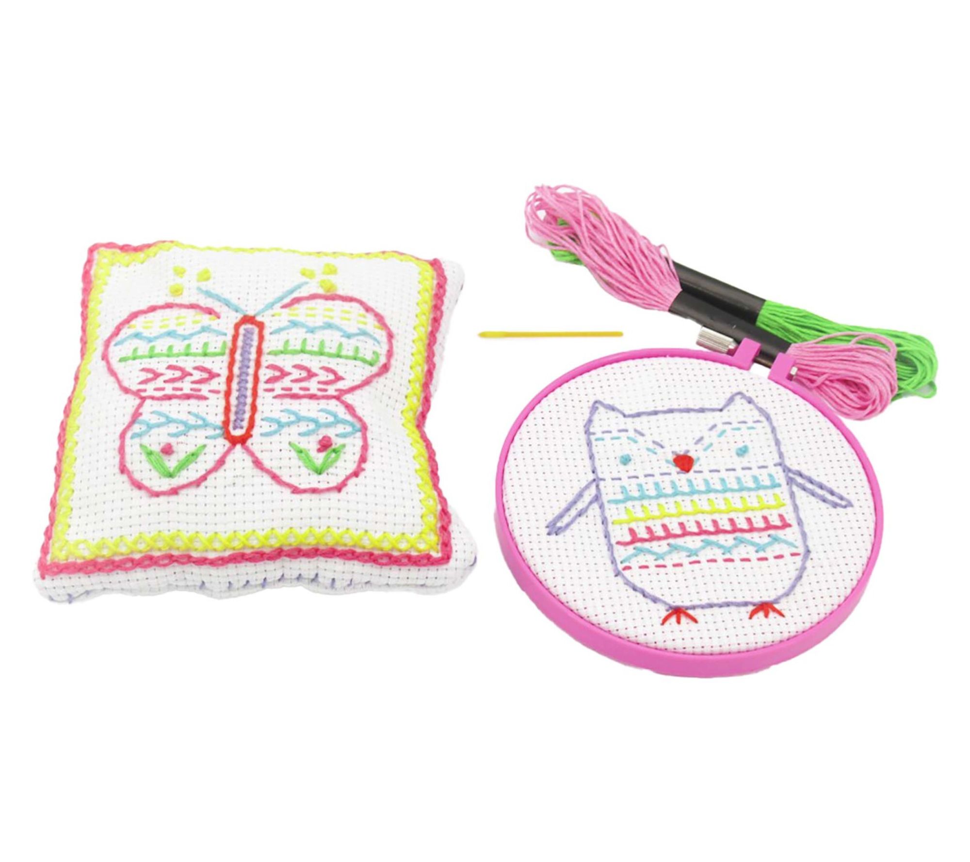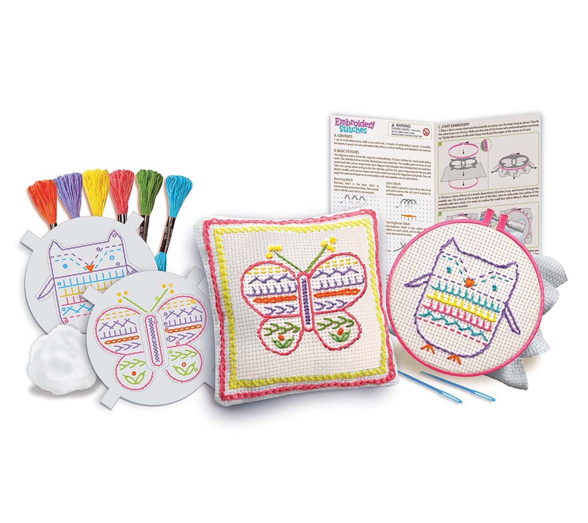 • Includes embroidery hoop, six spools of colored embroidery floss, three sheets of embroidery canvas, two outline templates, two plastic needles, pillow stuffing, and instructions