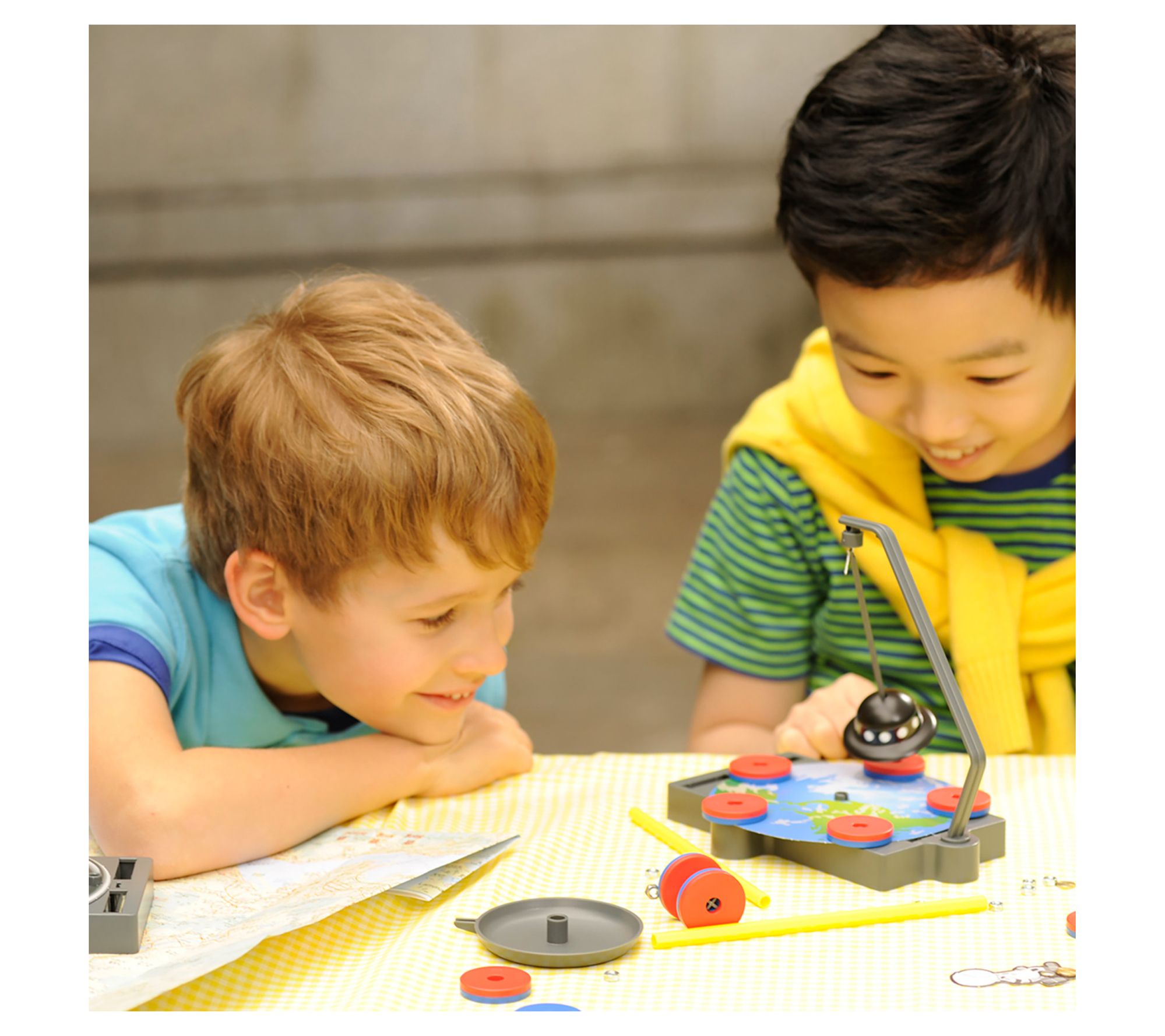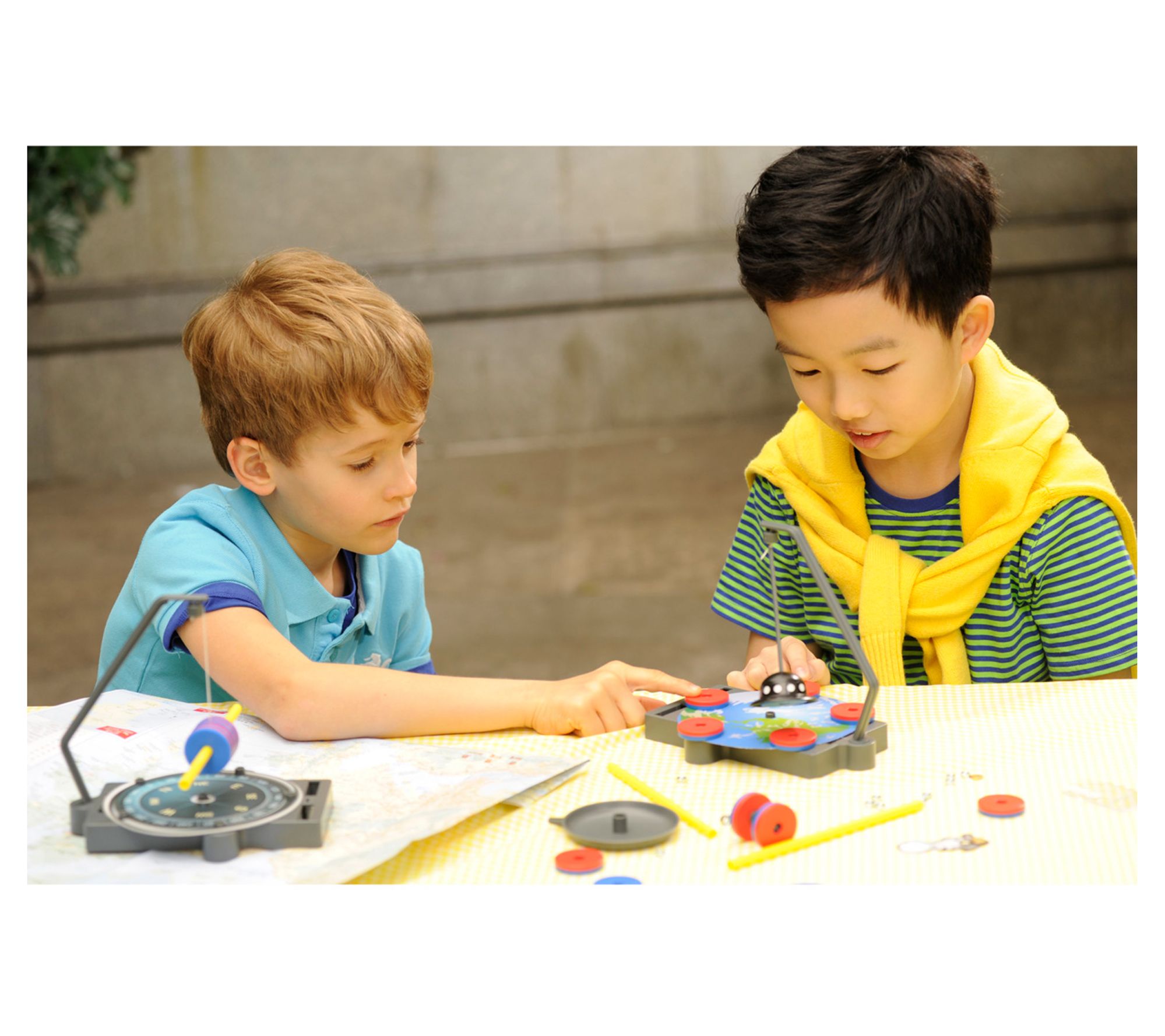 • Includes 1 graphic template (1 compass, 1 earth, 1 spaceman), 1 thin rod with ring, 1 hexagonal rod, 1 round rod, 1 sticker, 1 UFO body, 1 string, 1 pointer, 1 copper washer, 10 nuts, 7 ring magnets, 1 enclosure, 1 divider, 1 weighing pan, 1 string attachment, 1 axle, 1 support arm, 1 baseplate (14 x 17.5 x 2 cm), and detailed instruction; adhesive tape required but not included