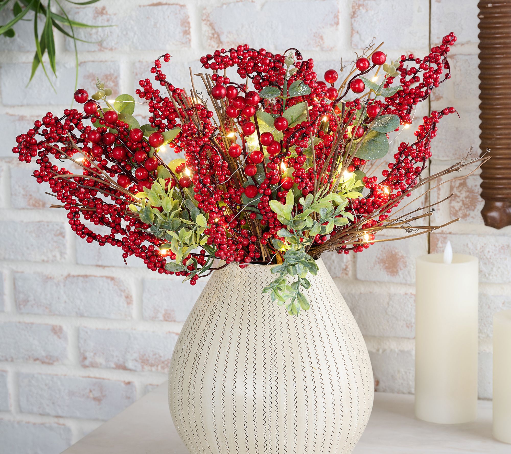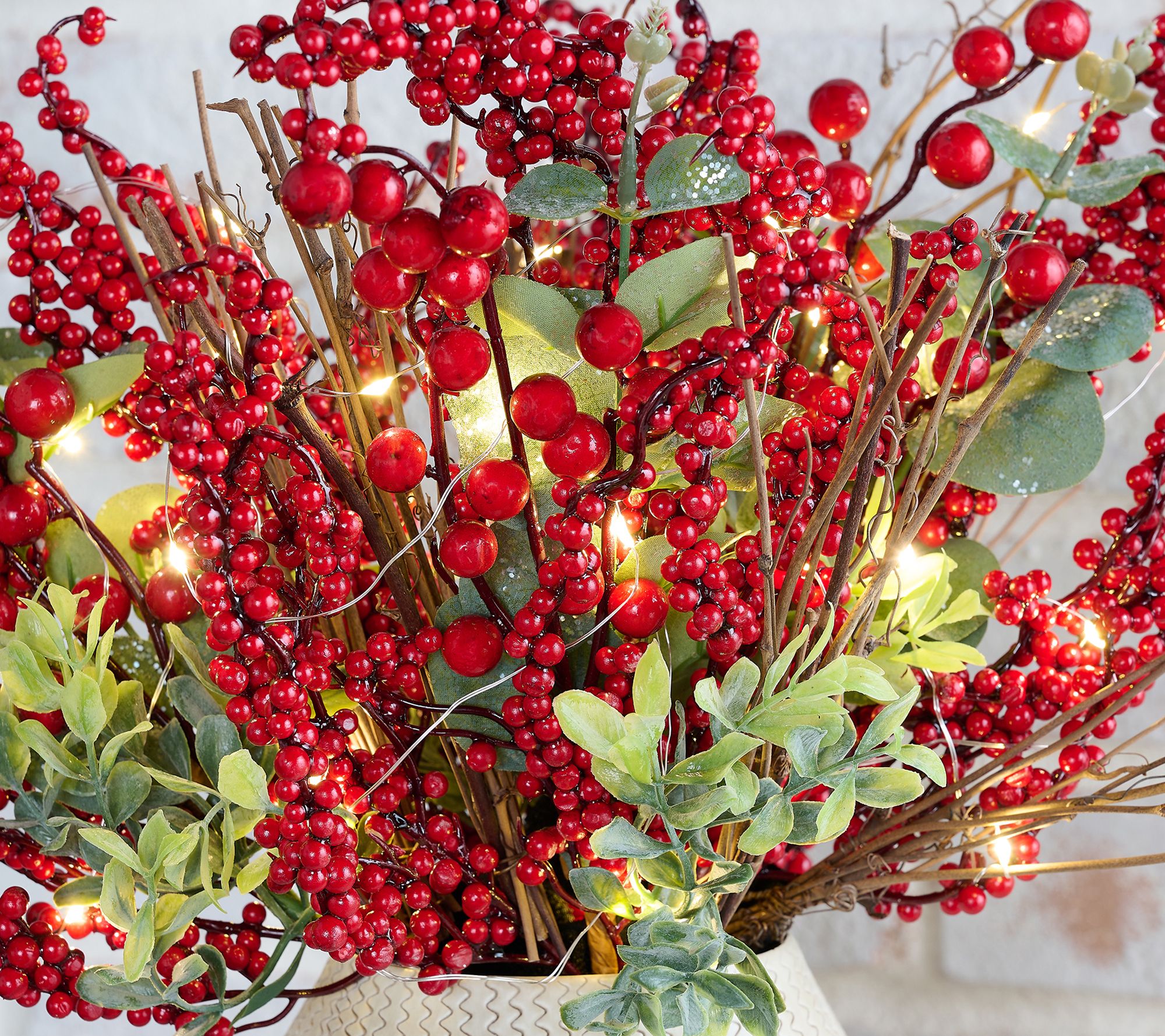 Light up your seasonal displays with these illuminated berry and eucalyptus picks -- ideal for accenting wreaths, centerpieces, or floral arrangements with a hint of sparkle. Tucked among faux berries, eucalyptus, and twig accents, their micro lights add a warm, festive shimmer whether clustered in a vase or woven through garland. From the Valerie Parr Hill Collection.