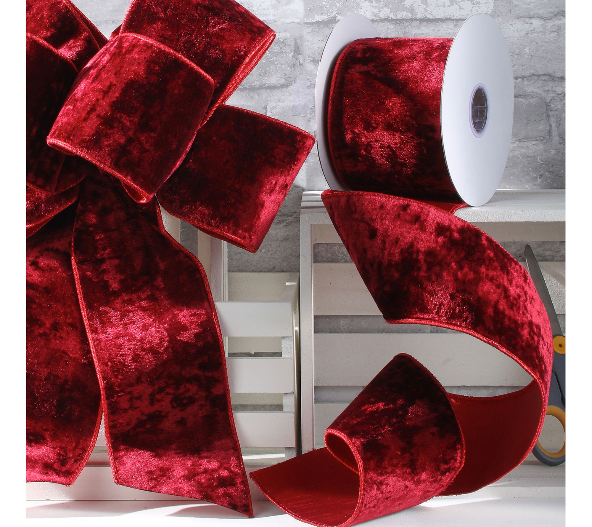 Add a touch of holiday glamour to your gifts, tree, or wreaths with this soft velvet ribbon boasting a shimmering metallic back and bendable sewn-wire edges that create perfectly shaped bows. From Regency International.