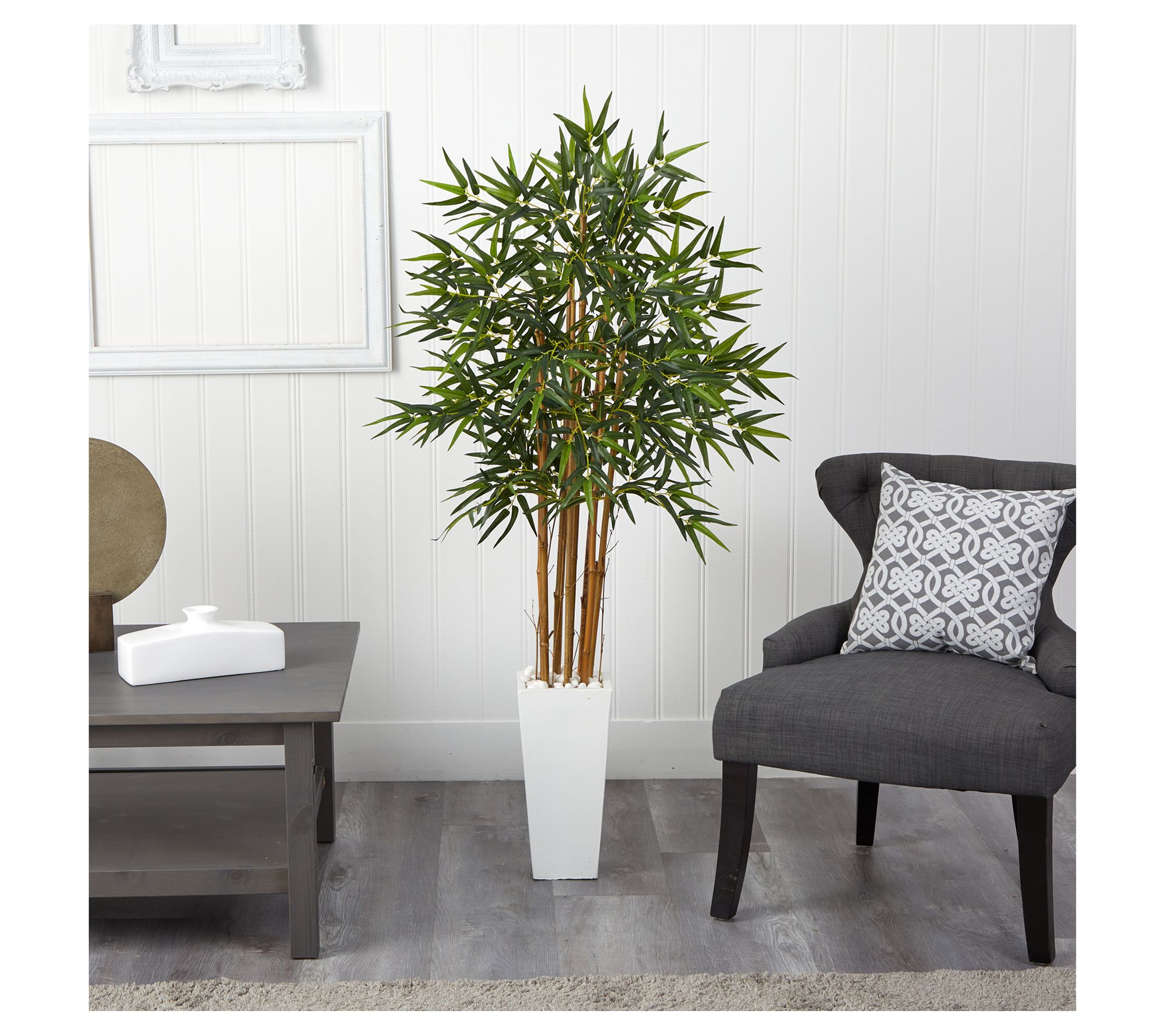 • Faux bamboo tree in a white tower planter