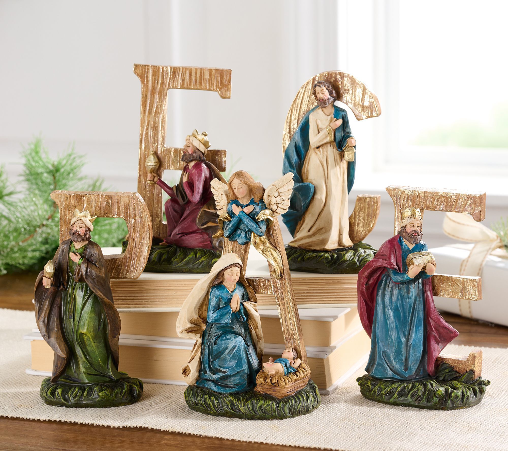 The baby Jesus is surrounded by those who adore him in this nativity scene that spells out a special sentiment. Add this beautifully crafted piece to your seasonal decor for a meaningful display. From the Valerie Parr Hill Collection.
