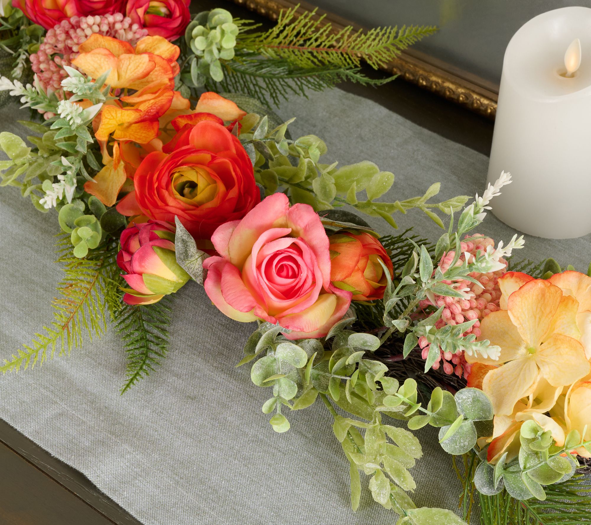 Lush blooms and vibrant greens bring lasting charm to mantels, banisters, or tables when you display this lifelike garland. Filled with rose, ranunculus, hydrangea, sedum, and eucalyptus leaves, this decorative accent infuses your space with fullness and a soft touch -- no watering or pruning required. From the Valerie Parr Hill Collection.