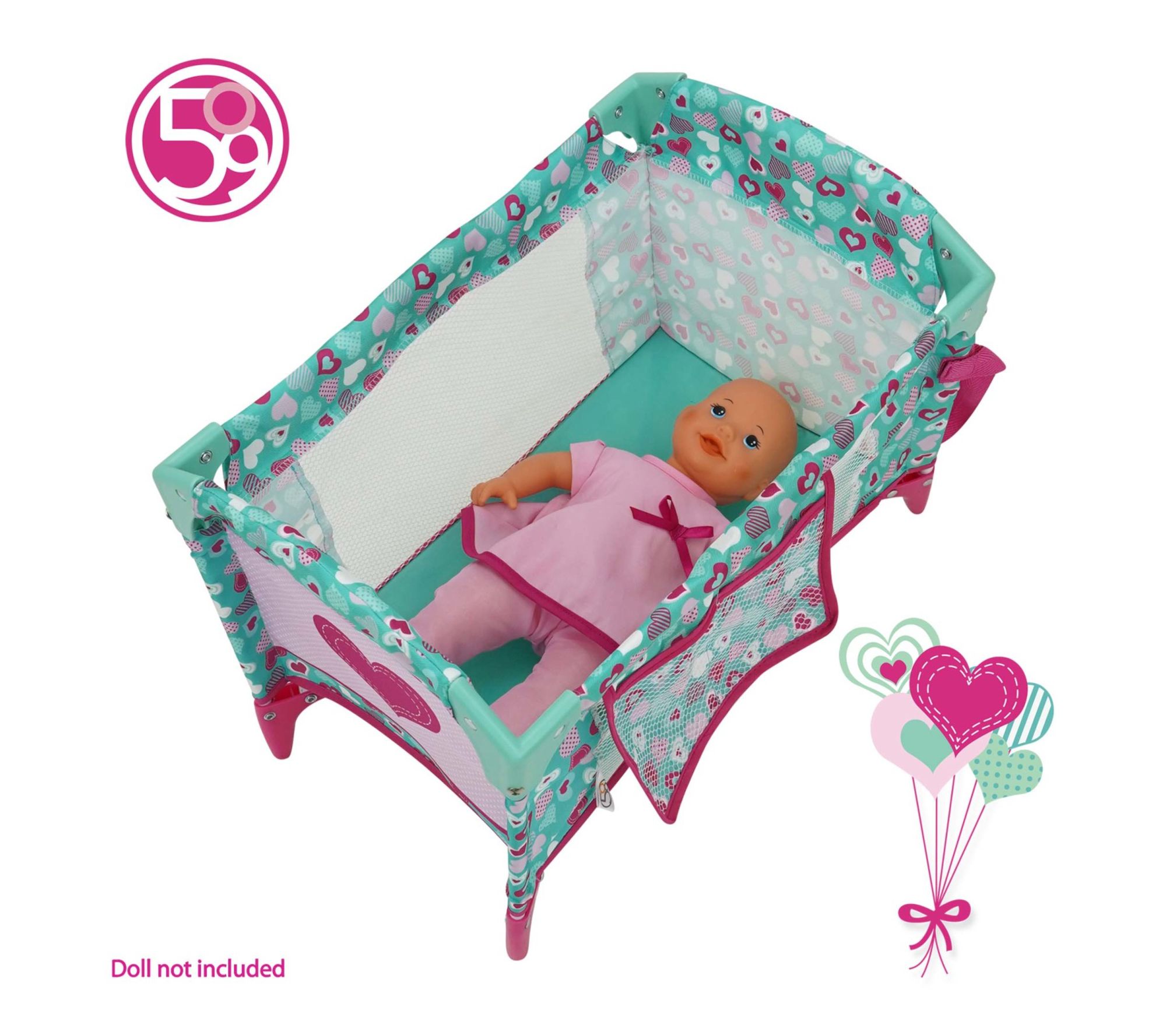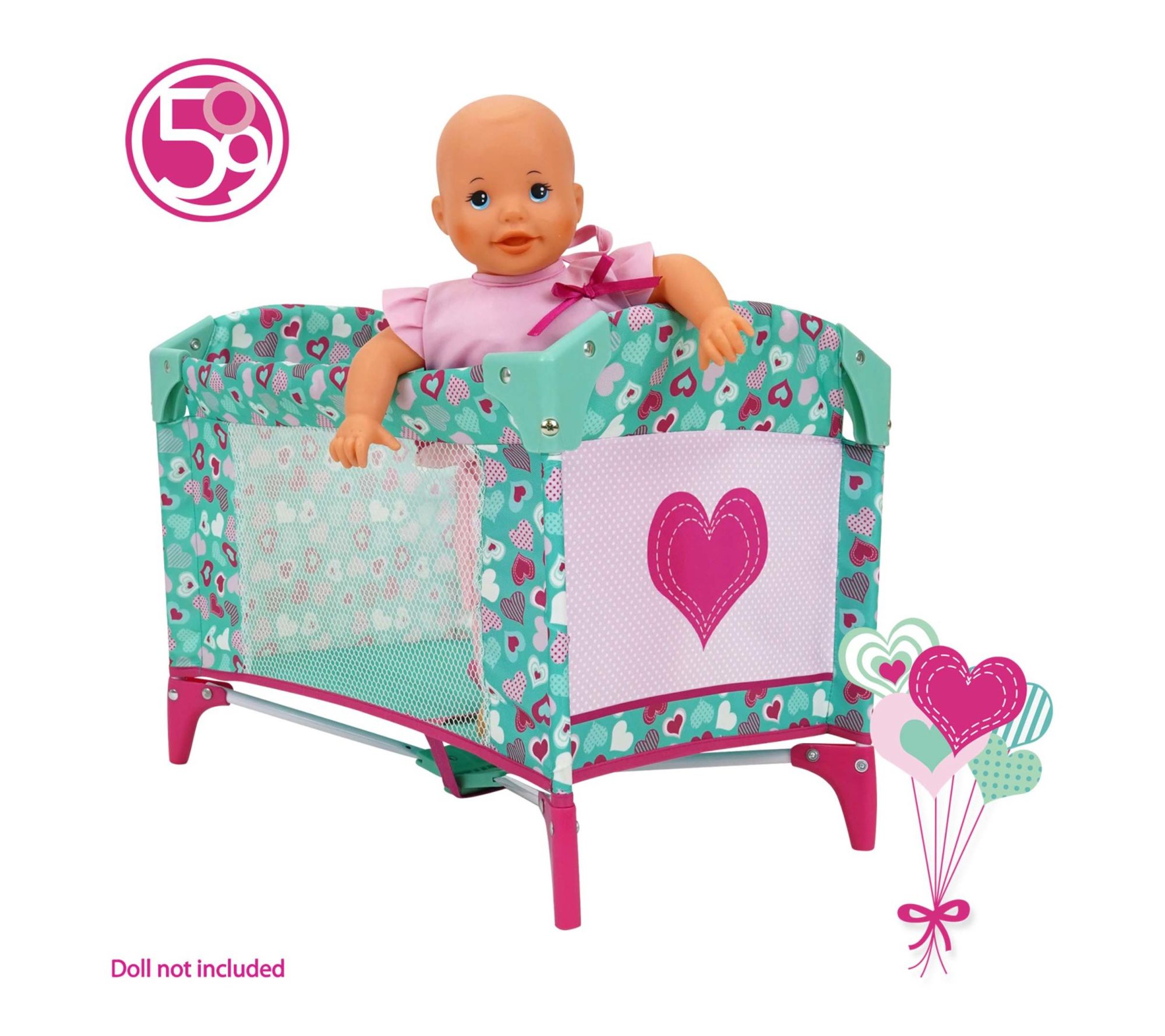 Your child's next pretend play adventure will come to life with the Mint Heart Dream N' Fun Doll Play Yard. This charming accessory creates a cozy rest spot for dolls or plush companions, making it easy for little caregivers to organize playtime and naptime routines. Side pockets help keep essentials close by, while the compact foldable design is ideal for storing or travel. From 509 Crew.