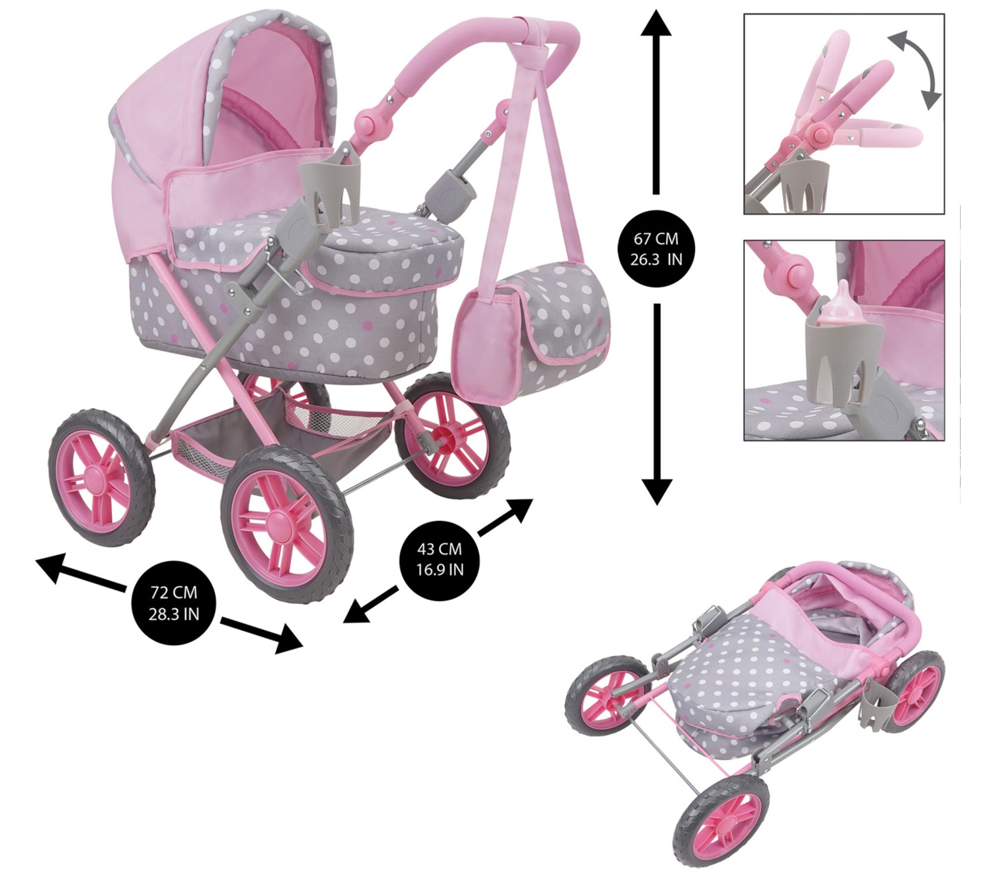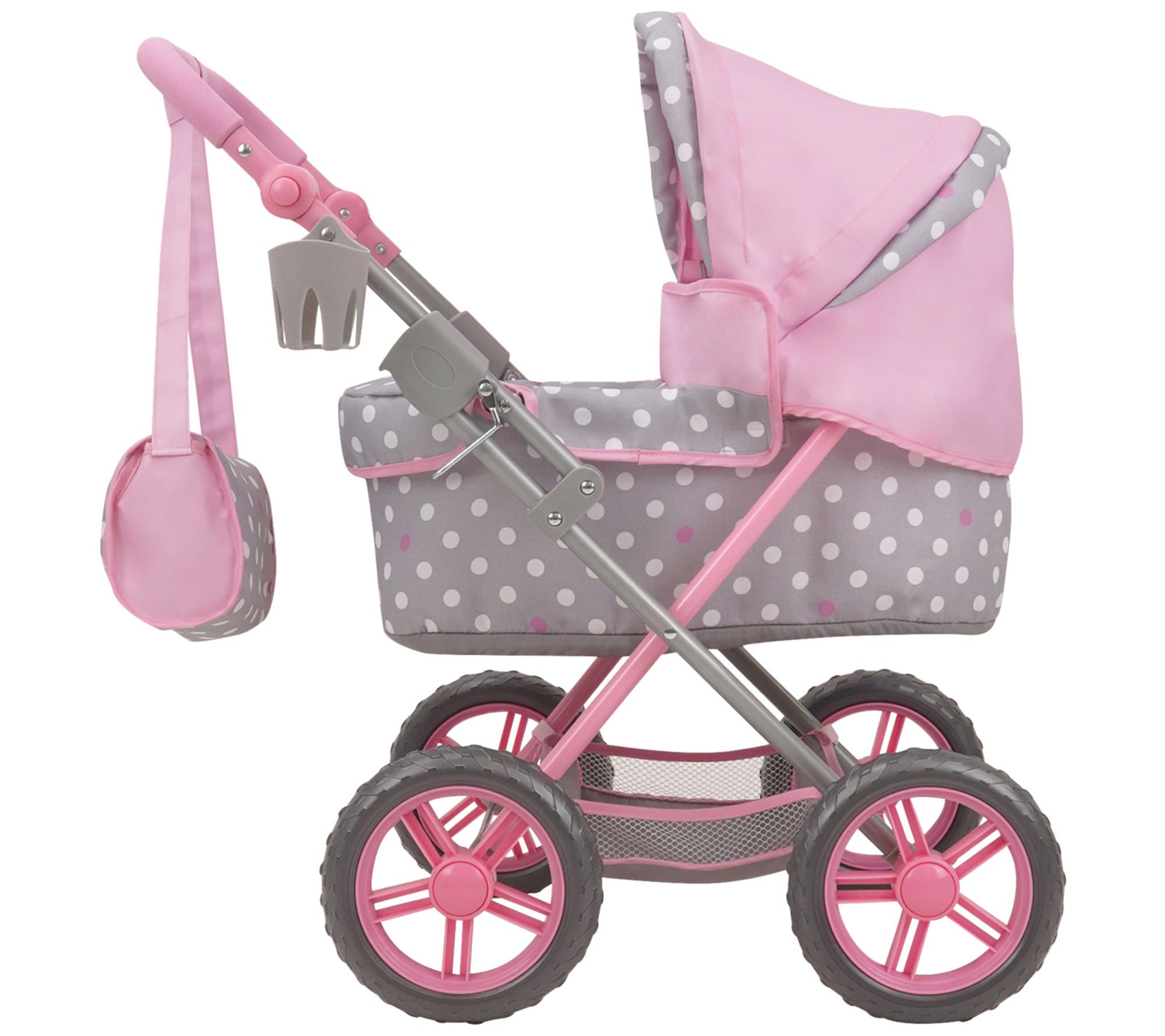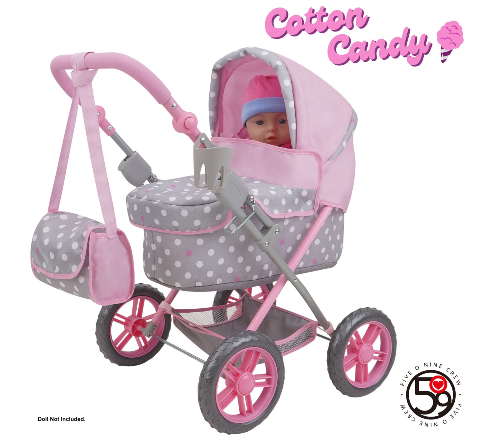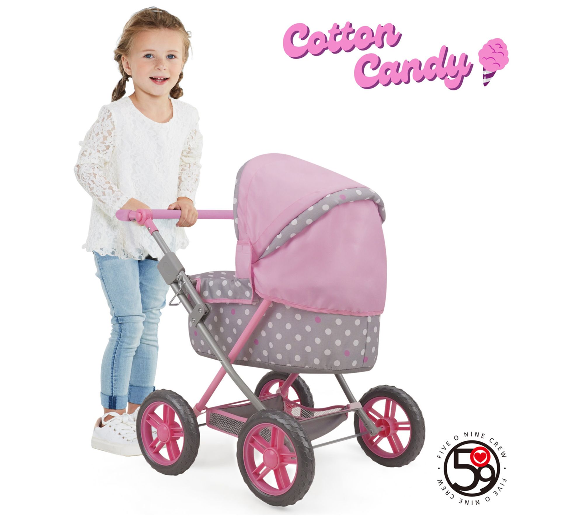 This Amanda Doll Pram by 509 Crew offers a delightful blend of classic style and modern functionality. Featuring a charming polka dot pattern in Cotton Candy Pink and Gray, it comes with a large canopy, ergonomic handle, and a removable bassinet. Your child will love taking their dolls on adventures with the included shopping basket and matching bag. From 509 Crew.