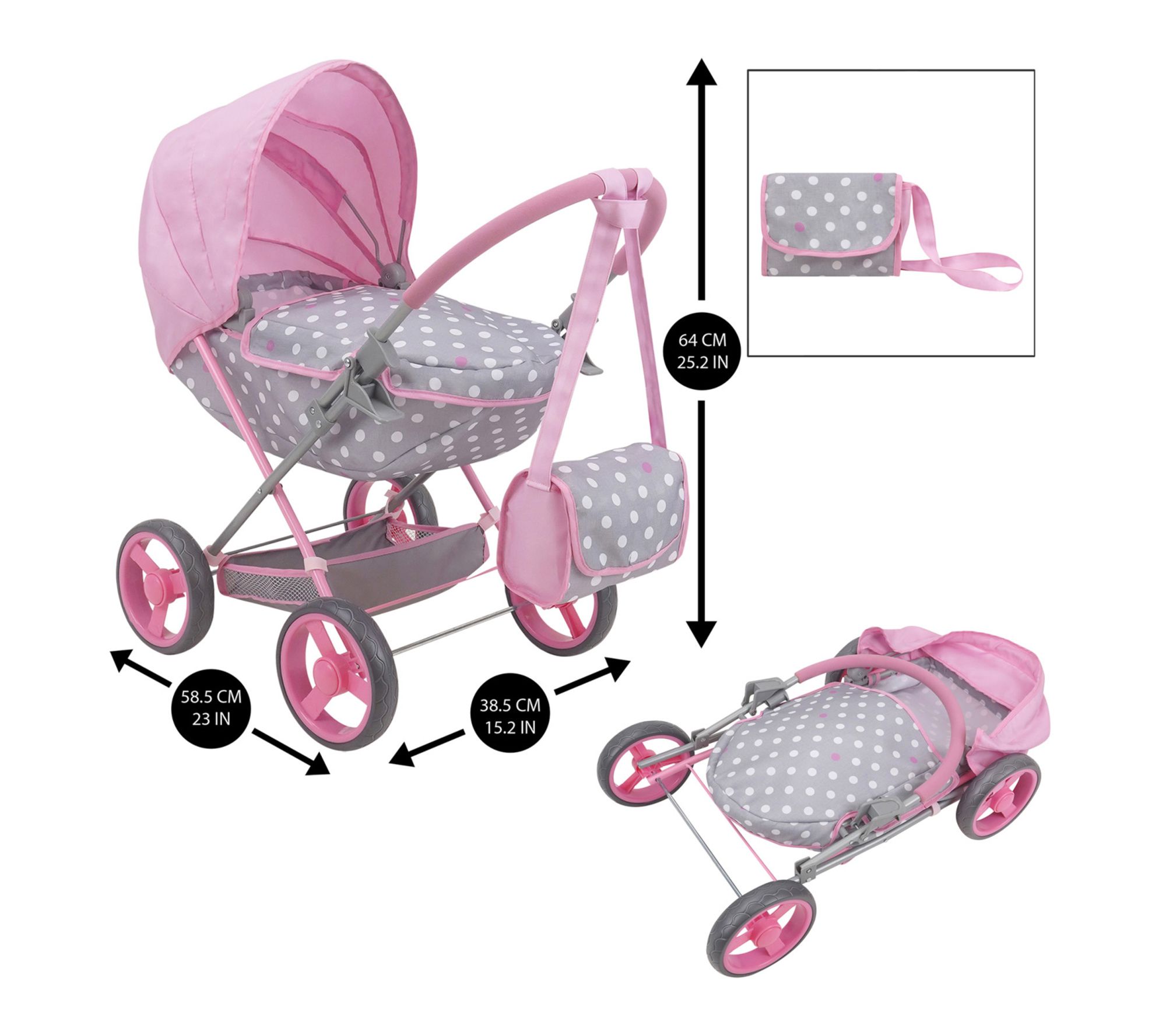 • Includes pram and shoulder bag