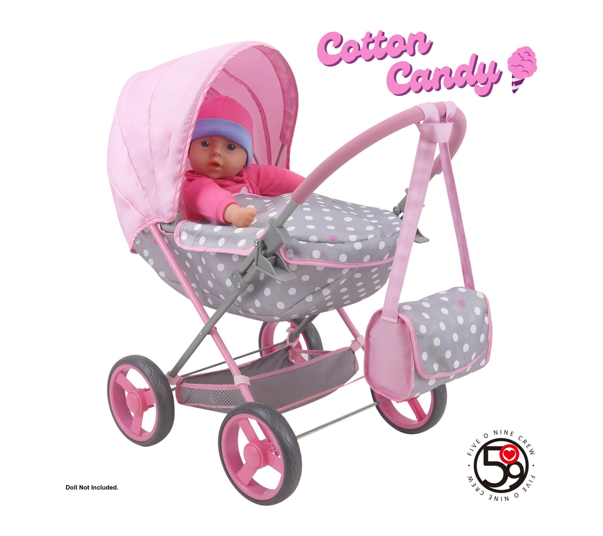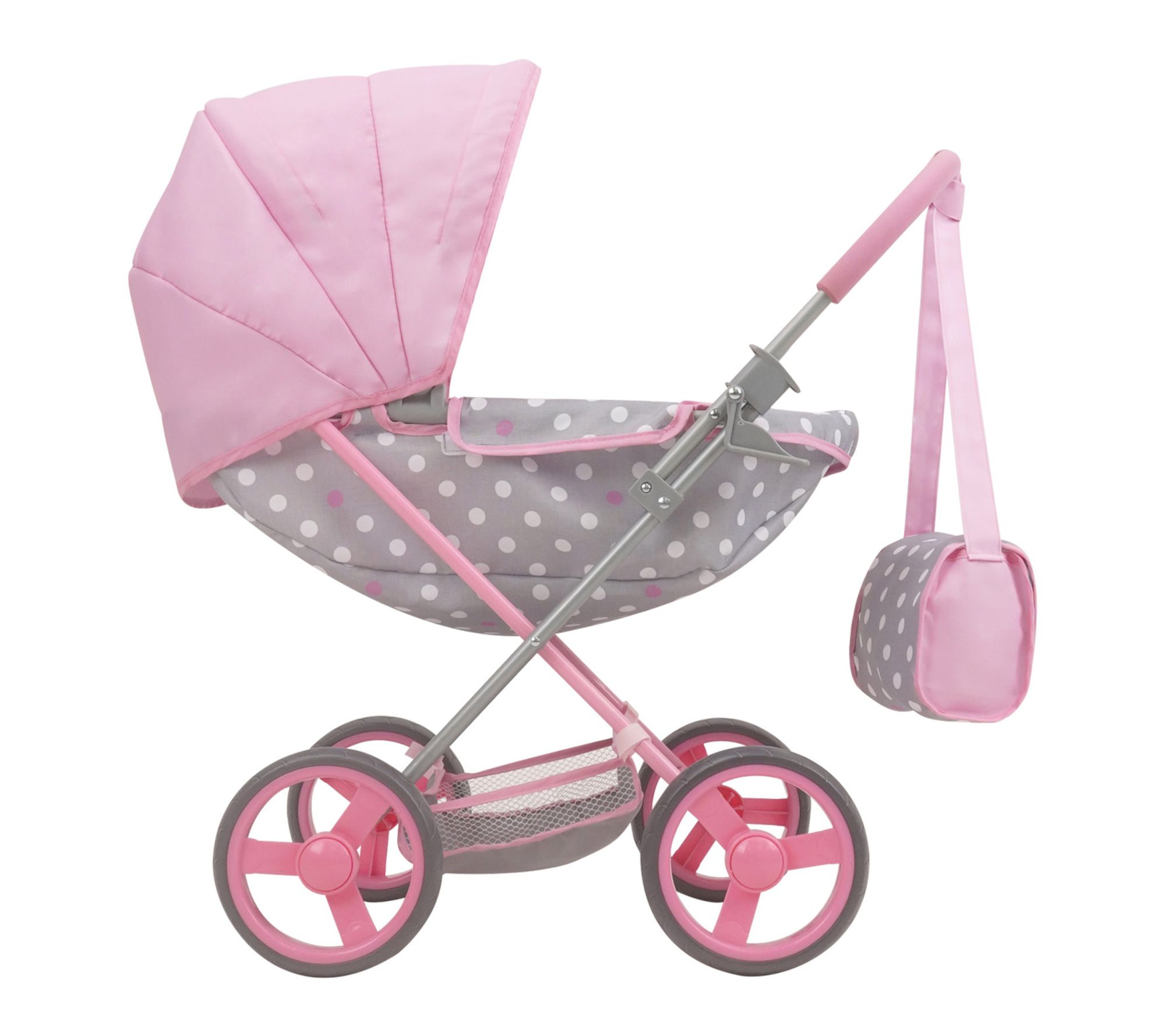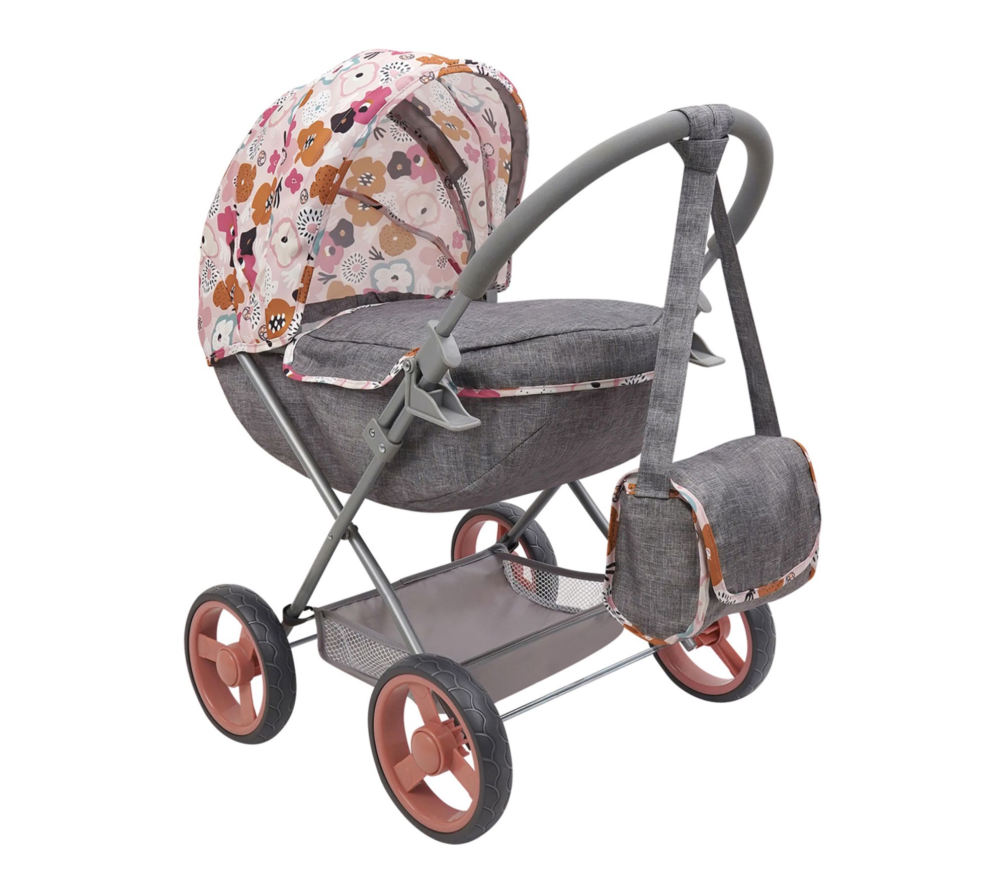 Take playtime on the go with this deluxe doll pram and matching shoulder bag, designed to inspire imaginative adventures and playful outings. Outfitted with a roomy shopping basket for toy errands, non-marking wheels, and a large canopy, this charming accessory is built for easy strolling and packing essentials. Little ones can tuck in their favorite plush or doll, creating realistic moments of fun and care. From 509 Crew.