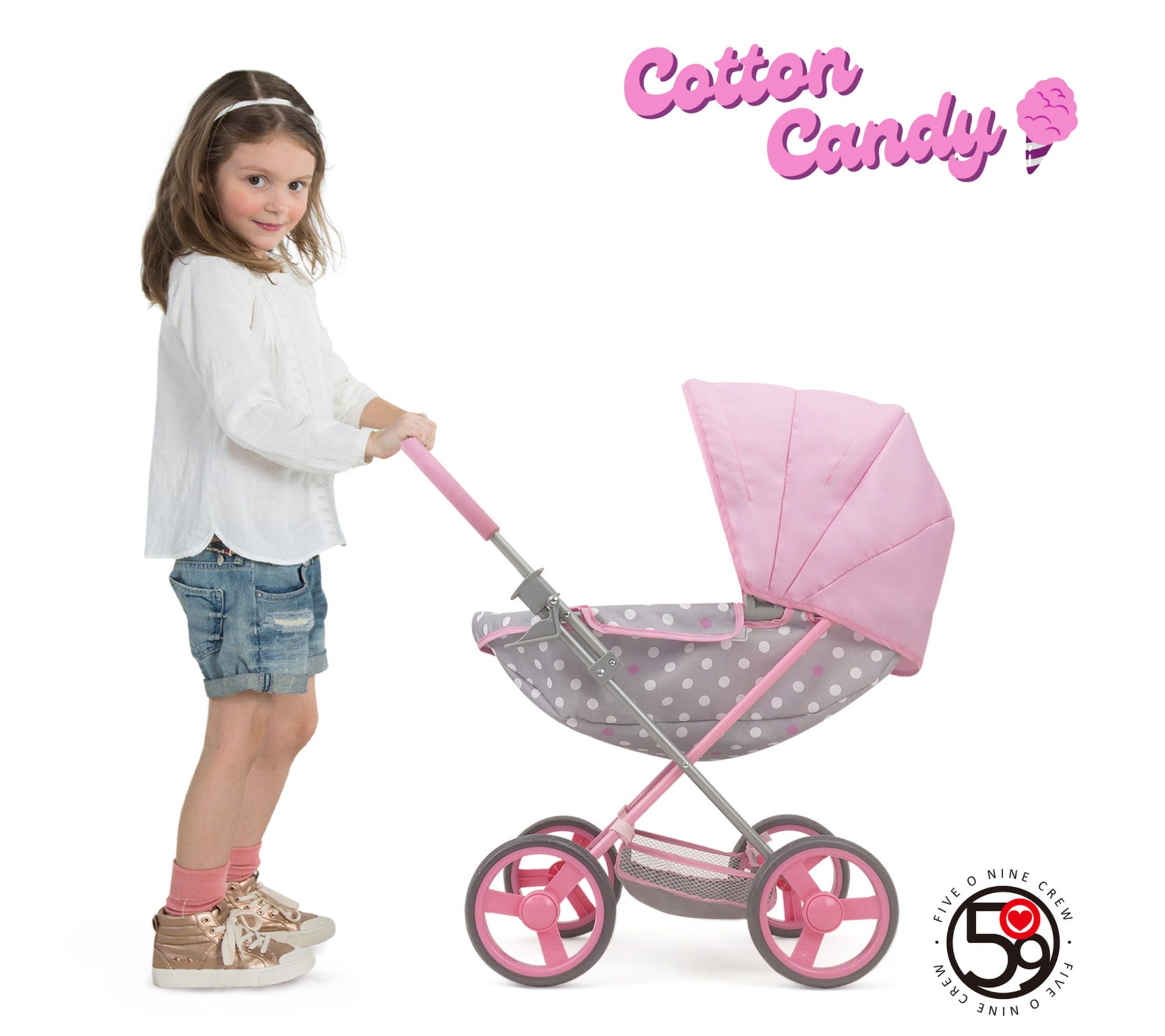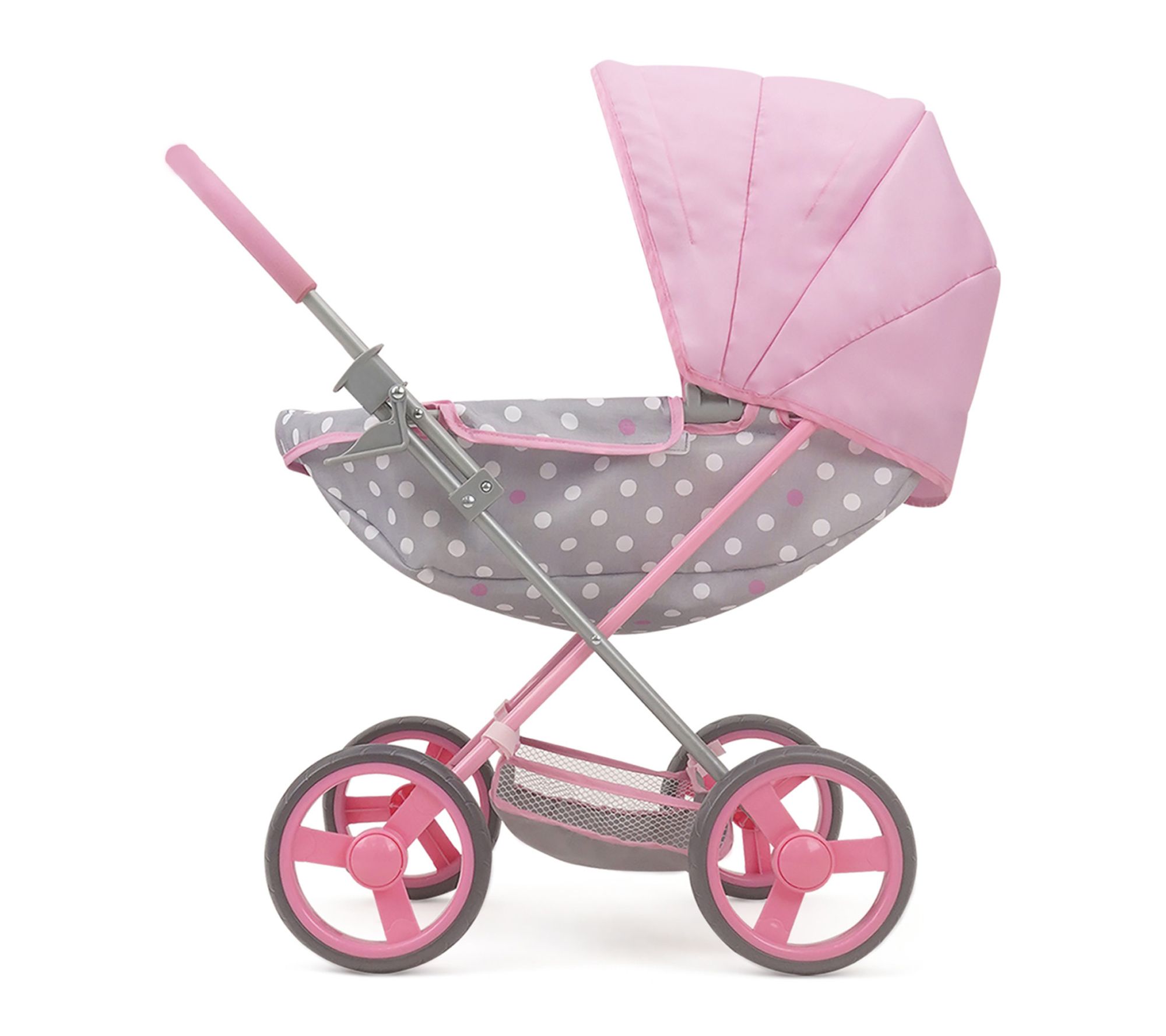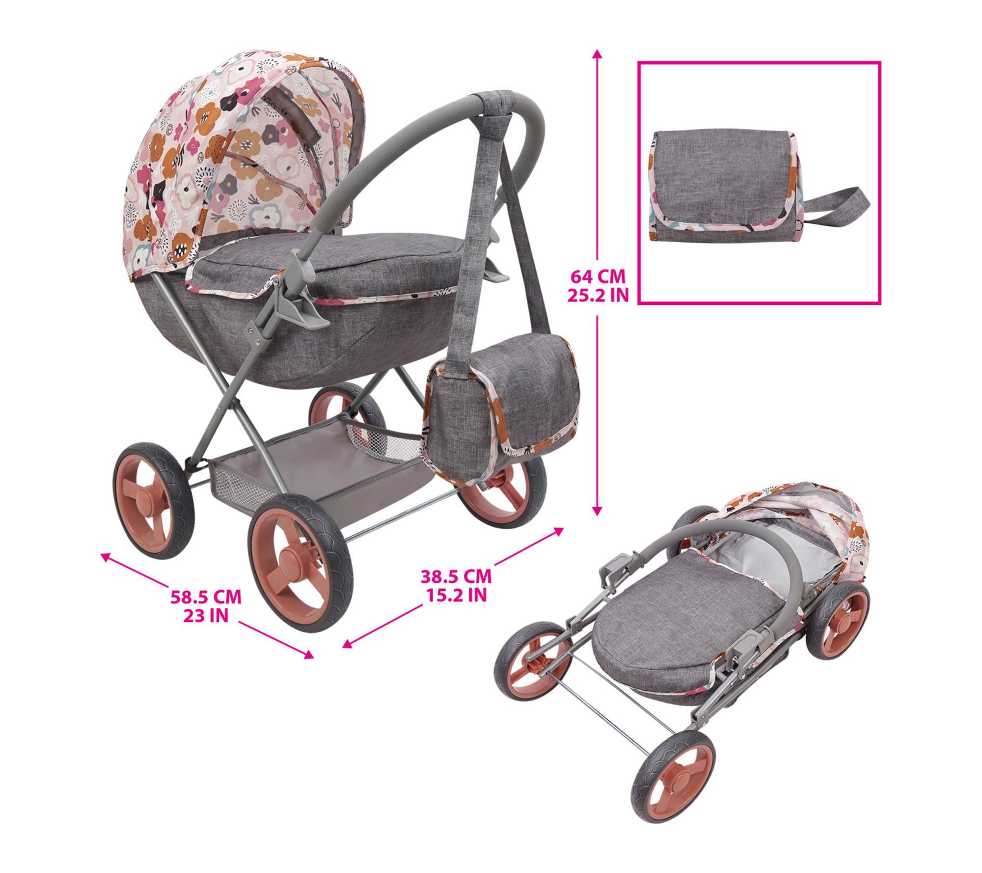 Take playtime on the go with this deluxe doll pram and matching shoulder bag, designed to inspire imaginative adventures and playful outings. Outfitted with a roomy shopping basket for toy errands, non-marking wheels, and a large canopy, this charming accessory is built for easy strolling and packing essentials. Little ones can tuck in their favorite plush or doll, creating realistic moments of fun and care. From 509 Crew.
