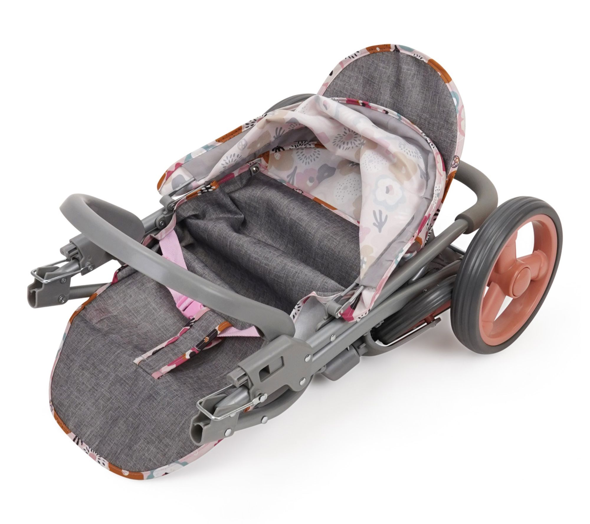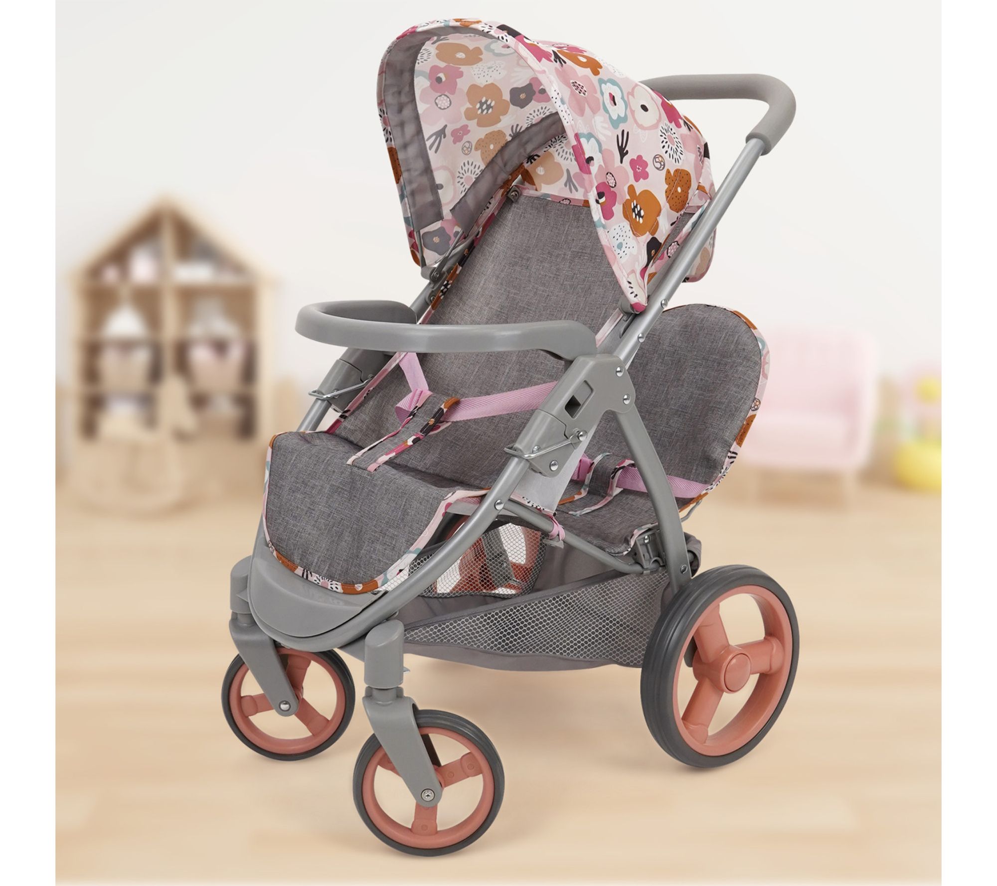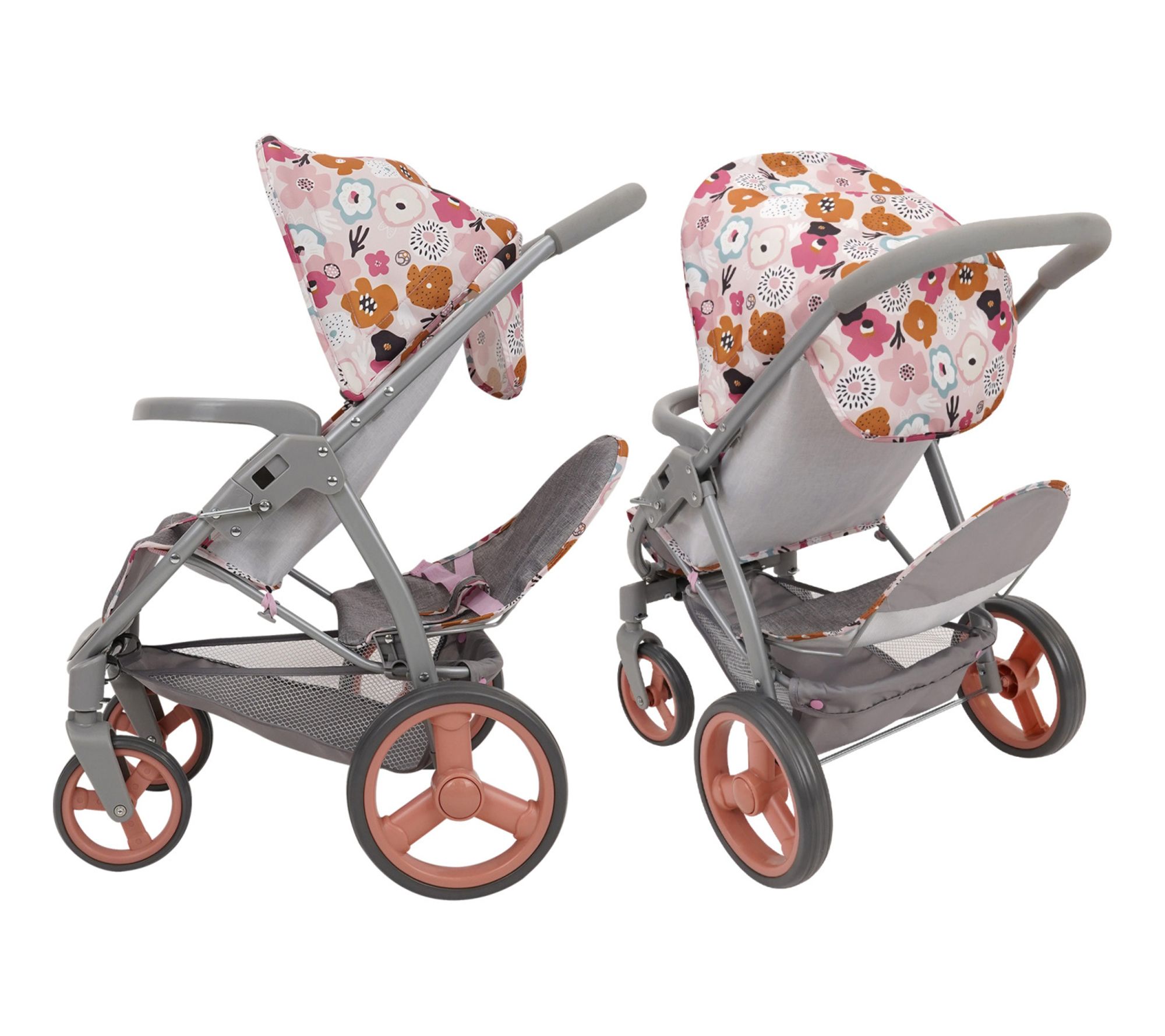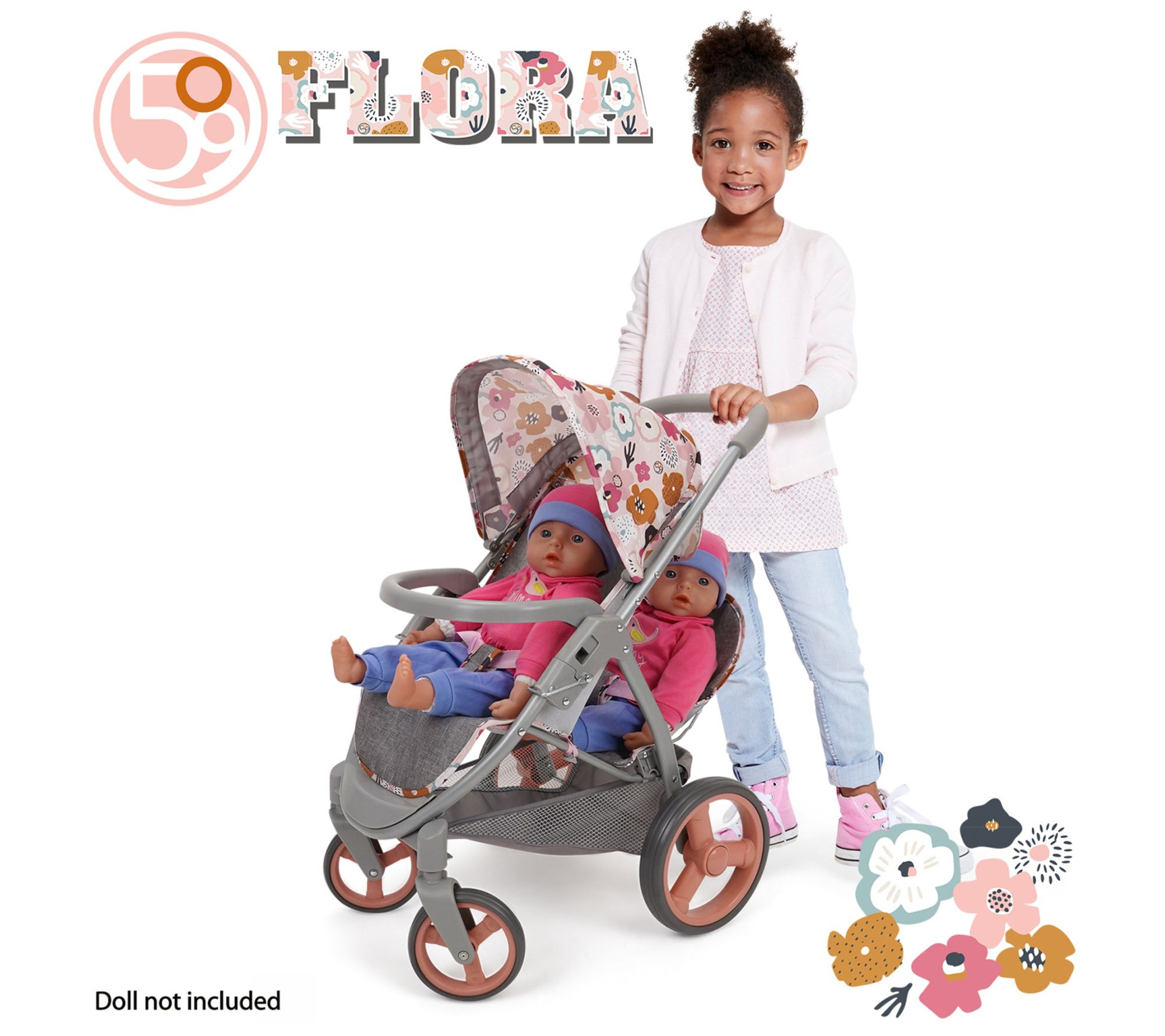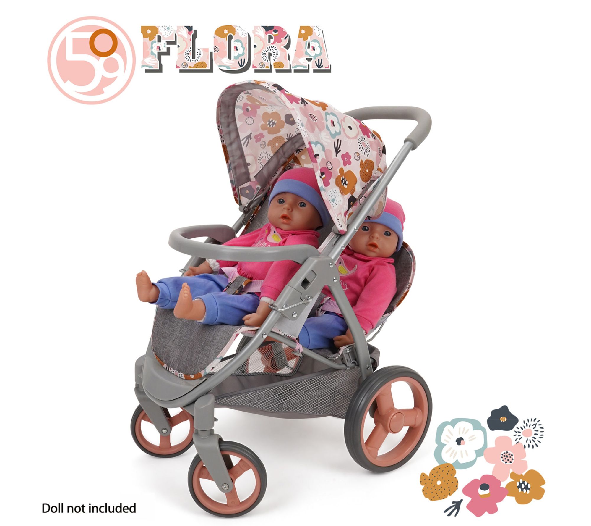 The 509 Crew Mabelle Duo Twin Doll Stroller in Melange Flora is perfect for little ones who love their twins or favorite dolls. Featuring a handy shopping basket, retractable canopy, and smooth two-toned front swivel wheels, this stroller offers realistic role-play. Safety is a priority with the stroller's lock system, requiring both side latches to be lifted for folding. From 509 Crew.