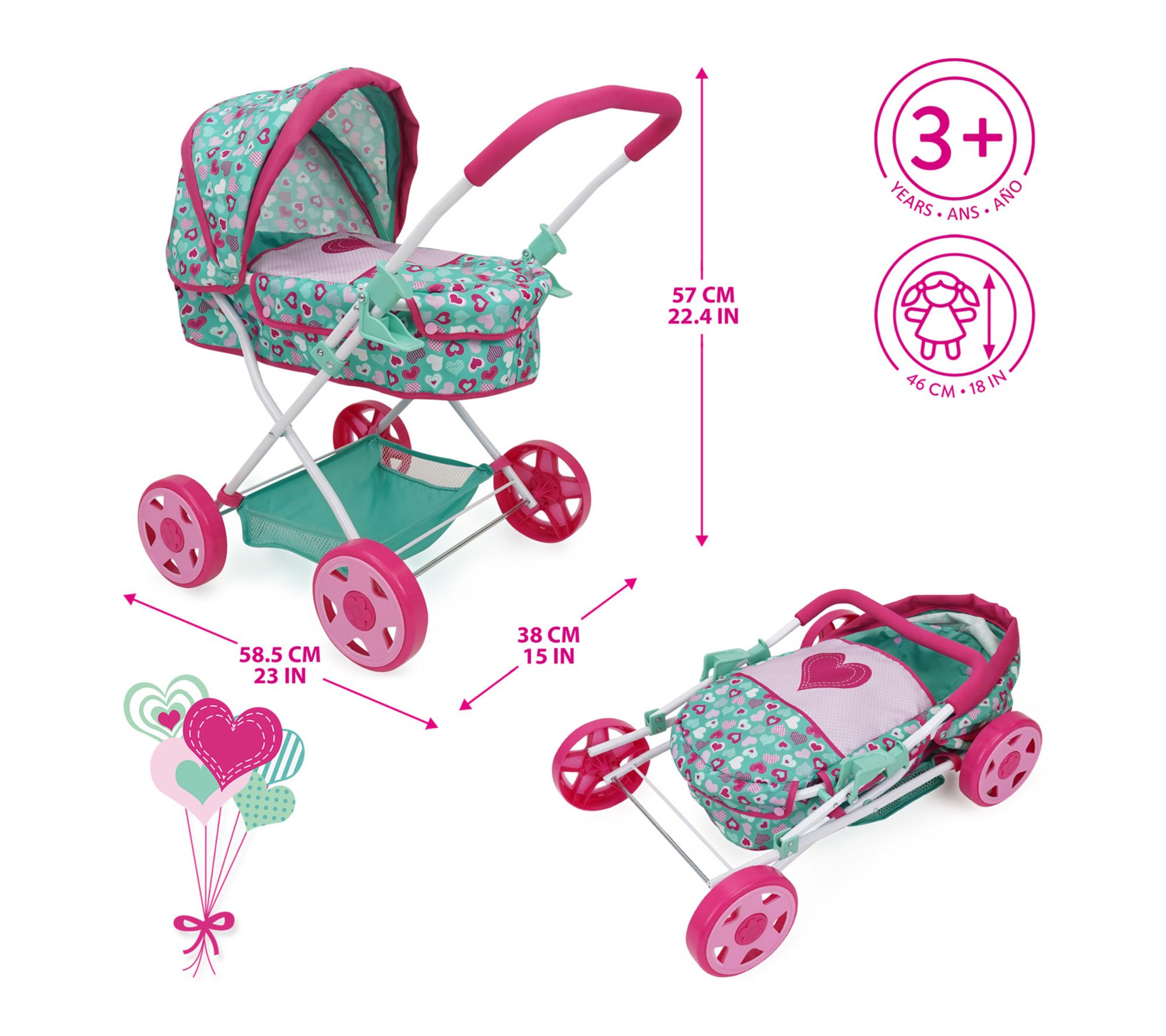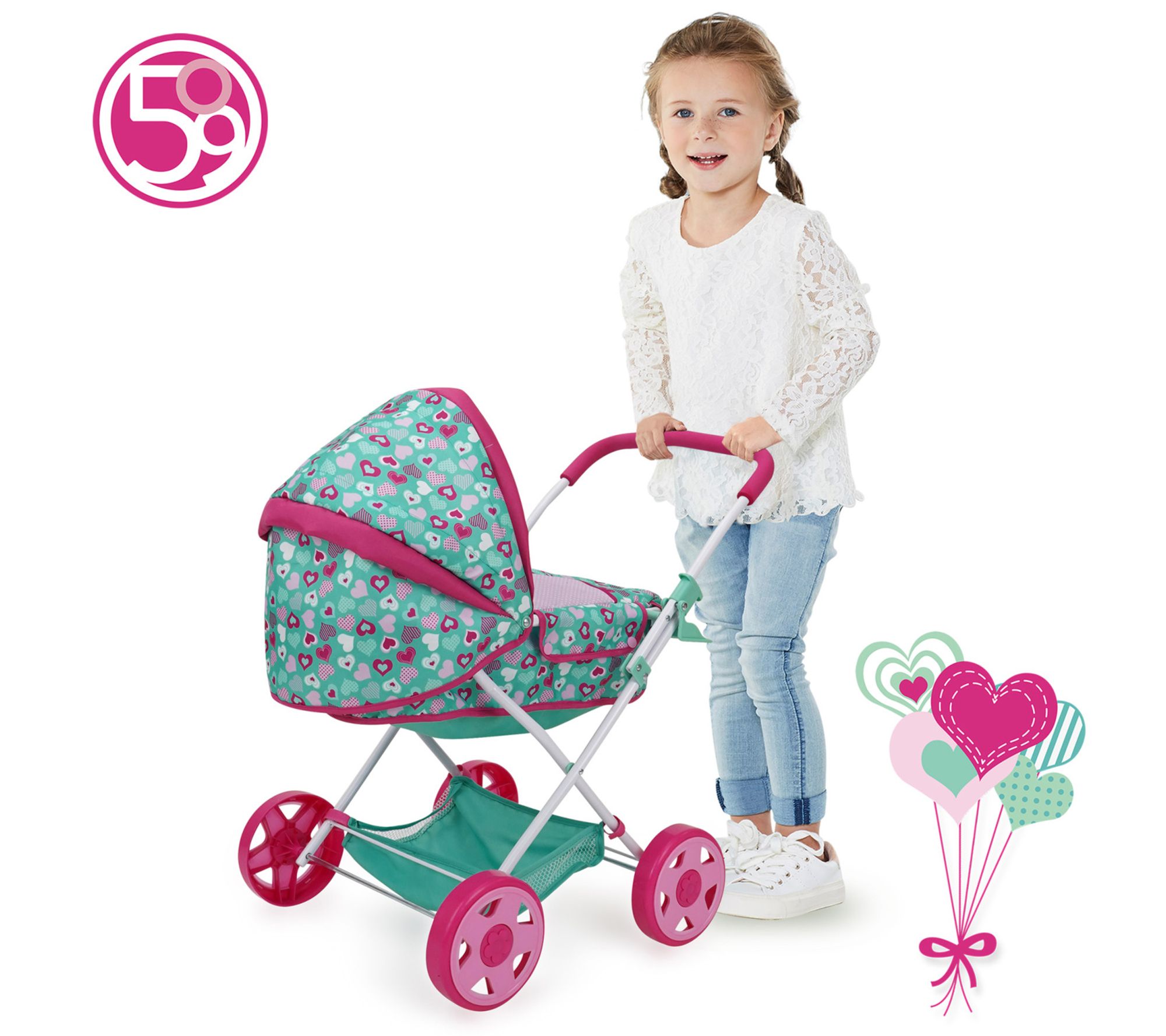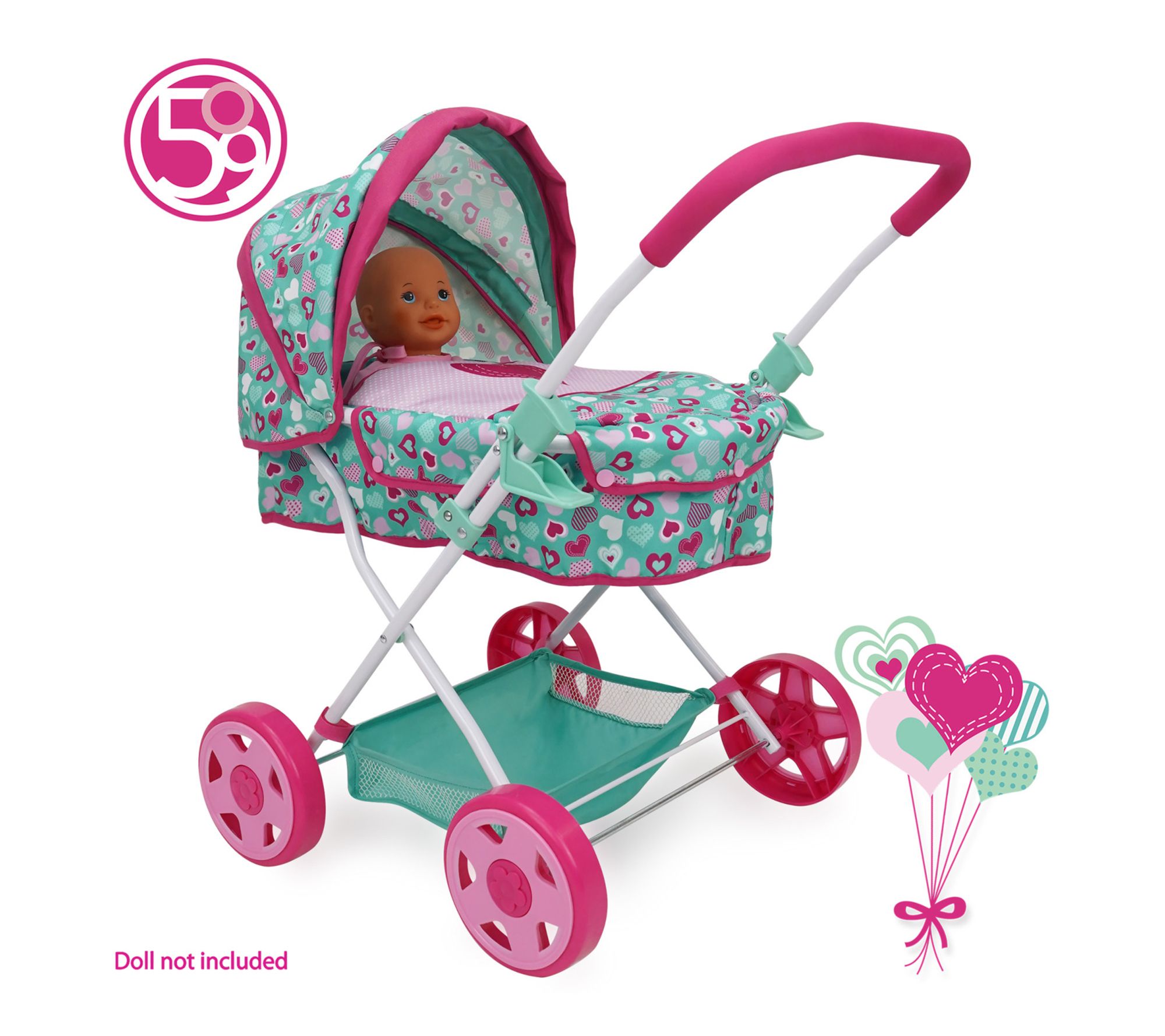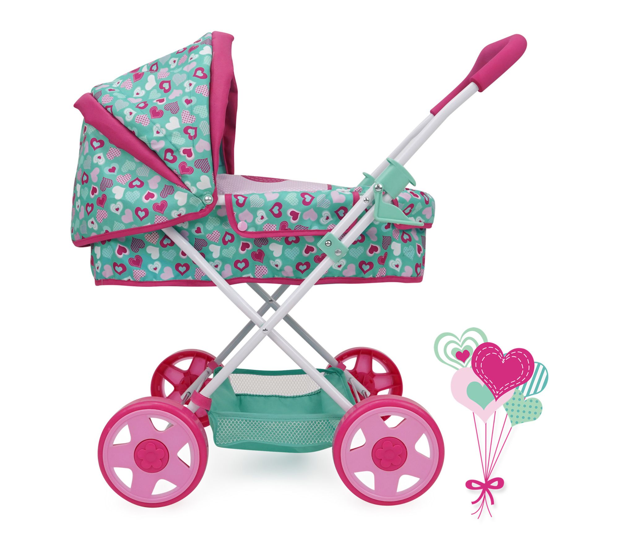 Little caregivers can enjoy imaginative outings with the 509 Crew Mint Heart Daisy Doll Pram, designed to bring realism and style to playtime. Outfitted with a retractable canopy, a spacious undercarriage basket, and vibrant fabric details, this doll stroller keeps young hands busy as they nurture and explore. Its foldable frame allows for easy storage after adventurous strolls. From 509 Crew.