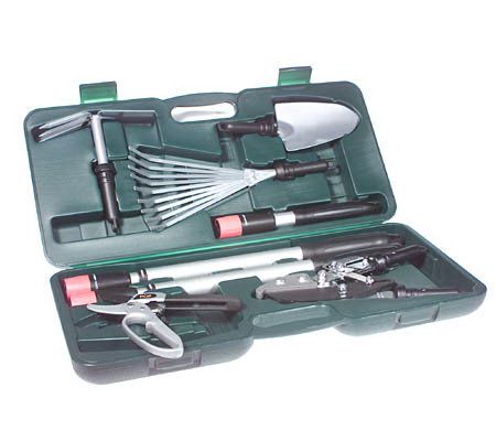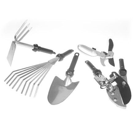 Designed to make your gardening chores easier, this innovative five-piece kit comes with a pair of small pruning shears with ratcheting action and four interchangeable tools that can be easily attached to either the short handle or the longer, telescoping handle. The interchangeable tools include a large anvil lopper with ratcheting action, a garden rake, a trowel, and a three-prong cultivator/hoe combination.
