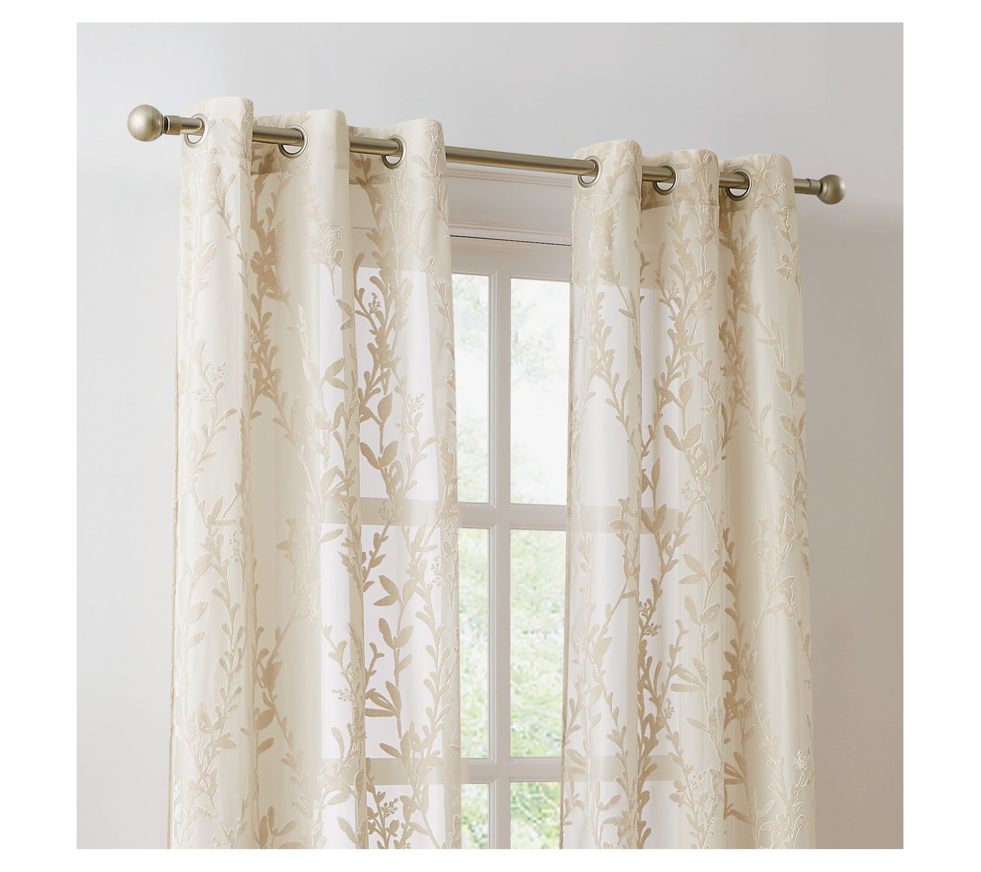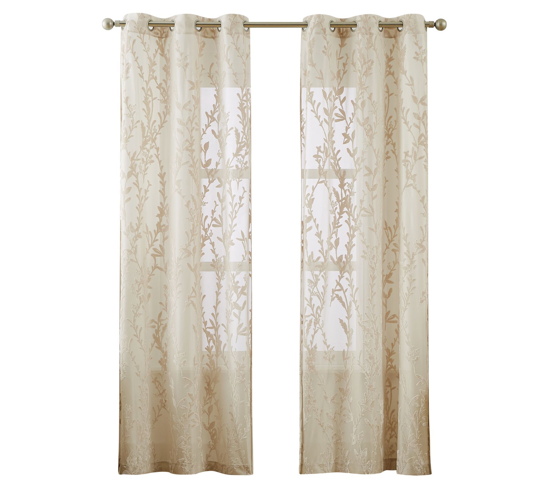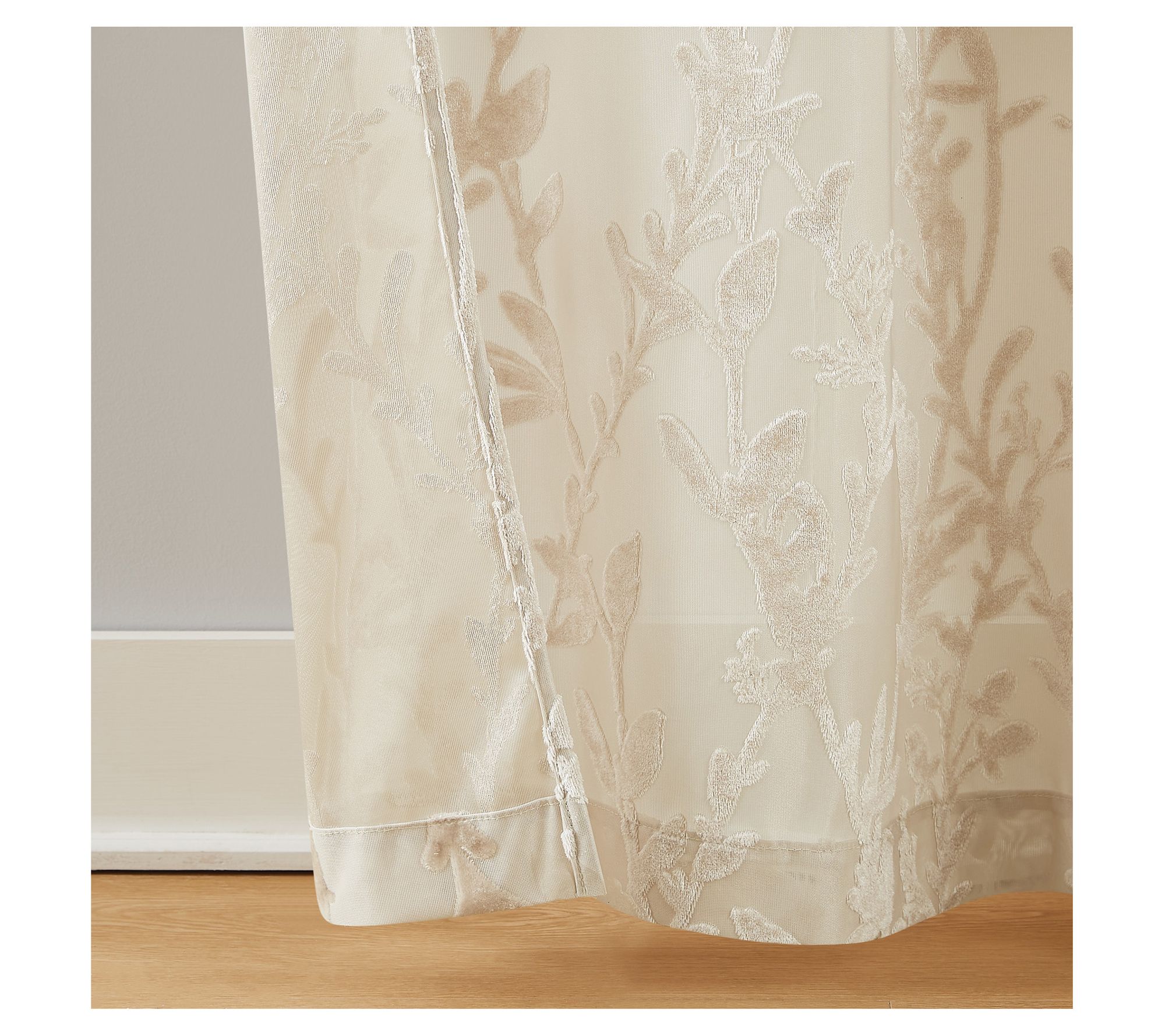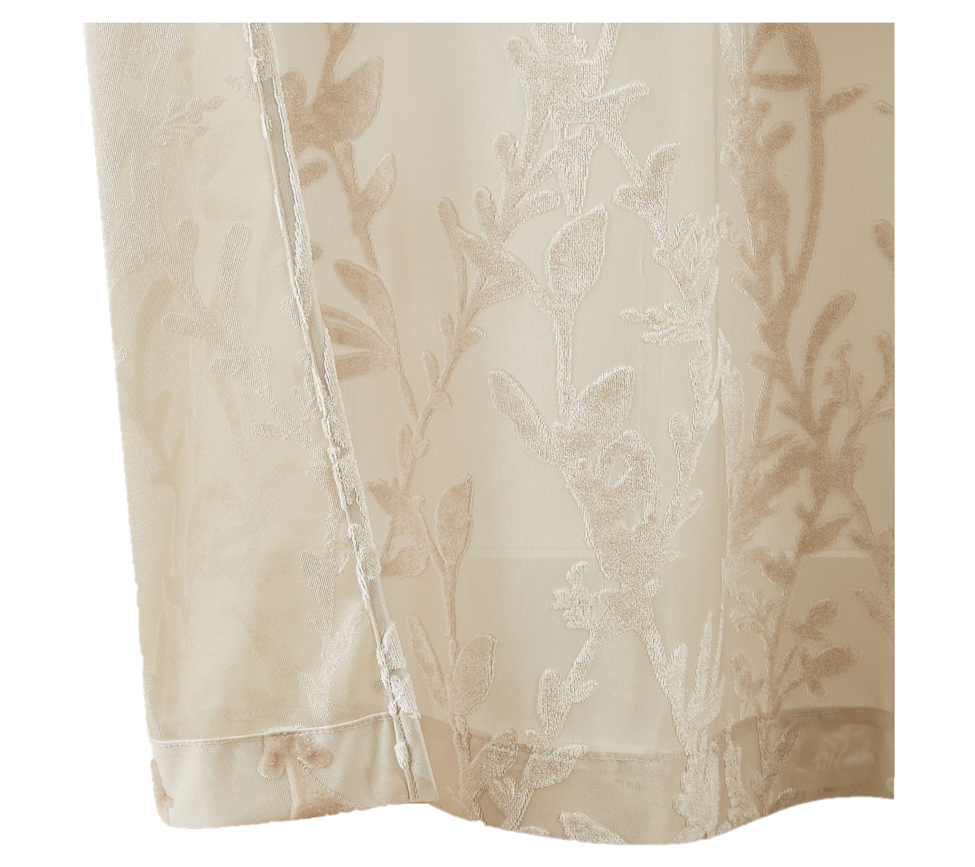 Transform your living space with these light-filtering sheer panels that boast a unique woven pattern with velvet long-stemmed floral vines in a champagne shade, adding a touch of elegance and texture to any room. From 5th Avenue Lux.