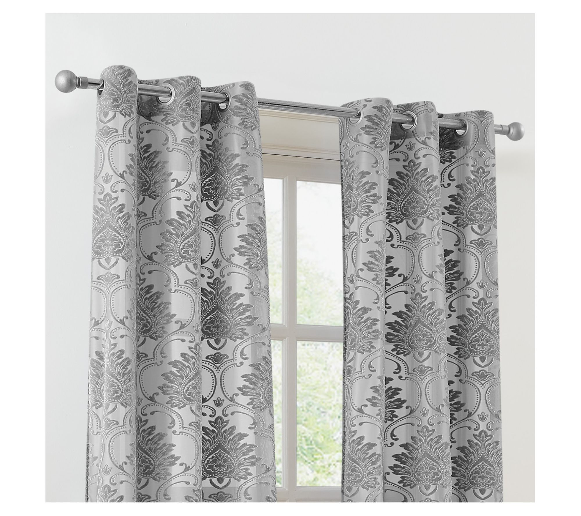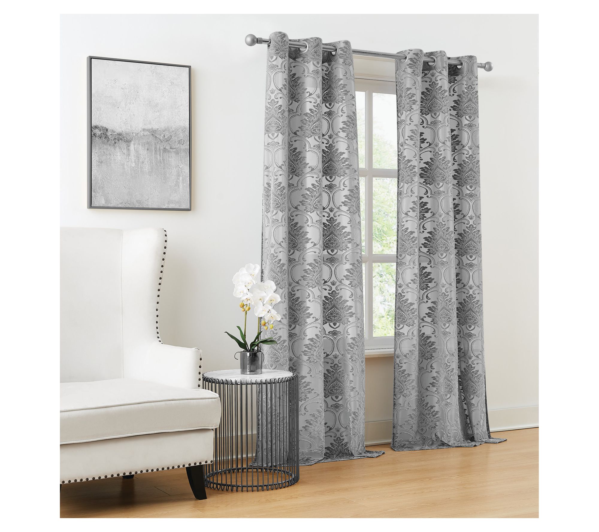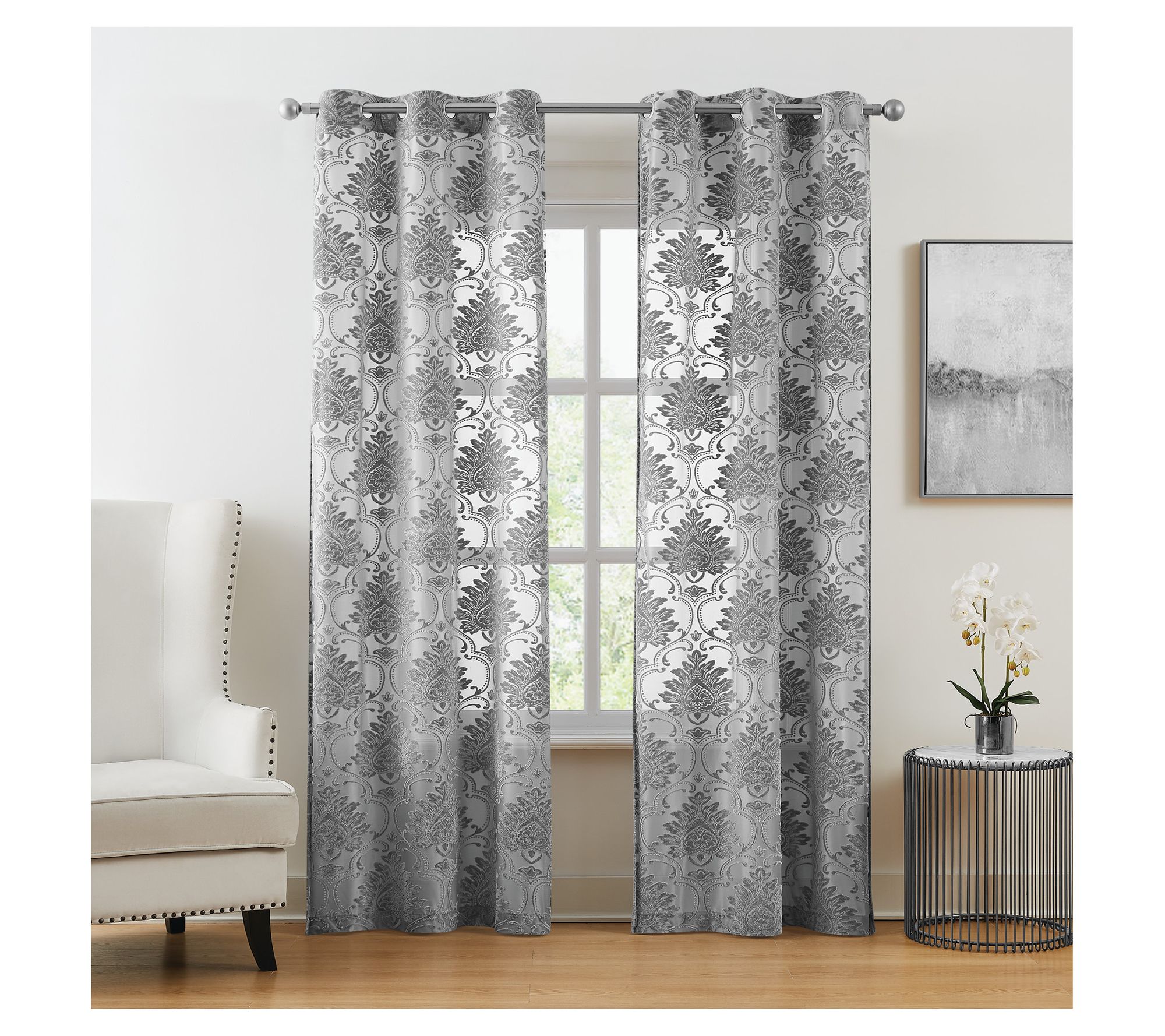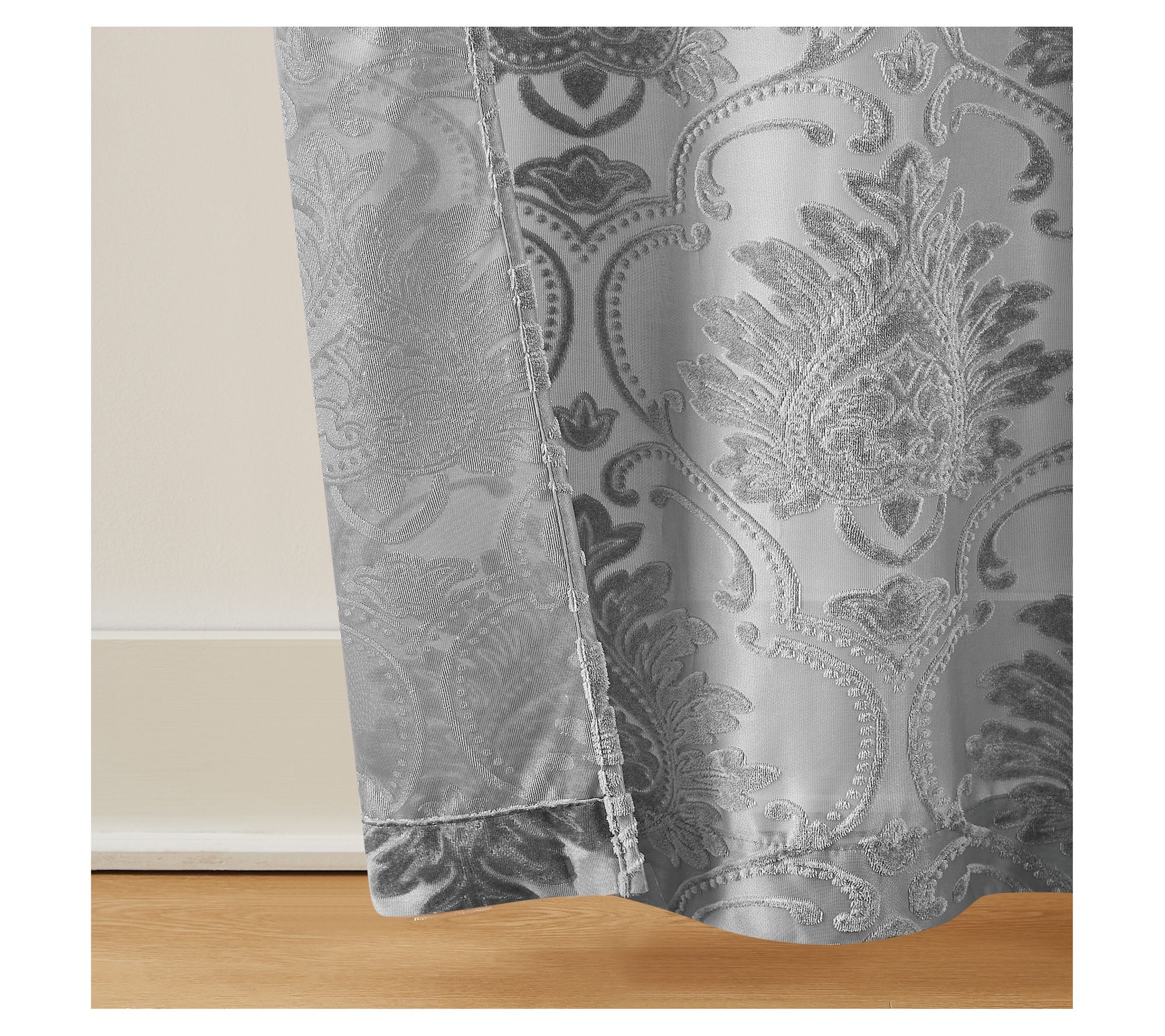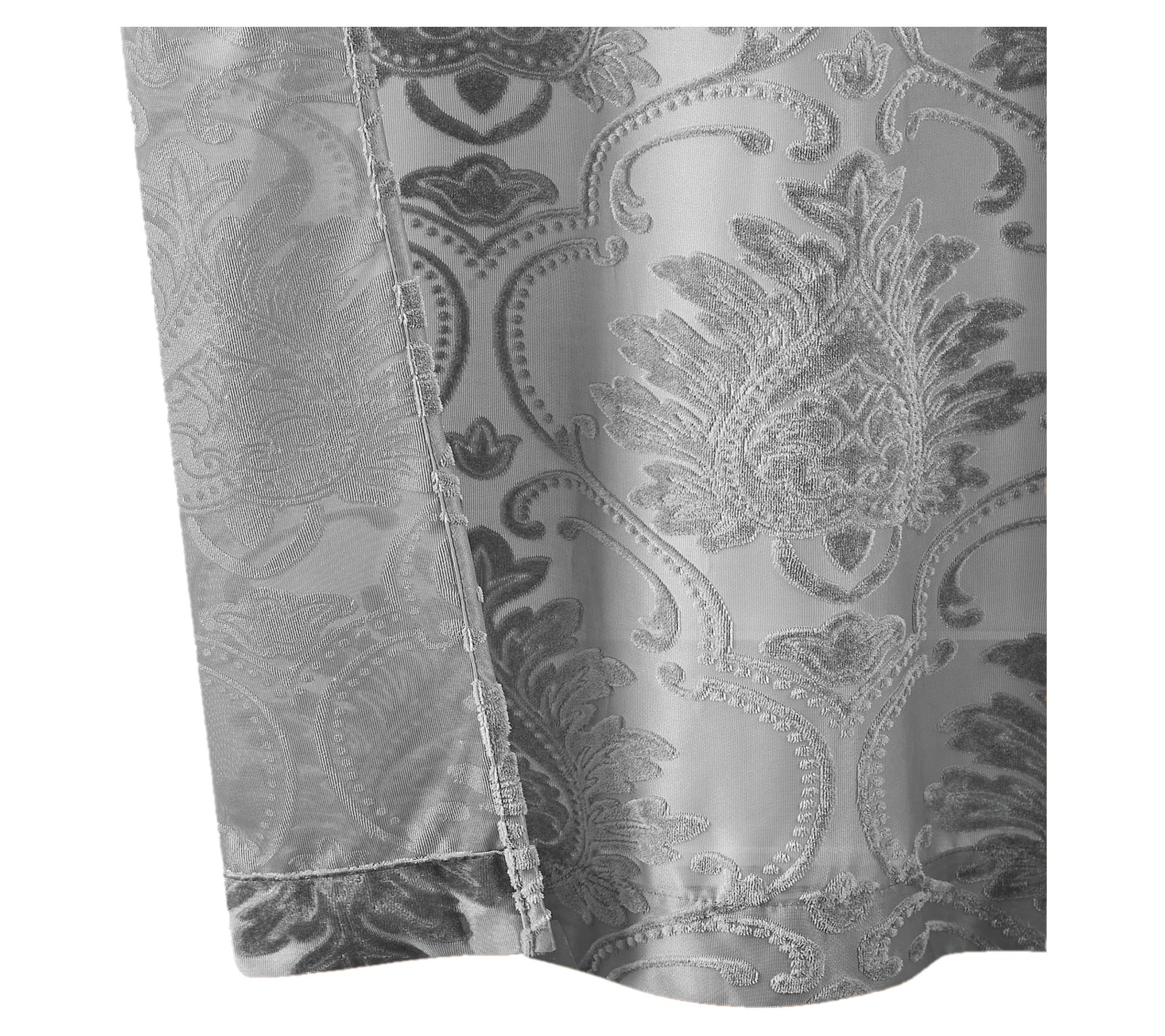 Transform your living space with this curtain panel set, a stunning addition that blends light filtering sheer fabric with a woven pattern. These panels feature a velvet textured formal scrolling floral pattern in silver and gray shades, offering a touch of elegance and sophistication to any room. From 5th Avenue Lux.