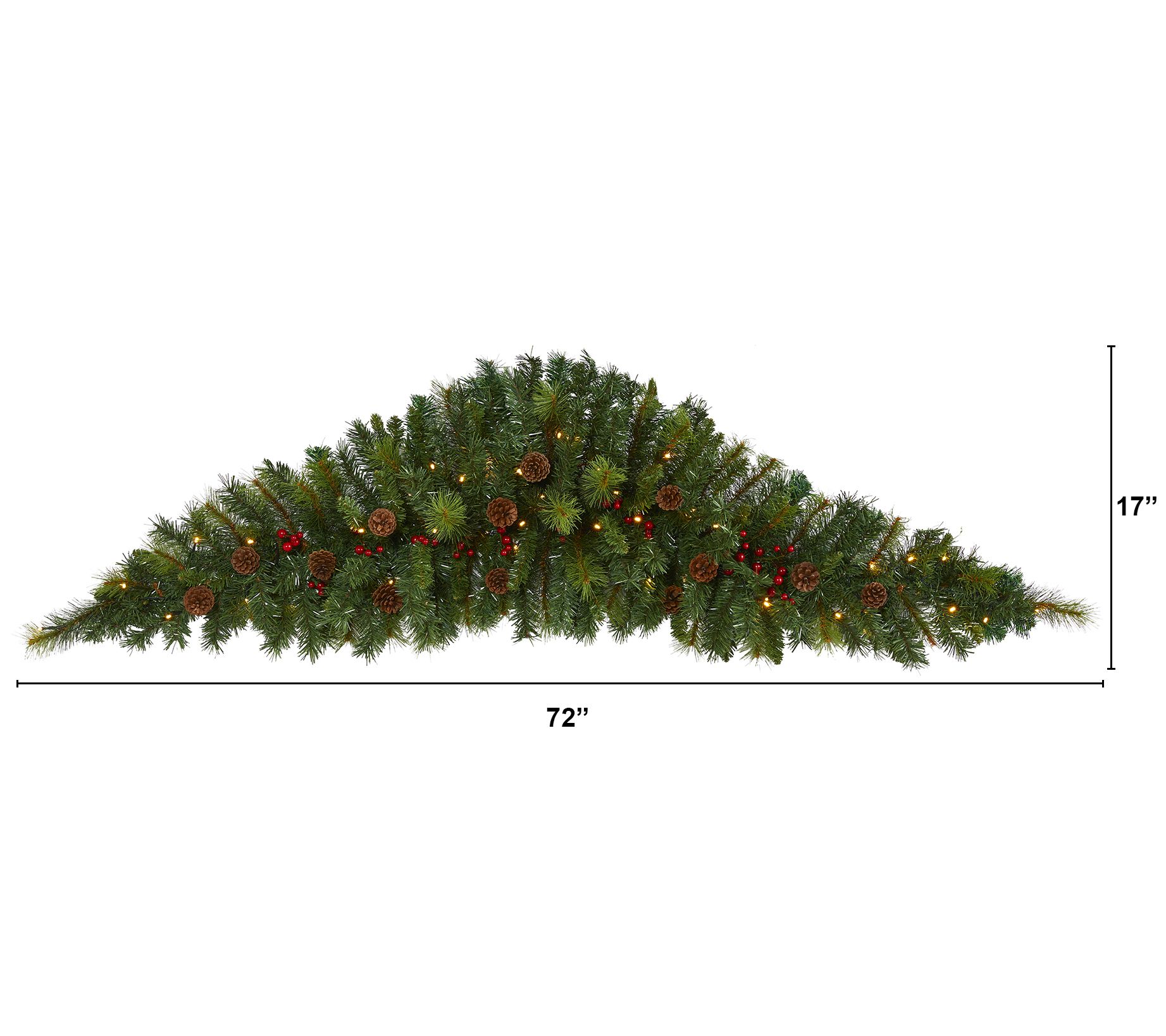 The perfect accent for your mantel, bare counter or stair banister, this handsome, 6ft long Christmas swag features 50 battery-operated clear LED lights nestled among realistic-looking foliage in a palette of seasonal evergreens. Faux pine cones and holly berries accent this swag for a gorgeous traditional holiday look. From Nearly Natural.