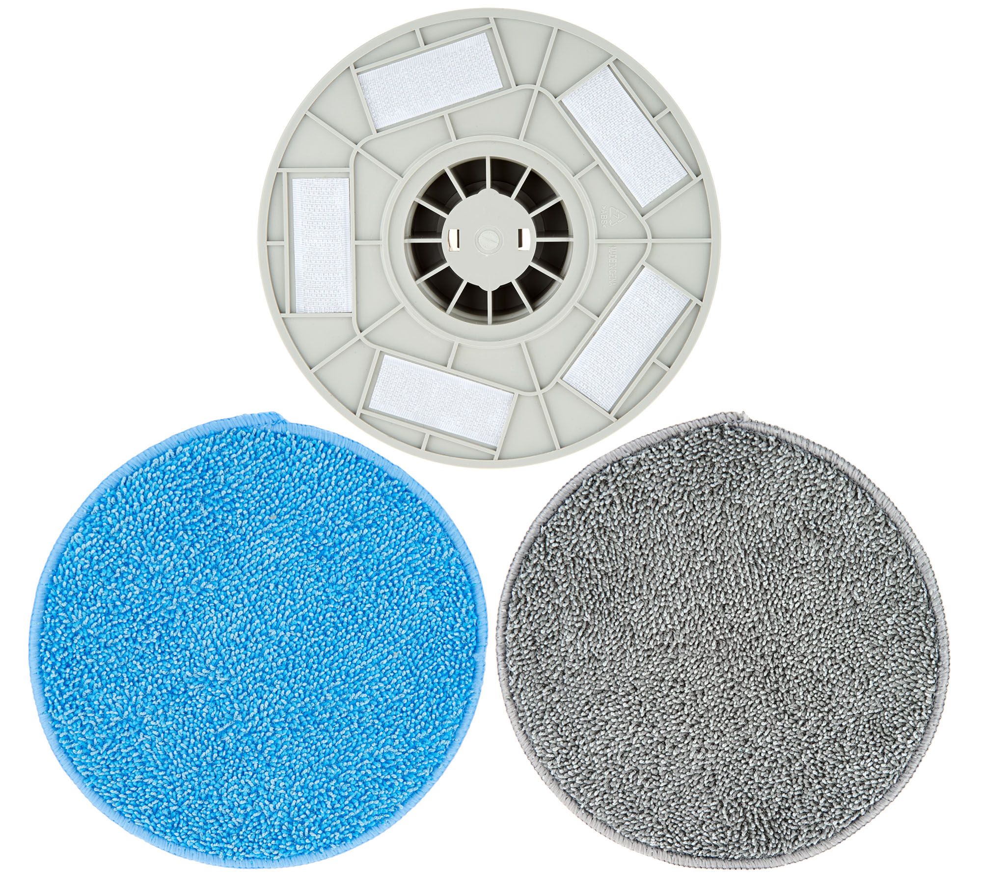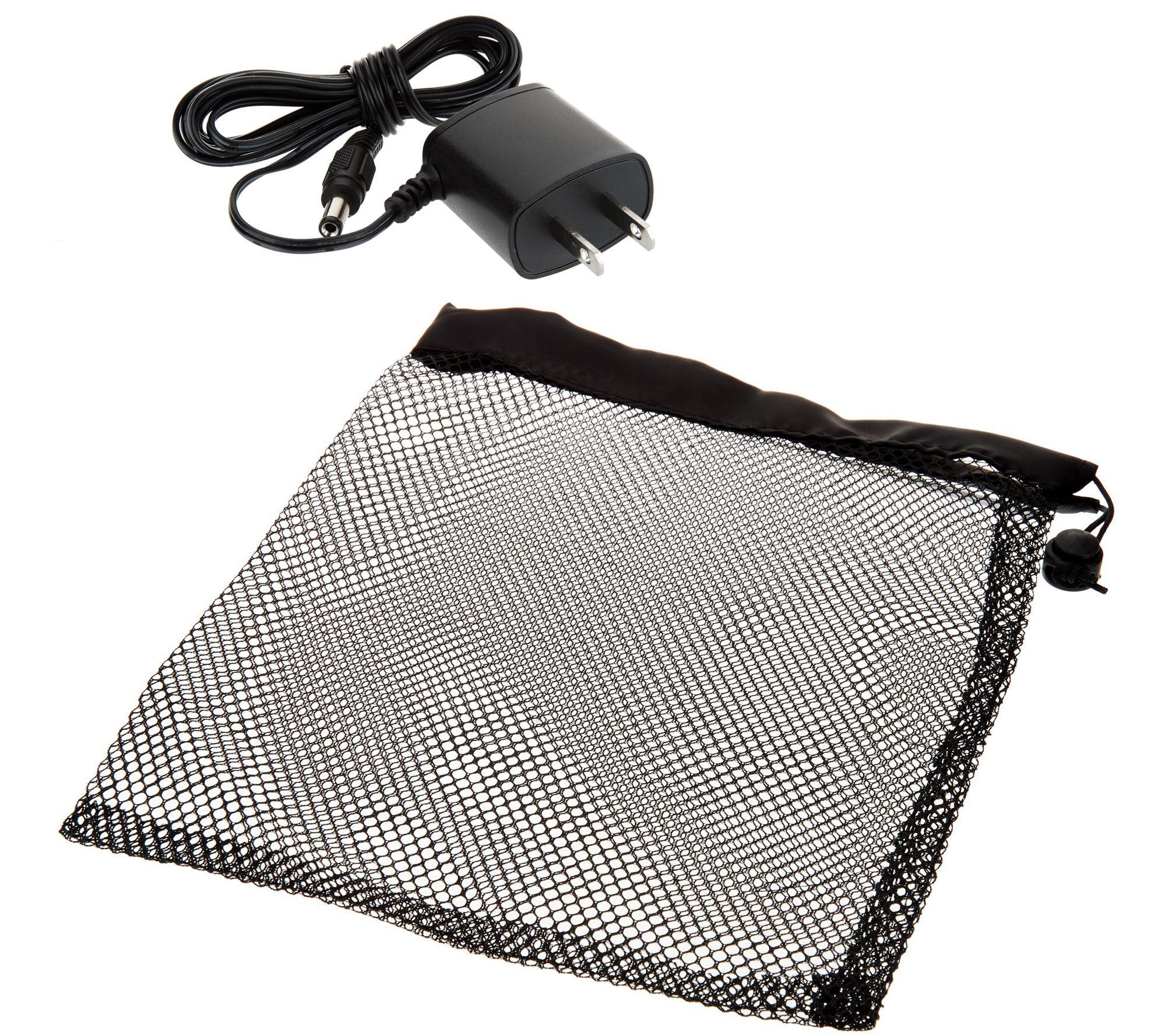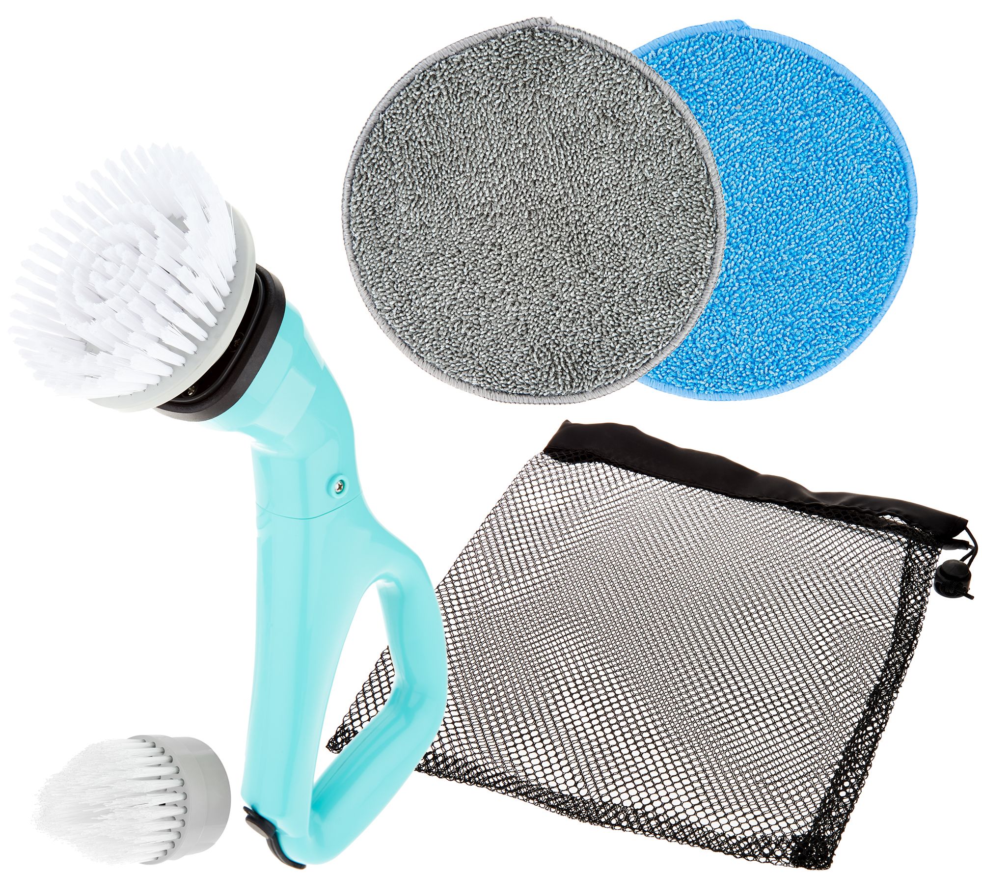 • Includes handheld power scrubber, rechargeable NiCad battery, battery charger, corner brush, large flat brush head, mounting disc, two microfiber pads, and mesh drawstring bag