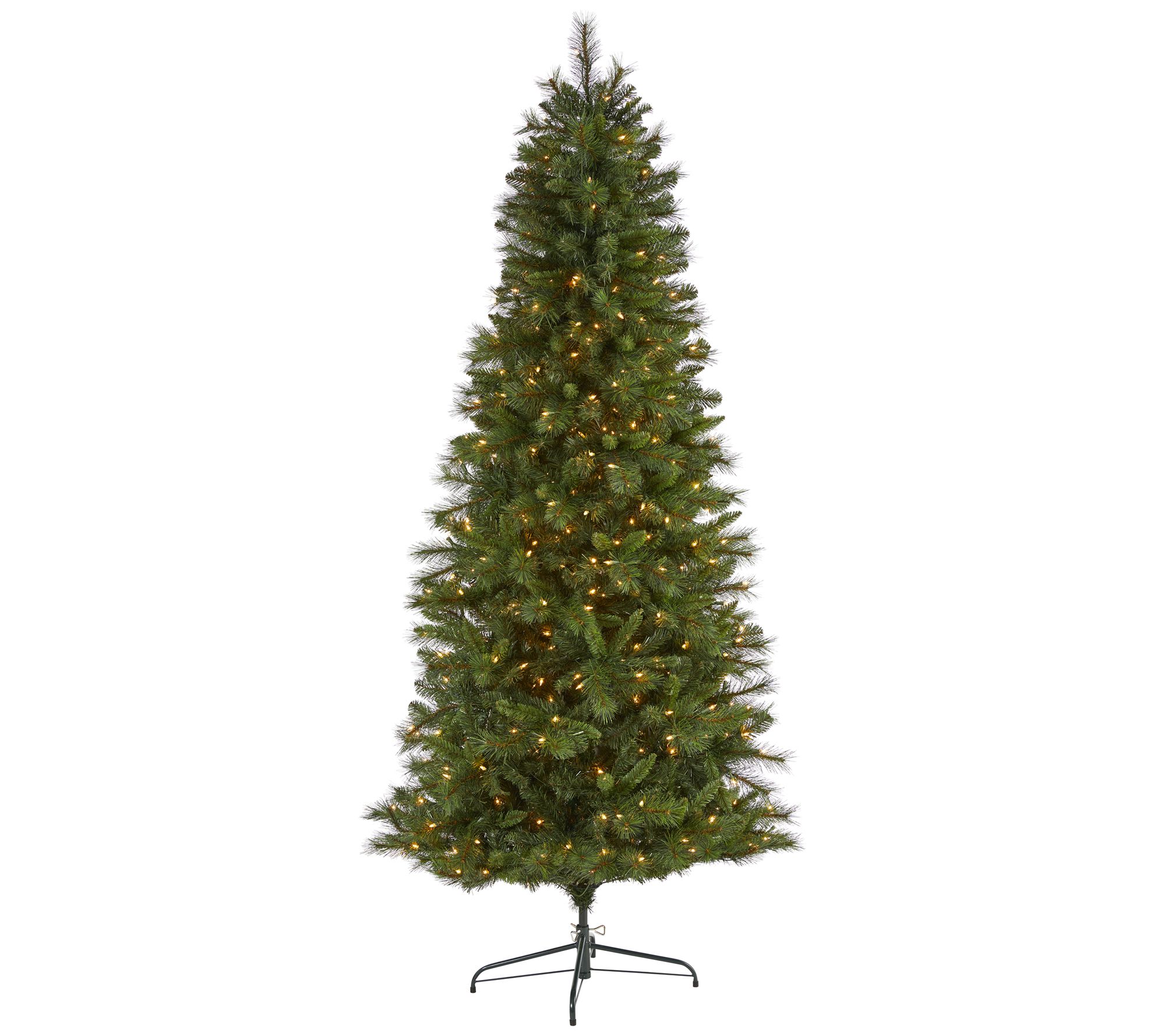 Fill your tiny space full of holiday spirit with this 7-1/2'H tall, slender-silhouette mountain pine artificial Christmas tree. Maintenance-free, this traditional-looking tree boasts 967 bendable branches of seasonal evergreens, perfect for accenting your own ornaments. Pre-strung with 450 clear LED lights and carefully stabilized on a metal stand, this impressive tree makes decorating a breeze. From Nearly Natural.