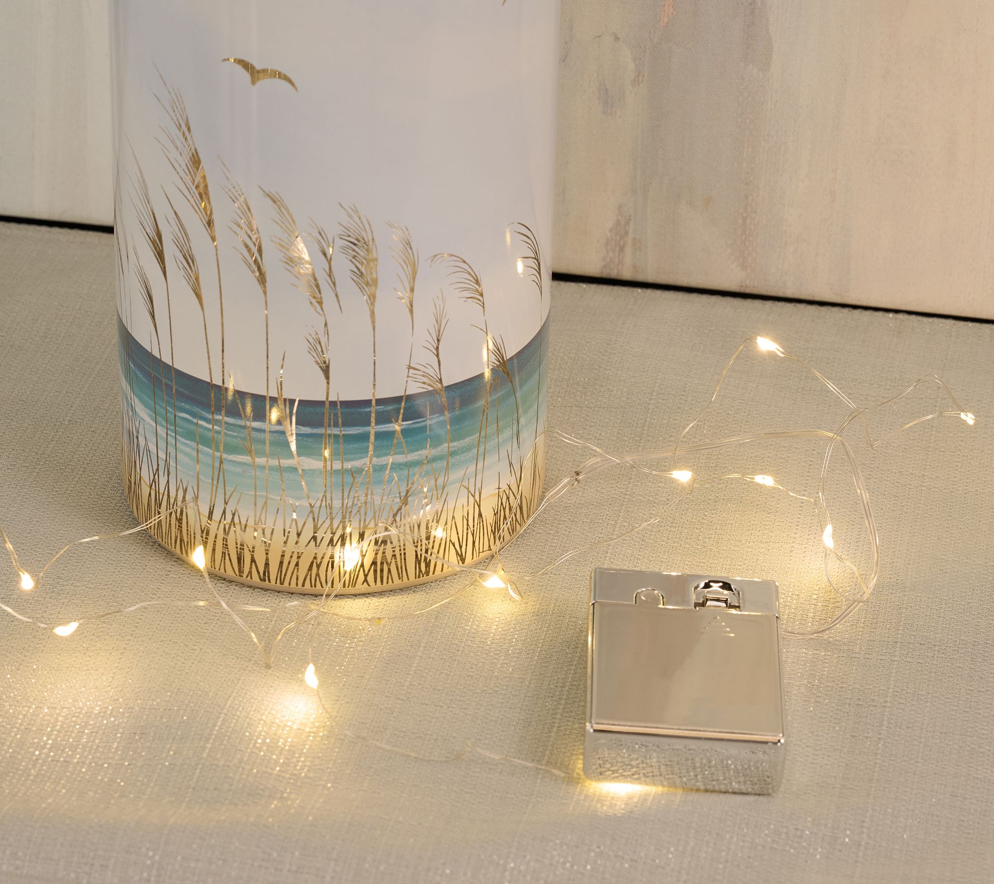 Transform your living space into a tranquil retreat with this glass hurricane, featuring a serene seaside scene with etched seagrass and seagulls. Soft twinkling or steady light reflects from the high-shine interior, creating a warm coastal glow for cozy evenings or peaceful mornings. From the Valerie Parr Hill Collection.