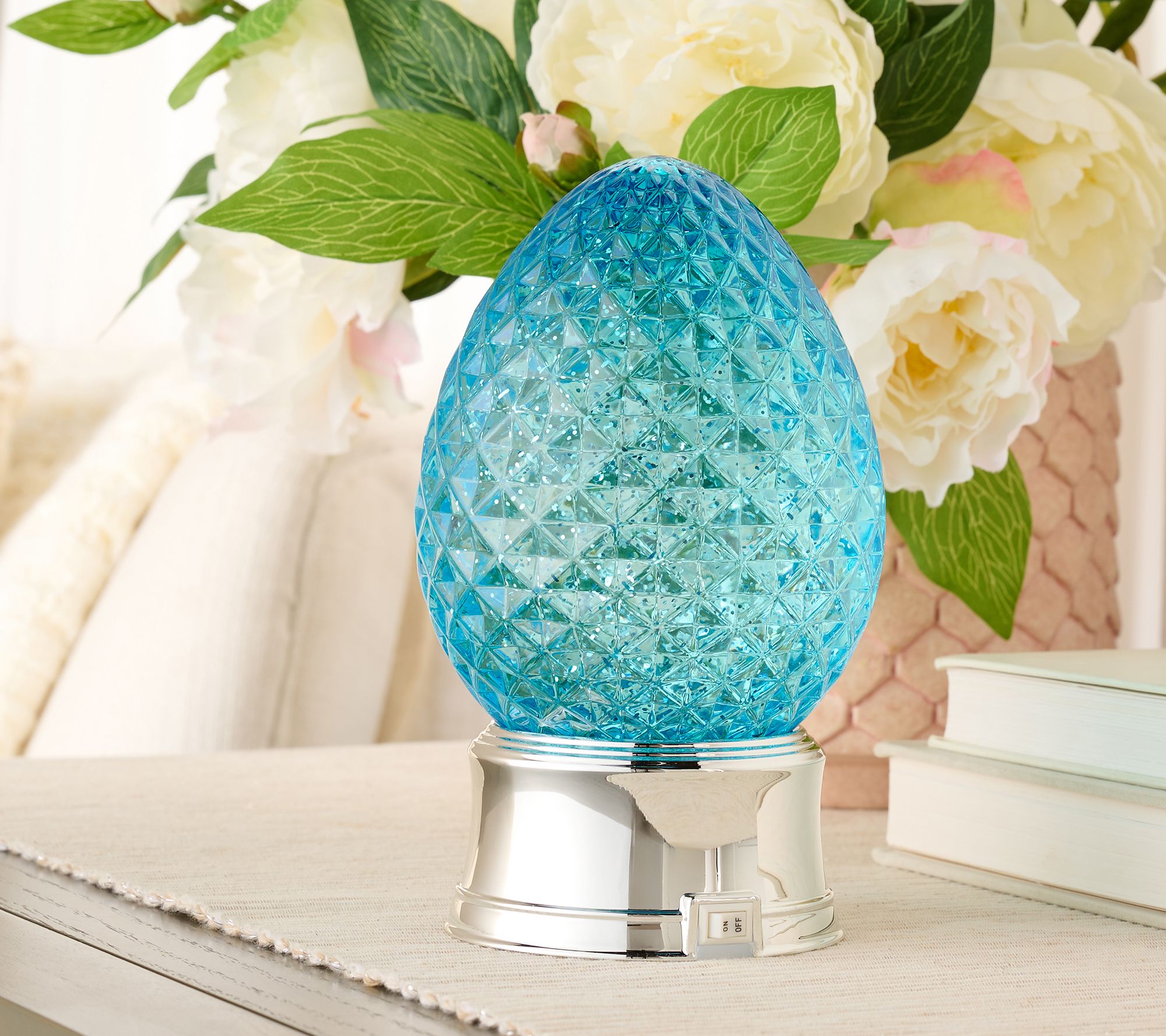 Bring an egg-citing accent to your holiday decor with this illuminated glitter egg, featuring shimmering swirls set off by internal LED lighting. The diamond-cut acrylic design and elegant silvertone base make it a striking centerpiece for a mantel, table, or bookshelf during spring celebrations. From the Valerie Parr Hill Collection.
