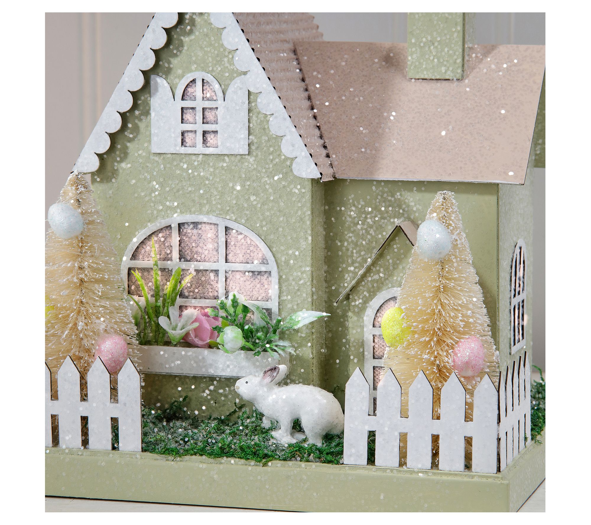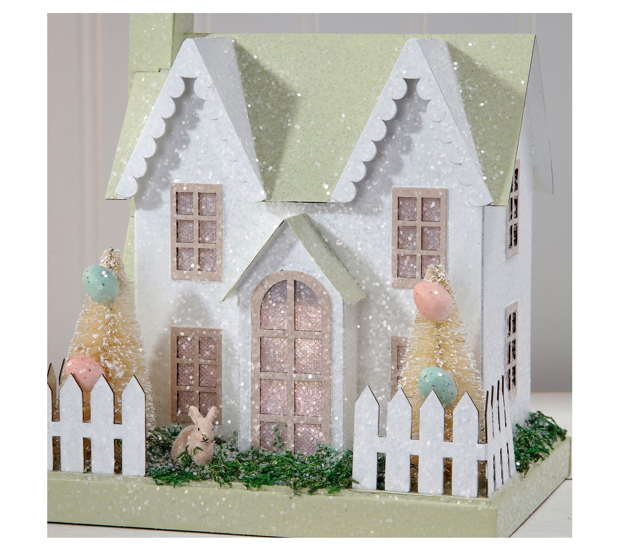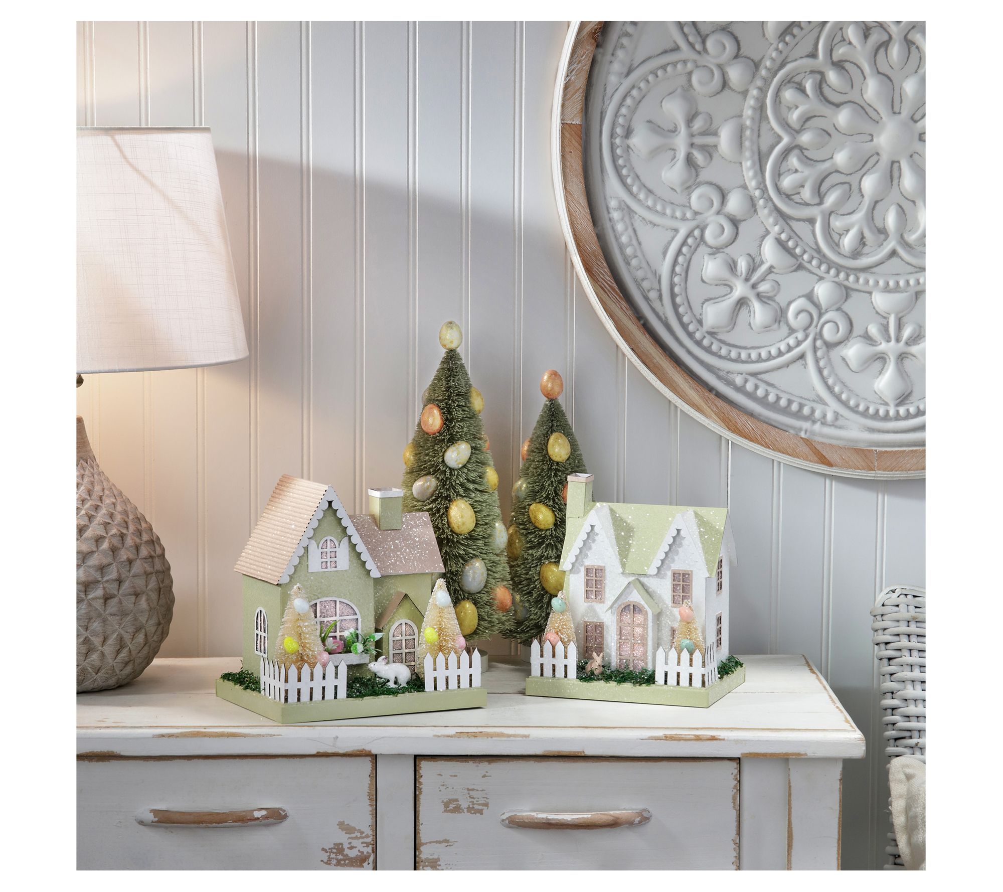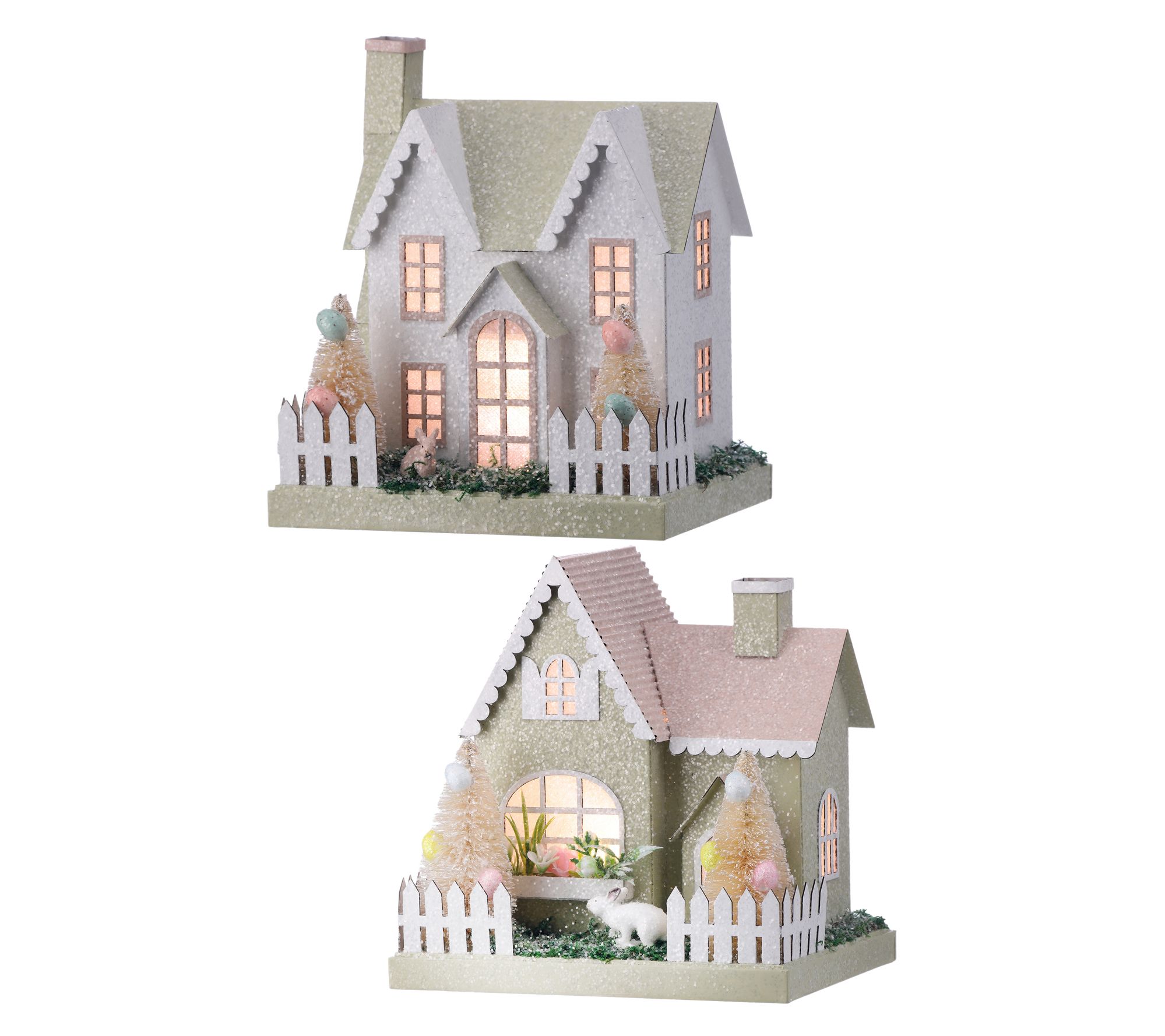 Brighten up your spring decor with this delightful set of LED cardboard houses. Perfect for your mantel or tabletop, each house glows warmly, exuding a cozy, inviting ambiance. Pretty Easter trees and a sugared finish add a charming touch to your seasonal display. From the Valerie Parr Hill Collection.