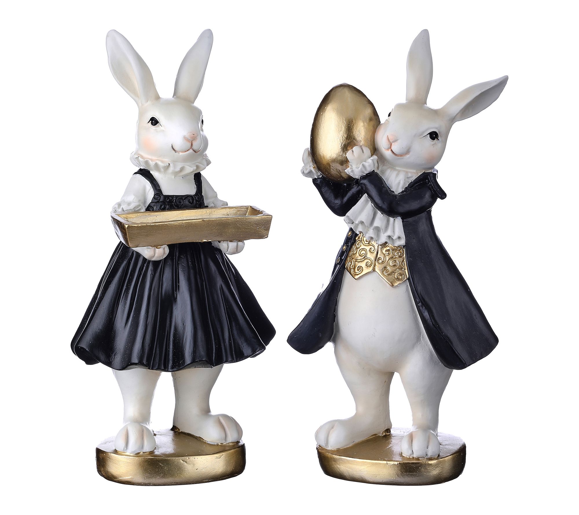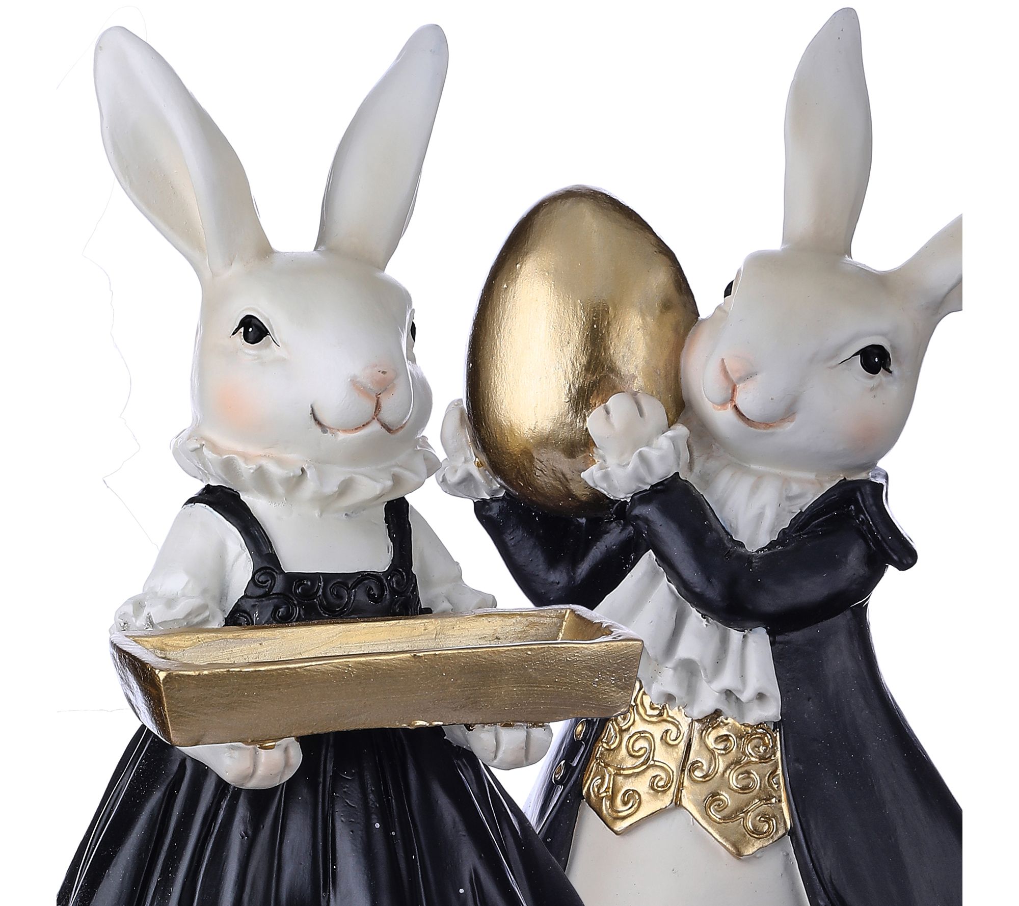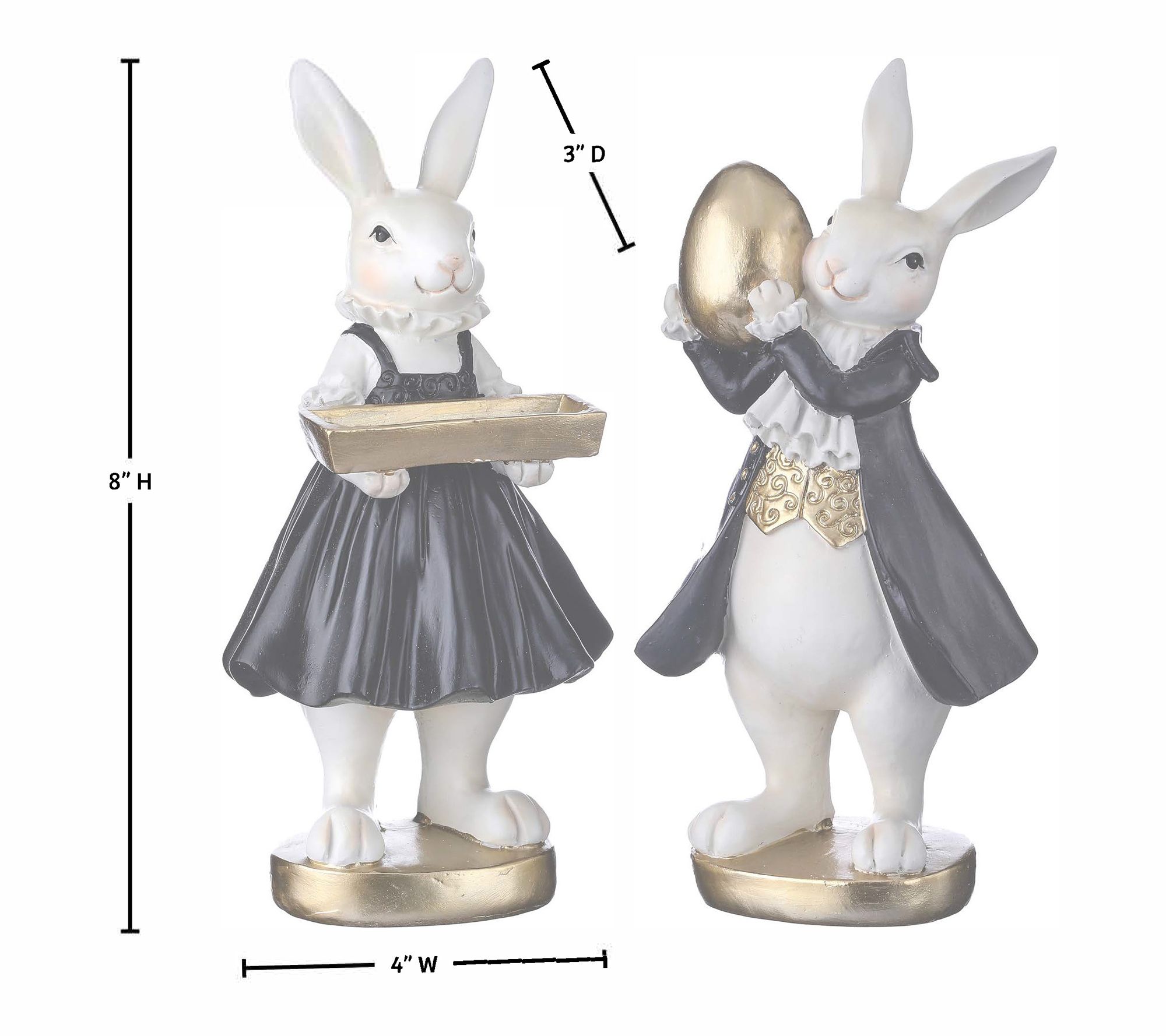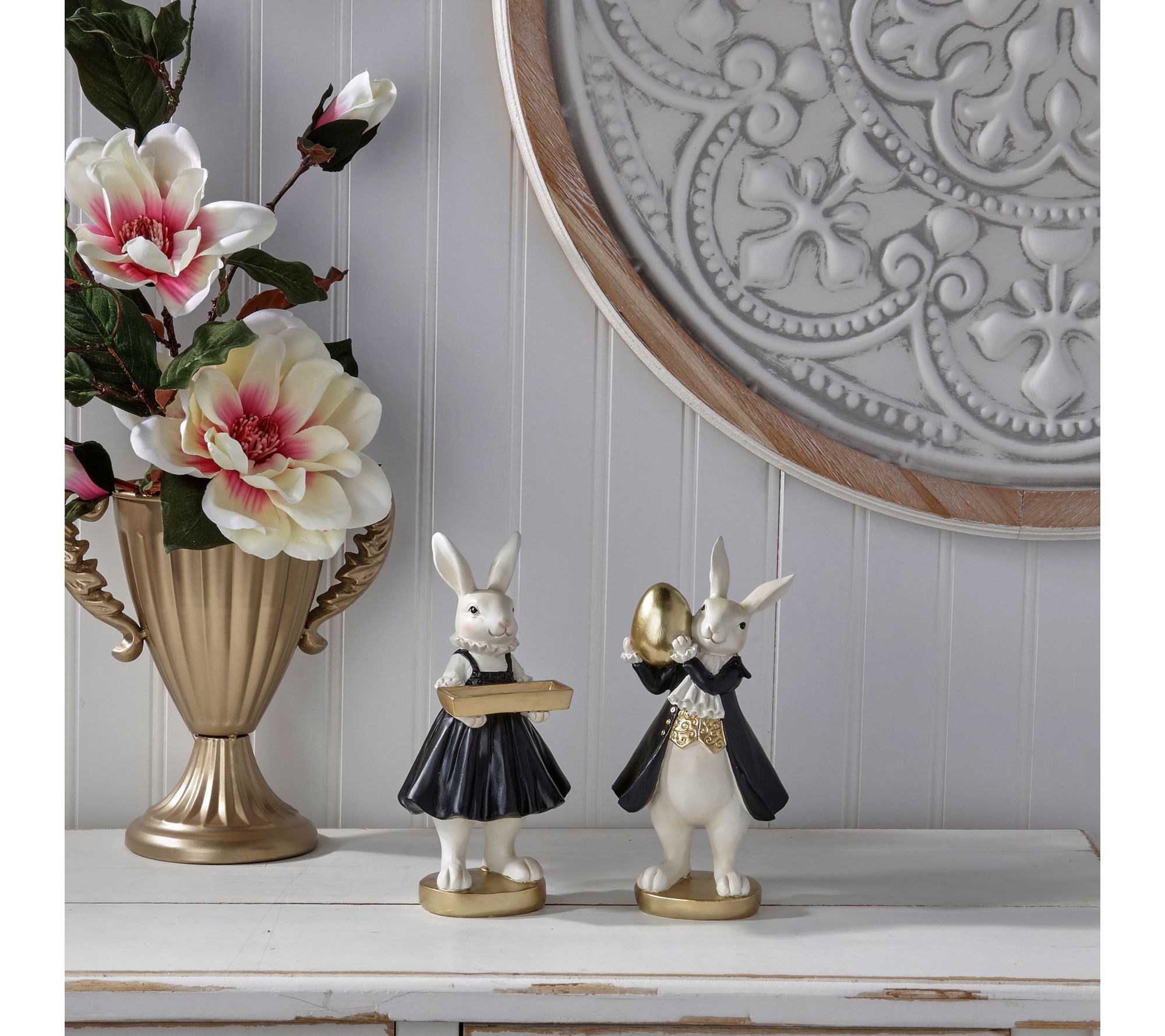 Grace your home with these elegantly dressed resin bunnies, each bringing a touch of whimsy and sophistication to your Easter decor. One bunny cradles a golden egg while the other presents a goldtone tray, both poised on matching goldtone bases with delightfully detailed, painted faces. Perfect for a springtime centerpiece or to enliven your mantel with seasonal charm. From the Valerie Parr Hill Collection.